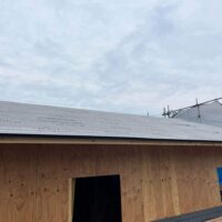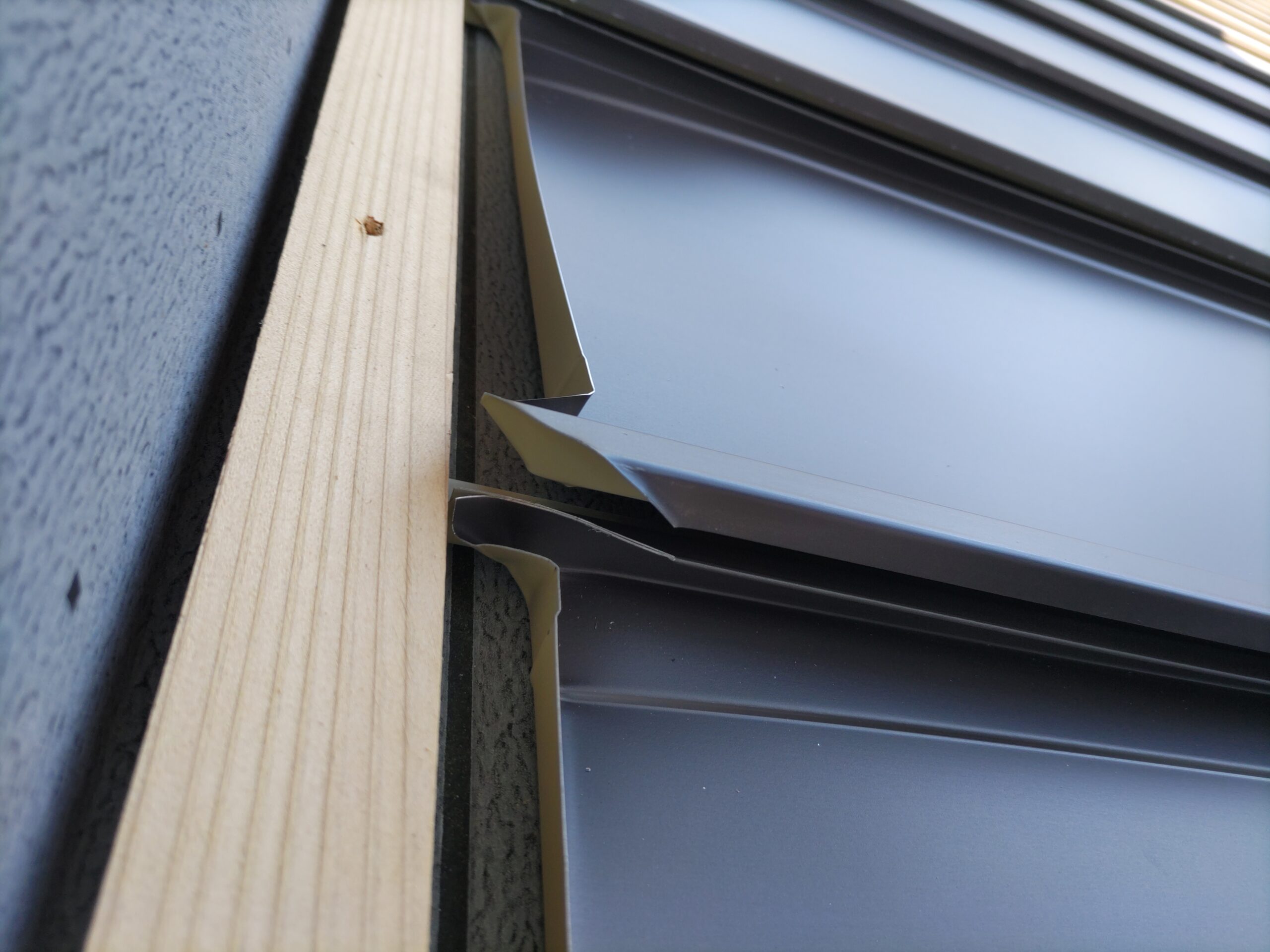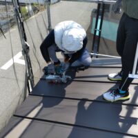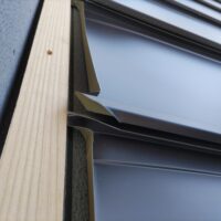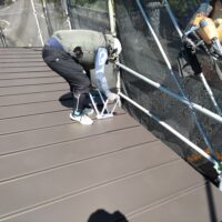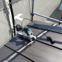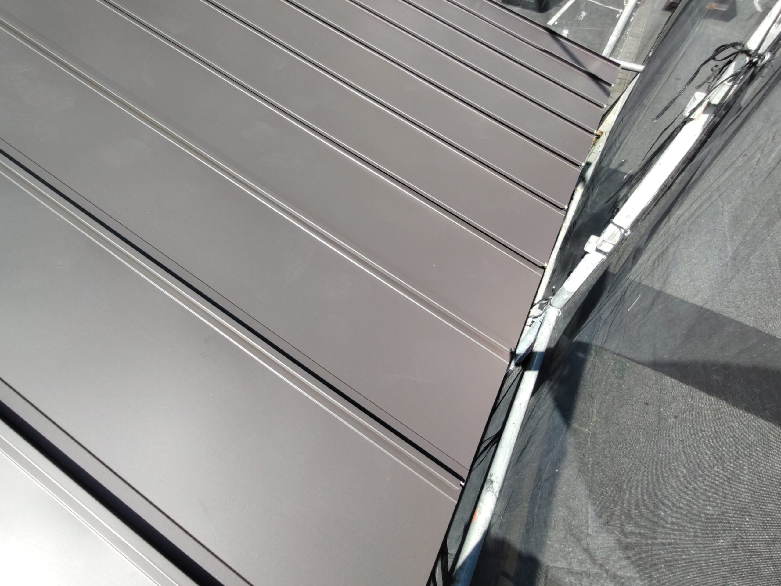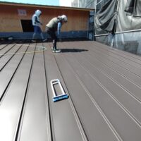 灼熱の鉄板の上で屋根ガルバリウム鋼板葺き工事が行われています。朝夕はまだまだ涼しいものの、もはやこの時期から空調服は必須になってきます。今回は普段ガルバリウム鋼板葺きで使用される『勘合式立平葺き』屋根ではなく『立ハゼ葺き』方式が採用されています。勘合式であればはめ込んでいくだけで作業は終了ですが、立ハゼは並べて置いた後接合部を加締めて行く作業が必要です。写真に写っている道具を使用して順番に加締めて行きますが、一度にできるのは道具の幅のみ。
