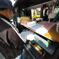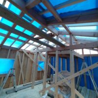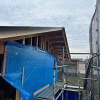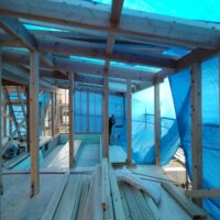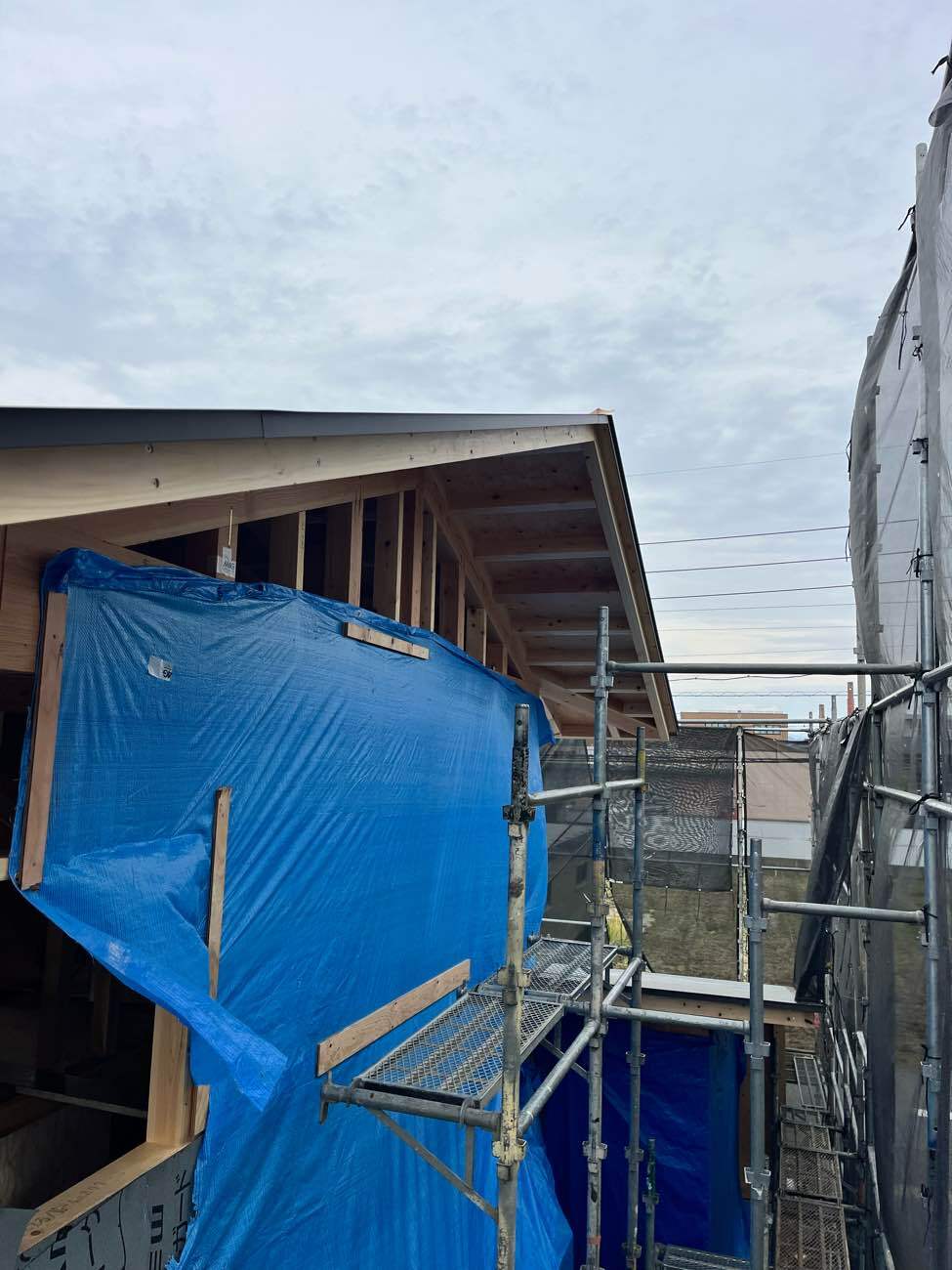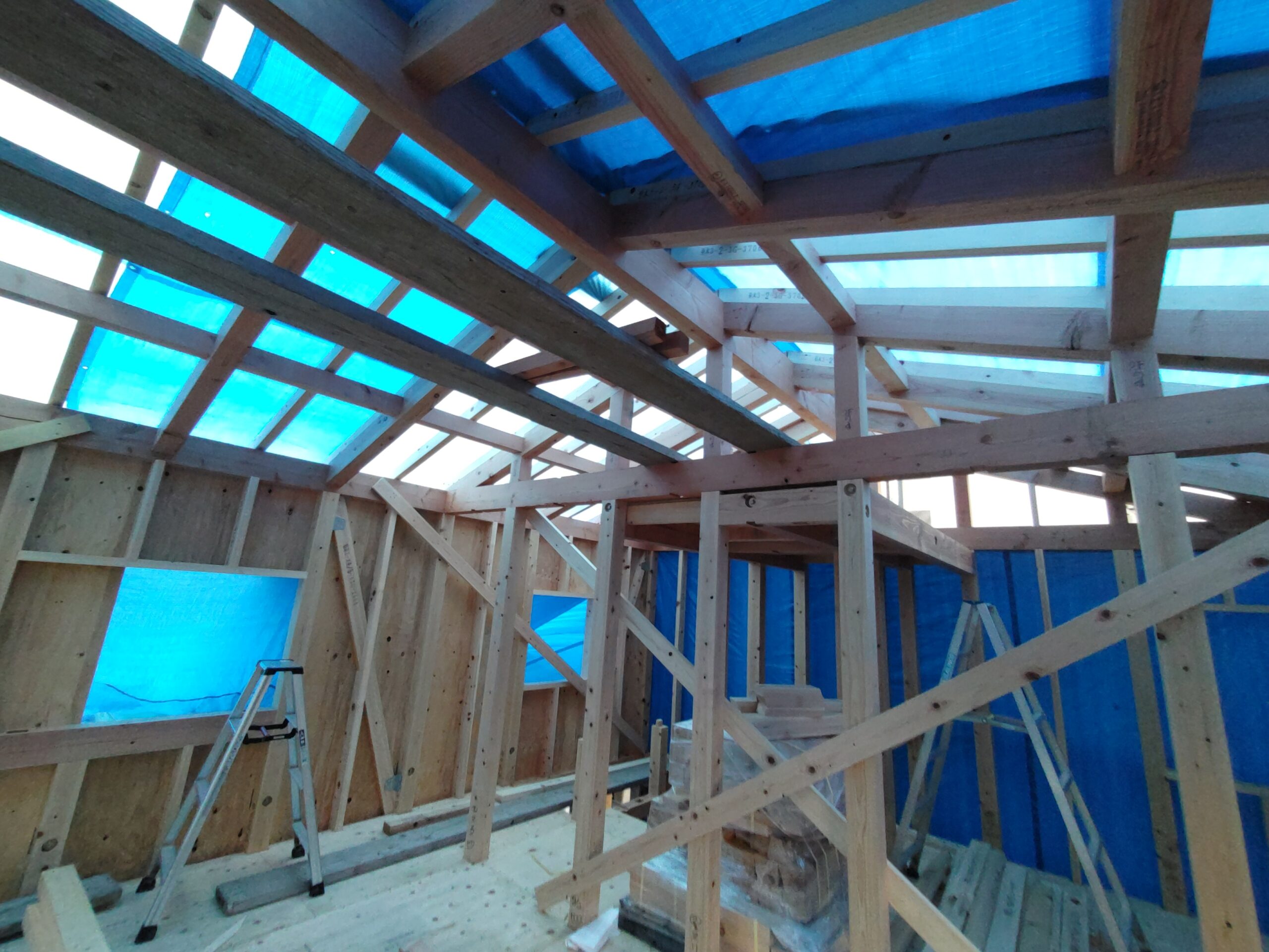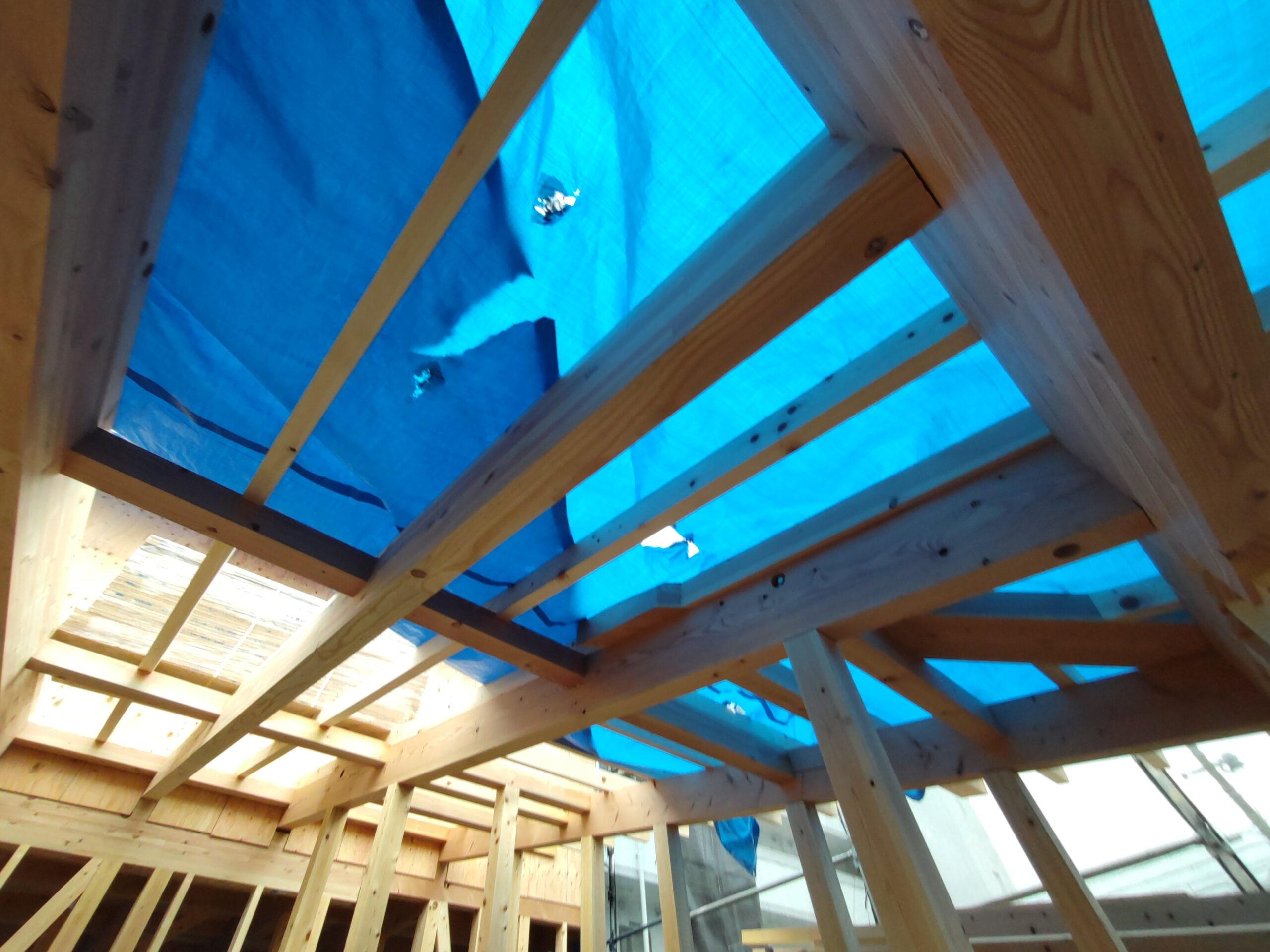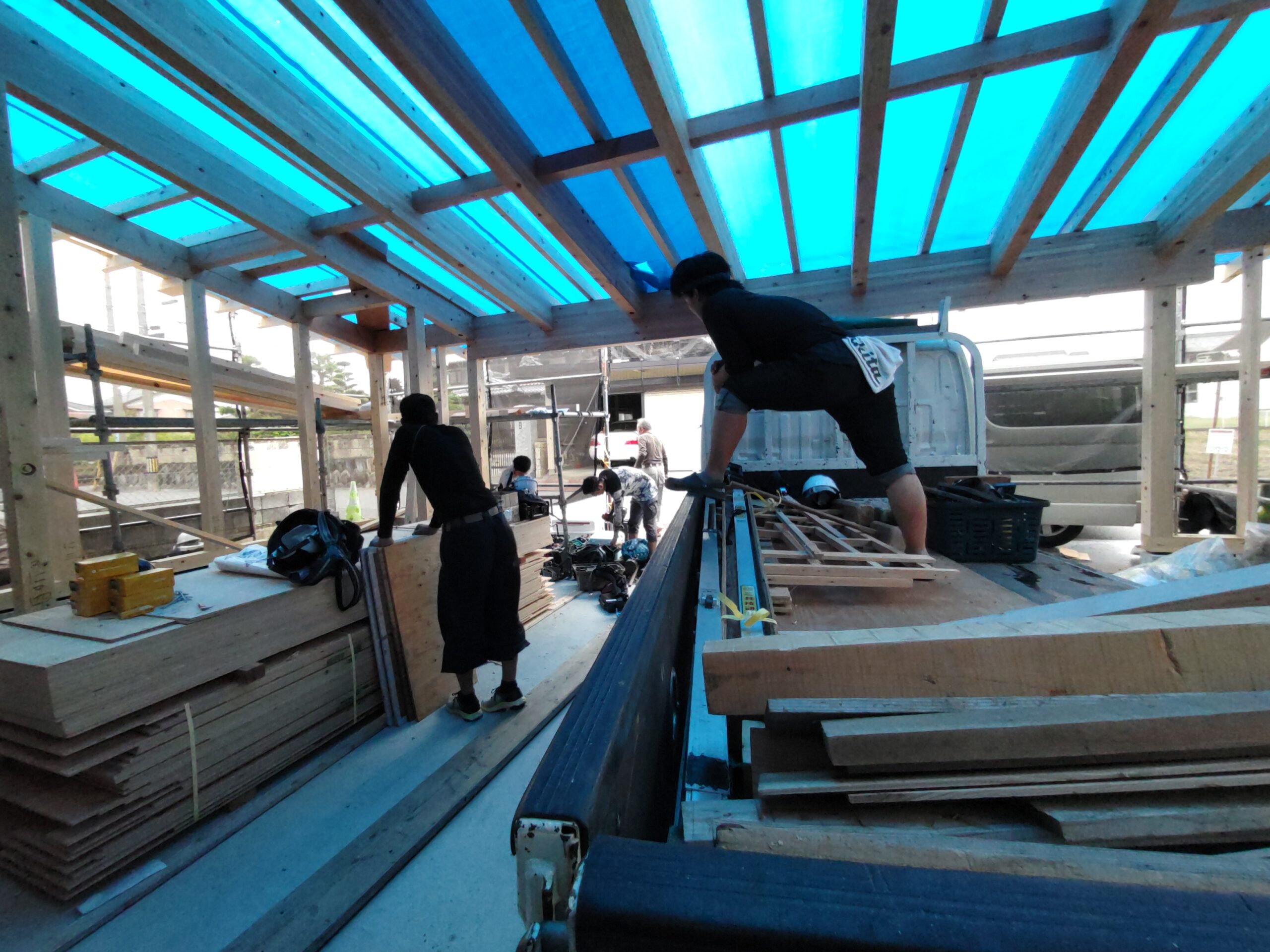 加工も複雑なため屋根合板は明日以降に持ち越しです。最終的にはブルーシートで外周をガッチリとガードして本日の作業は終了です。