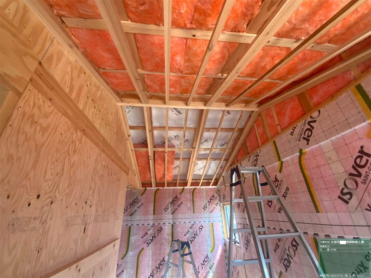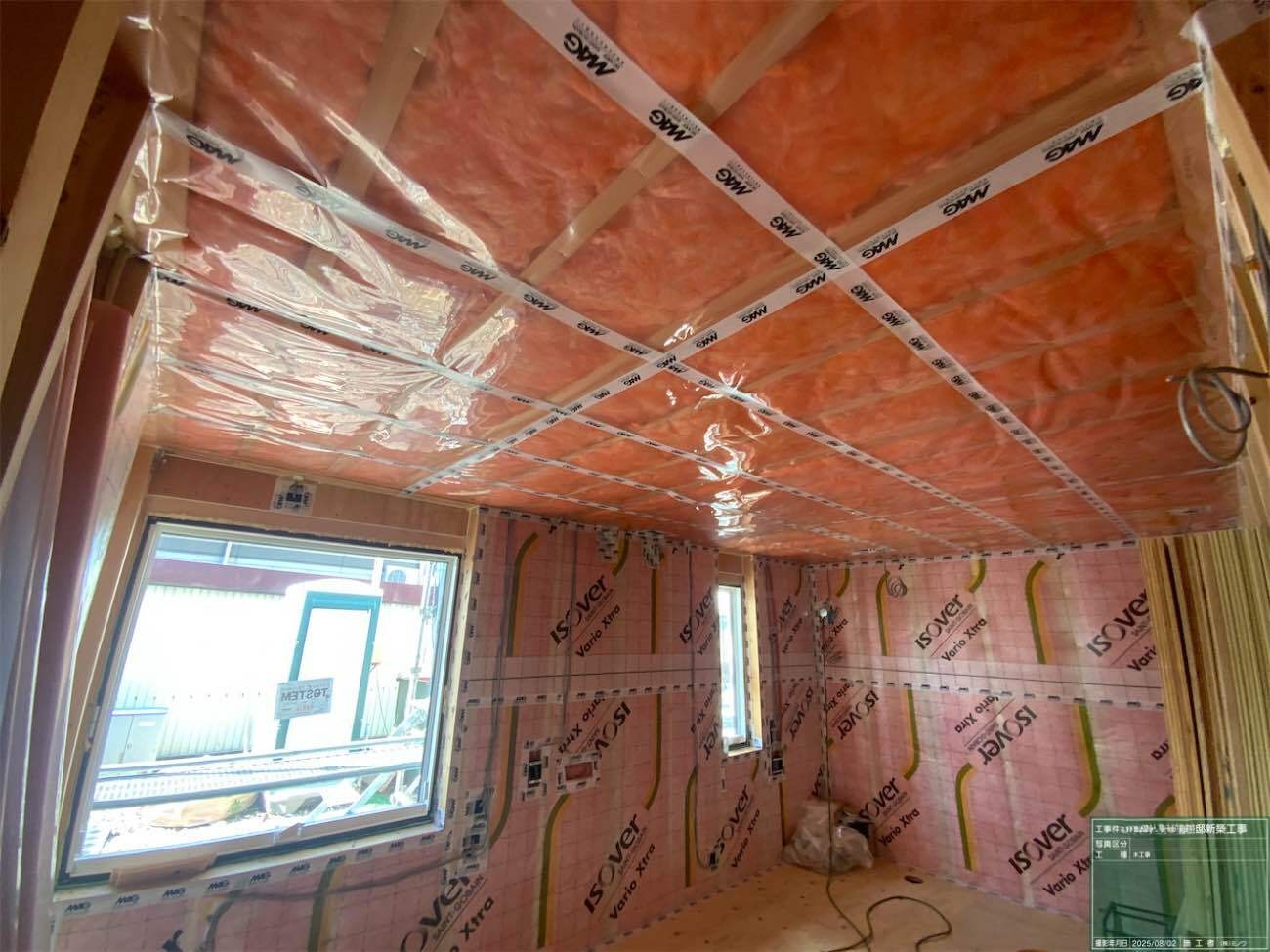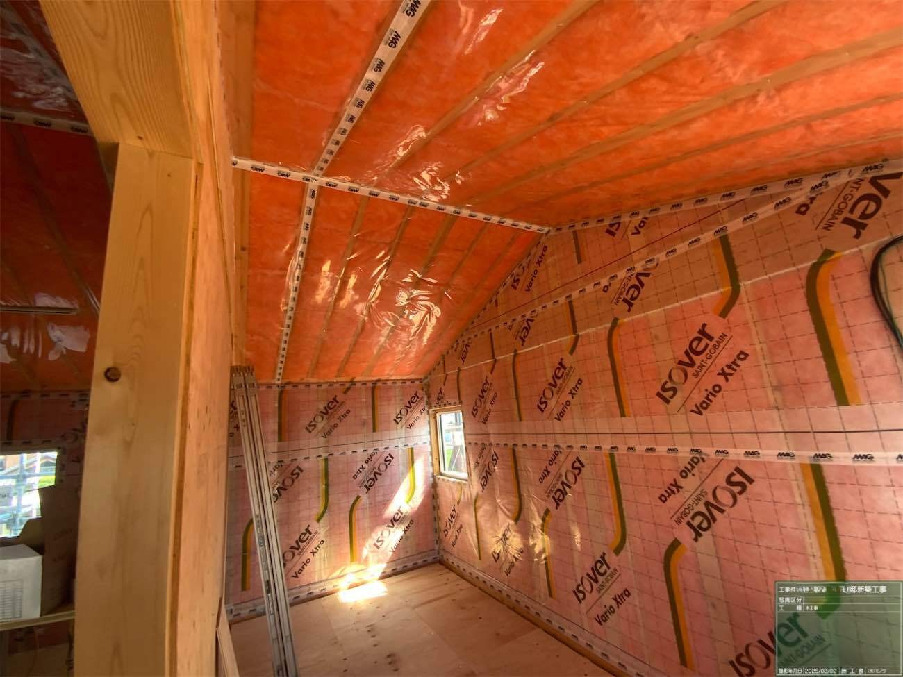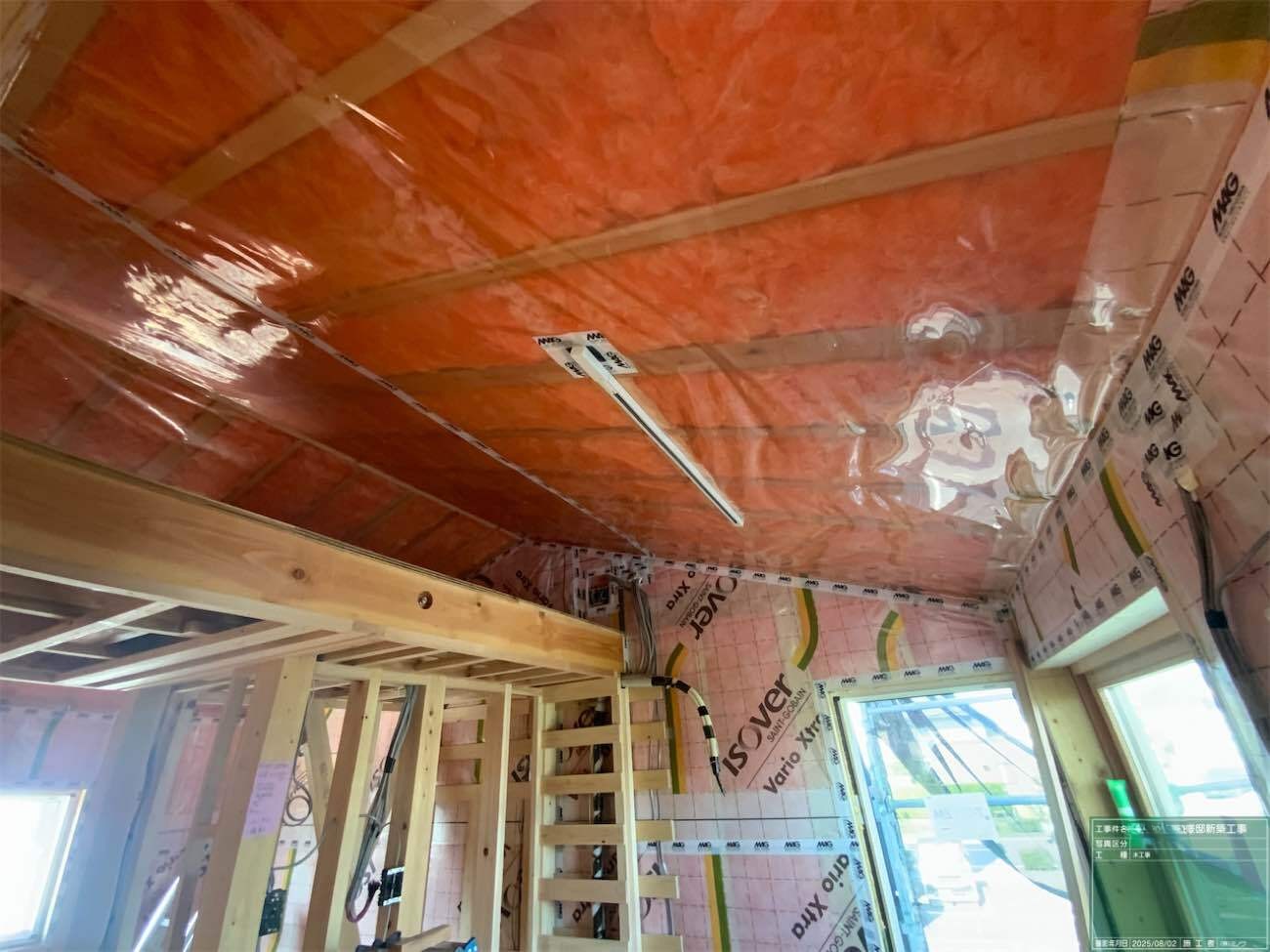 天井の断熱材敷設、気密シート張りも終わり、その間隙を縫ってシート内を通る電気配線も行われました。連日この○○暑い猛暑の中、直上方向の断熱ができたという事は現場自体が『ある程度』作業しやすくなっていると思われます。