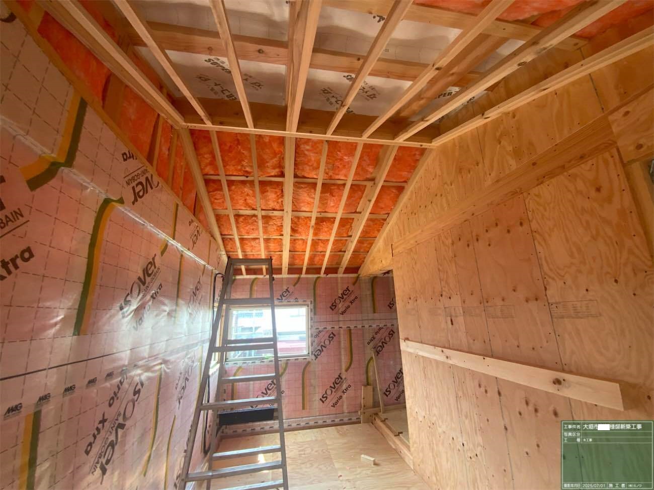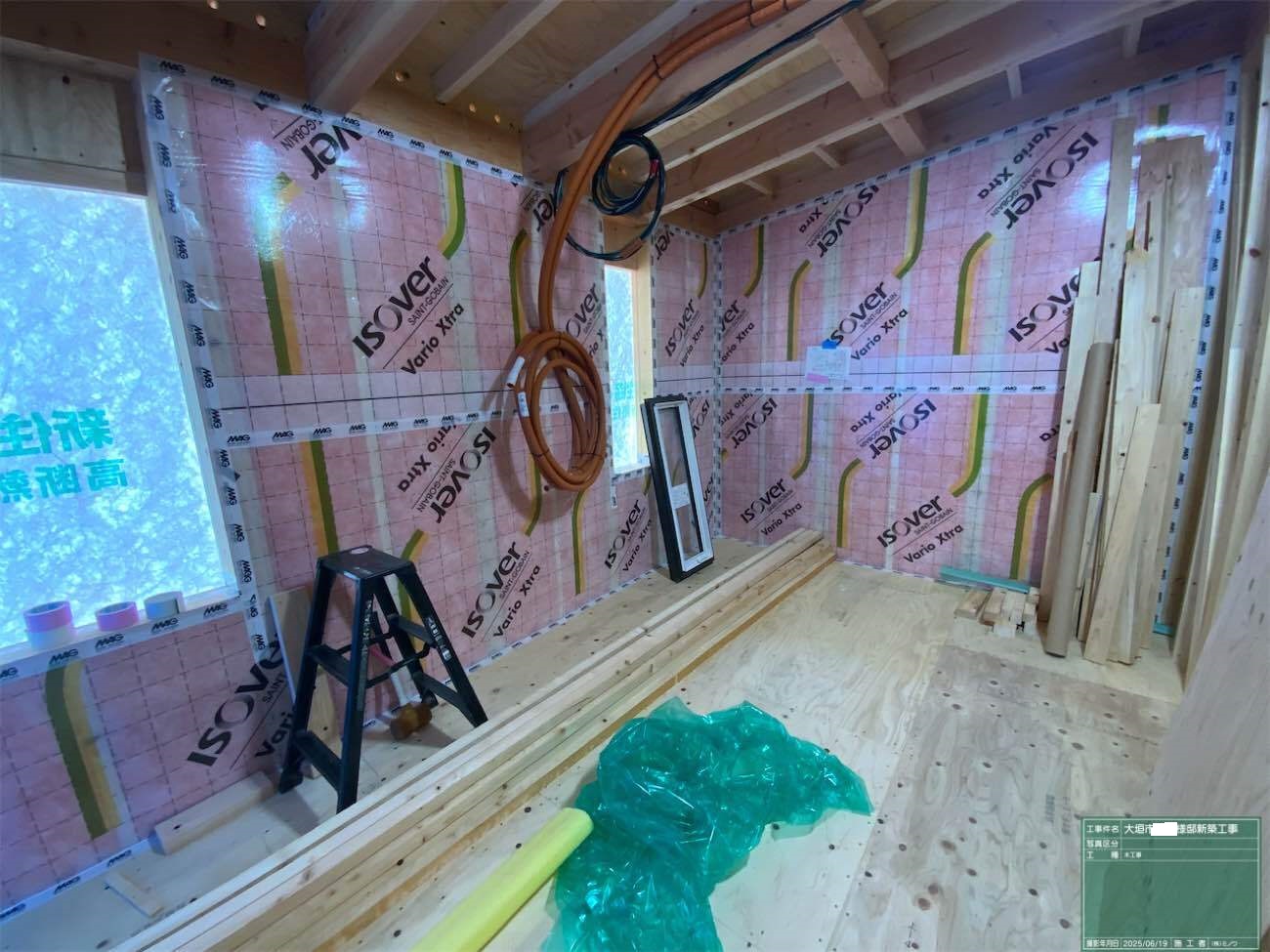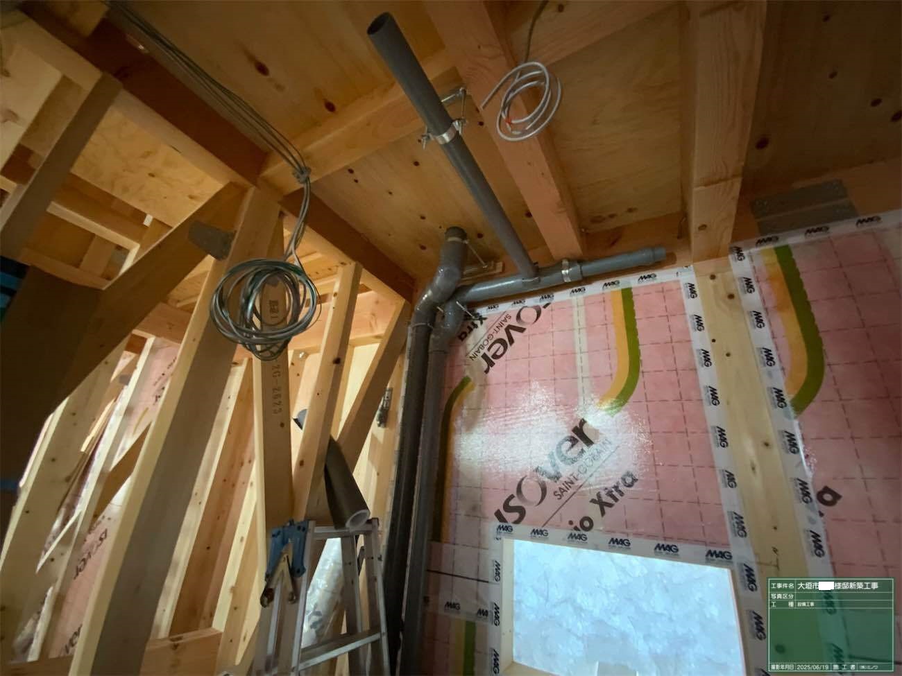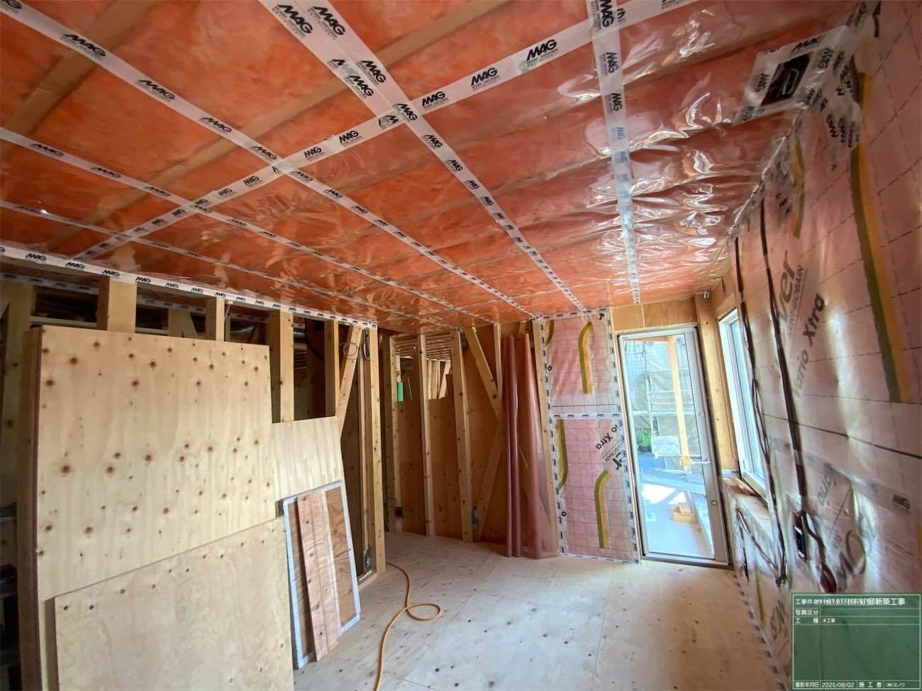 天井の断熱材敷設、気密シート張りも終わり、その間隙を縫ってシート内を通る電気配線も行われました。連日この○○暑い猛暑の中、直上方向の断熱ができたという事は現場自体が『ある程度』作業しやすくなっていると思われます。