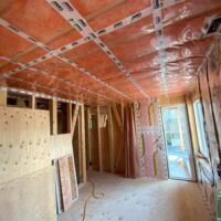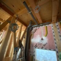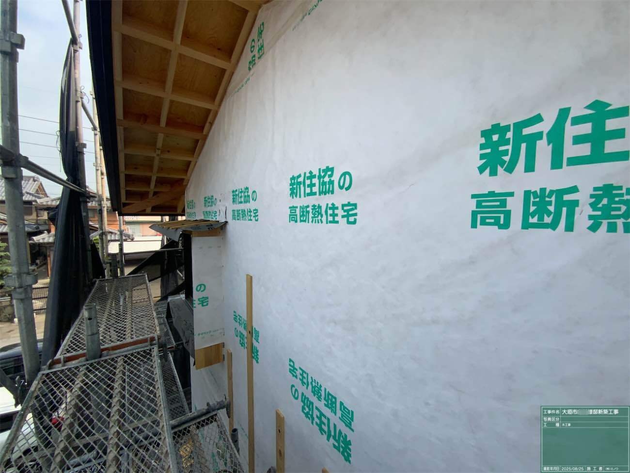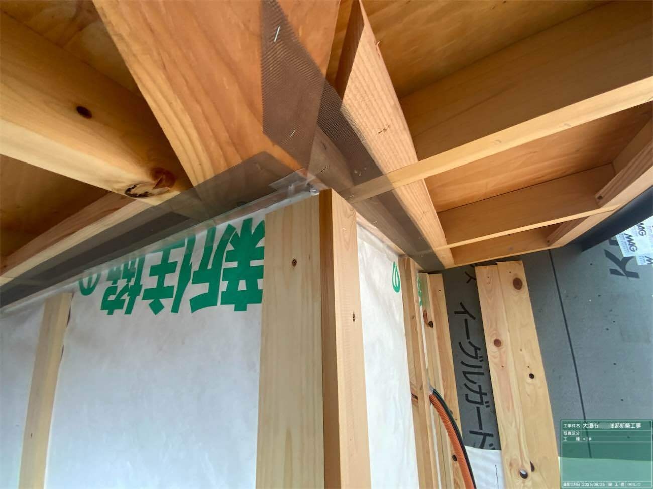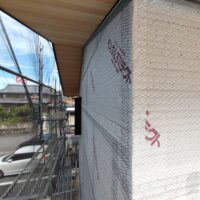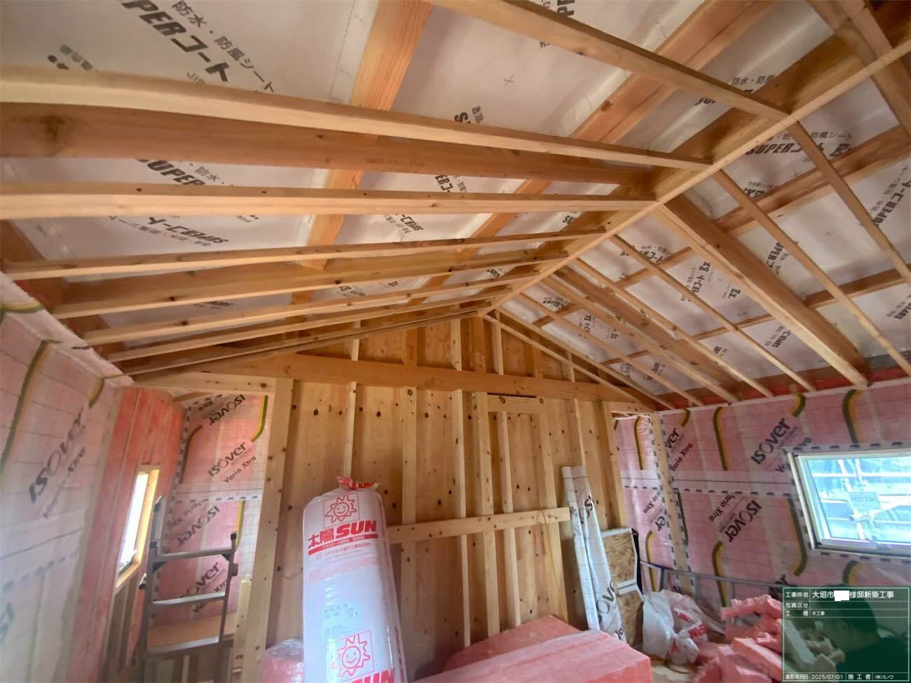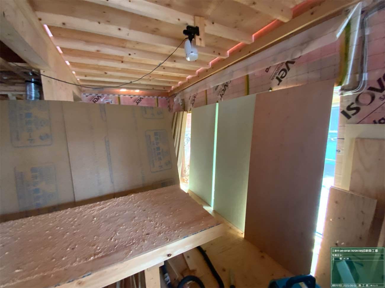 天井の断熱材敷設、気密シート張りも終わり、その間隙を縫ってシート内を通る電気配線も行われました。連日この○○暑い猛暑の中、直上方向の断熱ができたという事は現場自体が『ある程度』作業しやすくなっていると思われます。