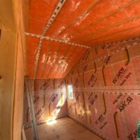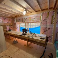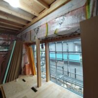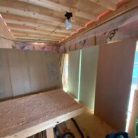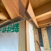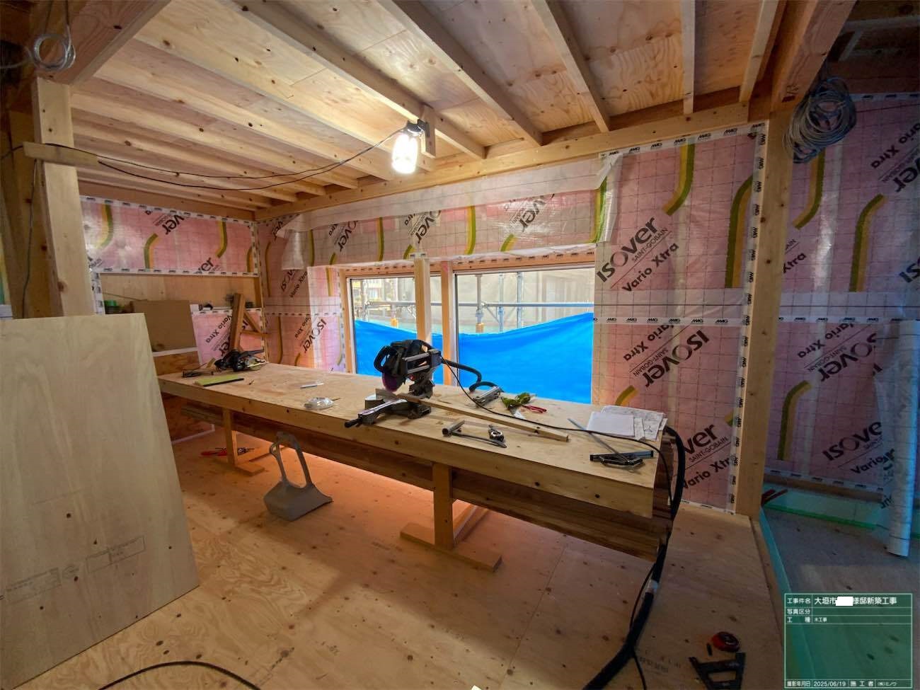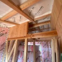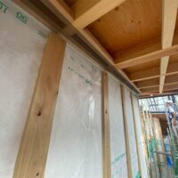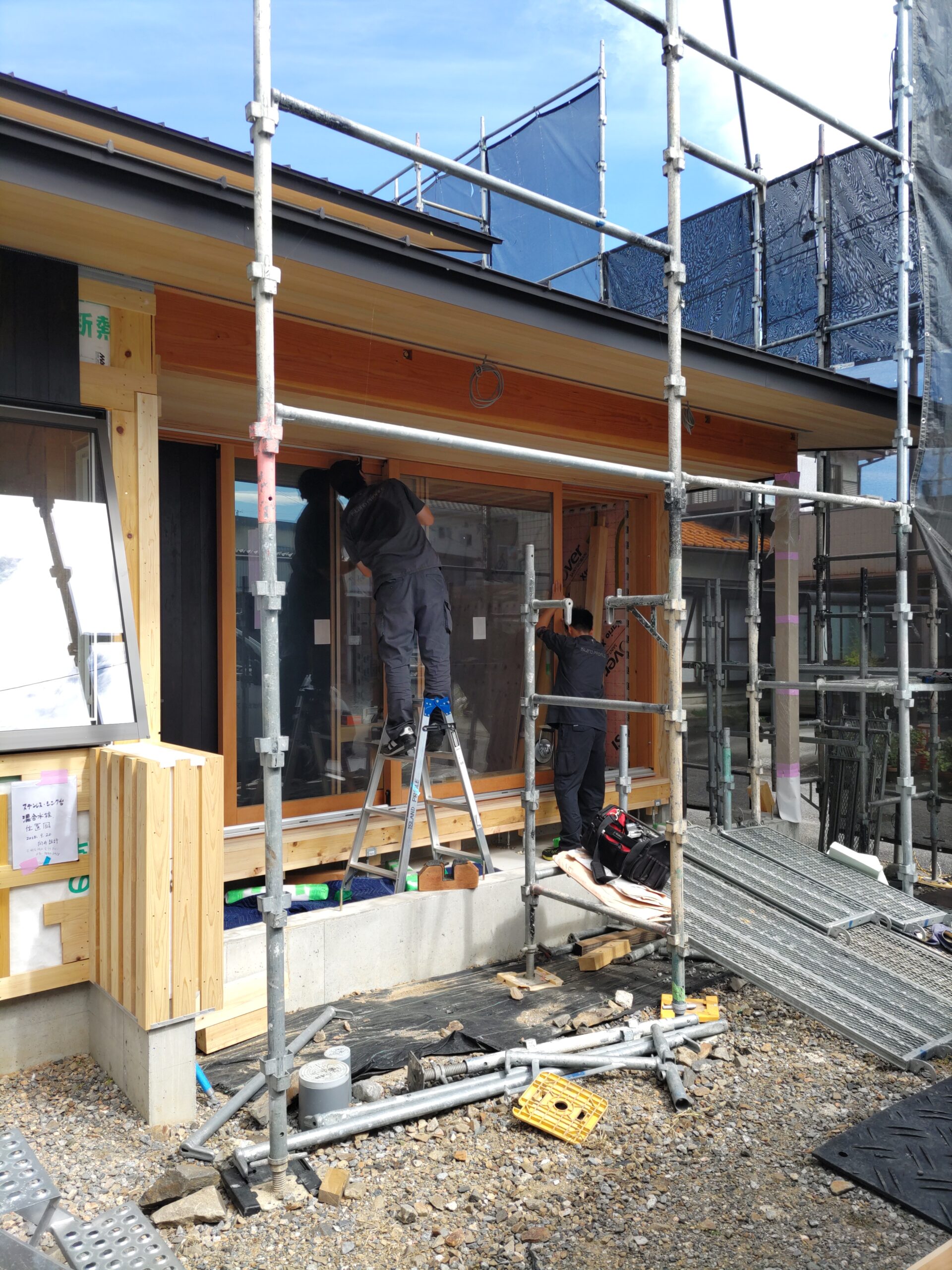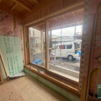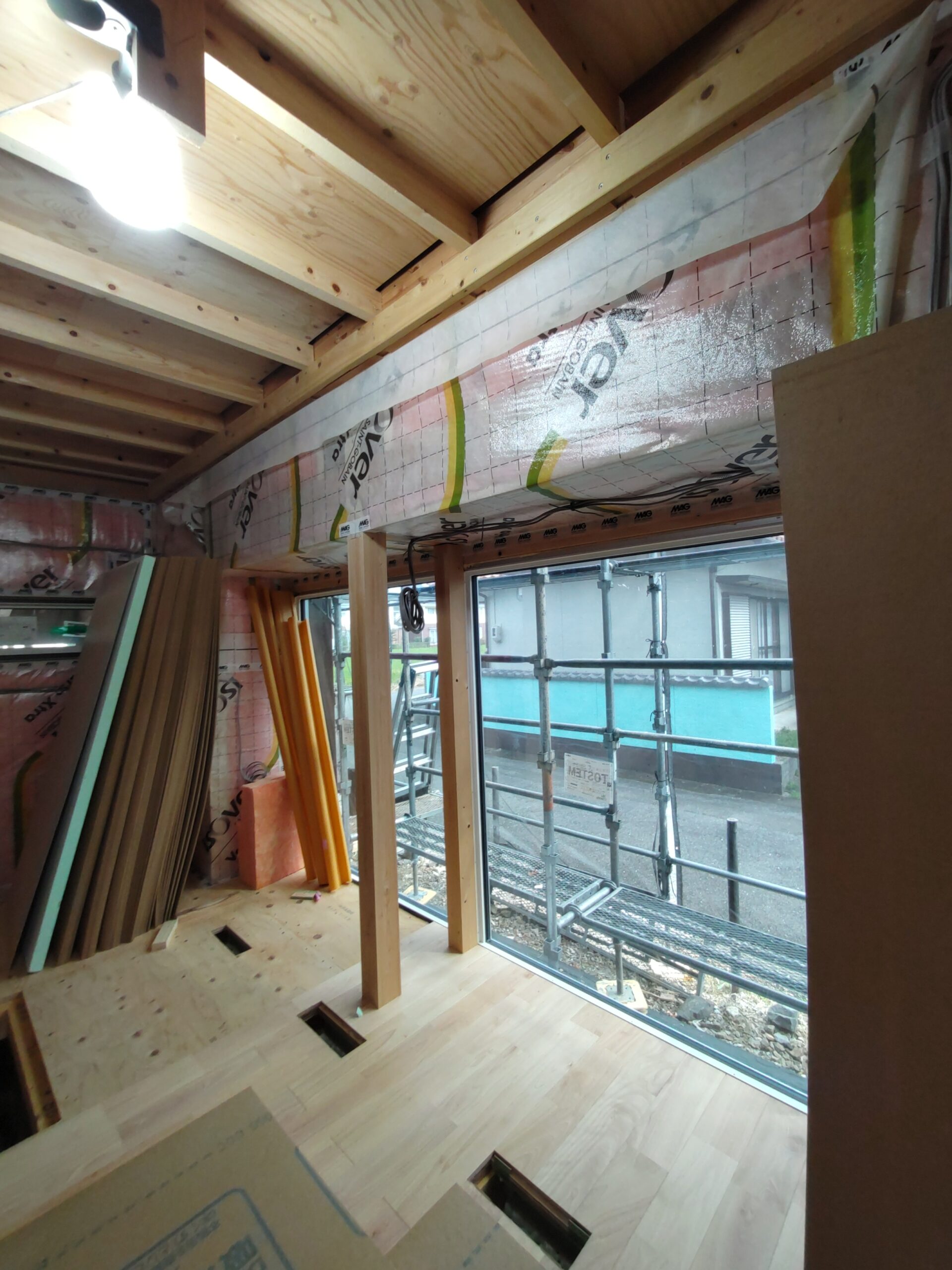 サッシを取り付けられるまでの間には内部で柱間充填断熱に勤しむI井棟梁。いろいろと細かい収まりを考えながら進めるので普段より時間はかかります。