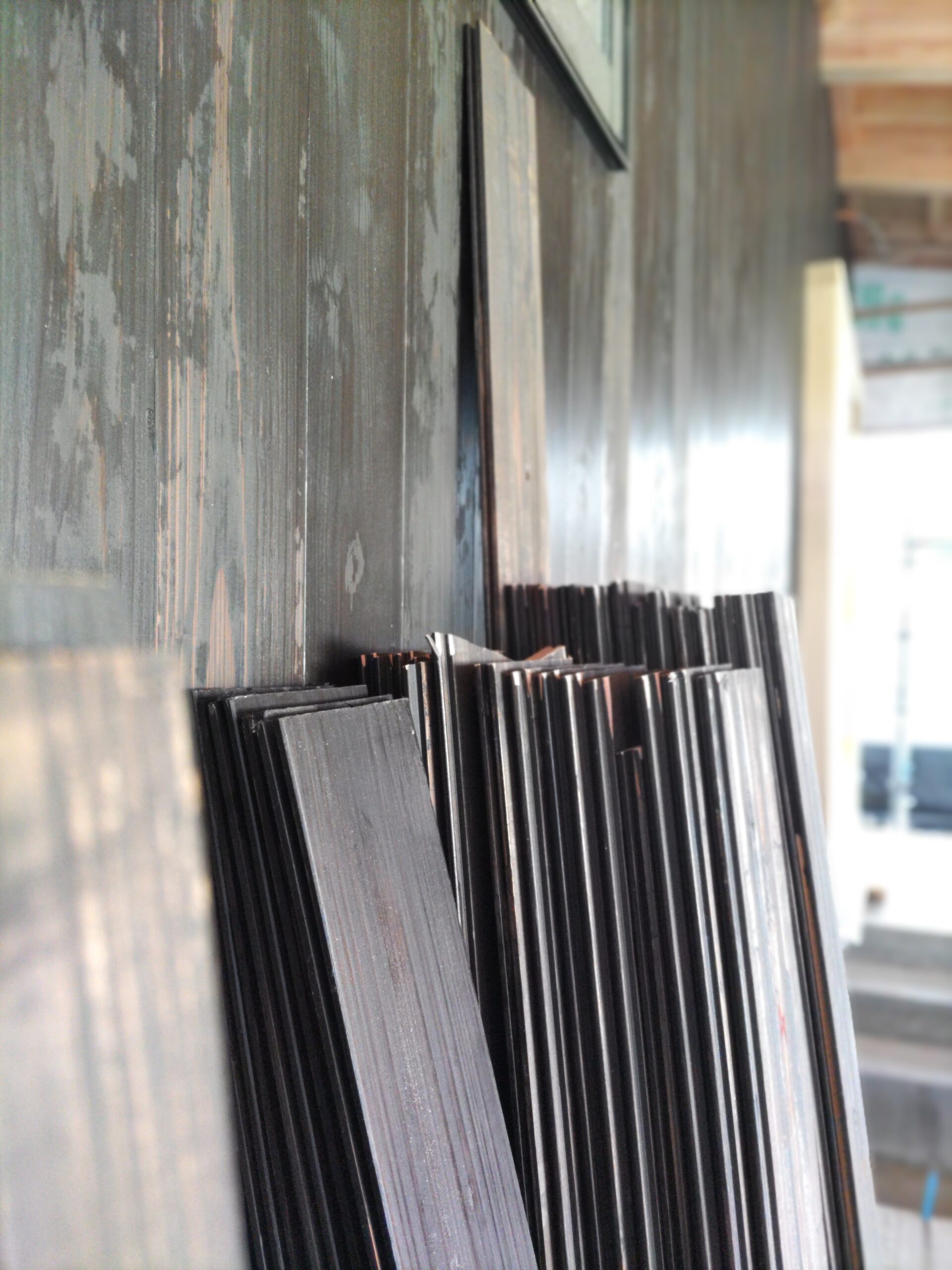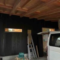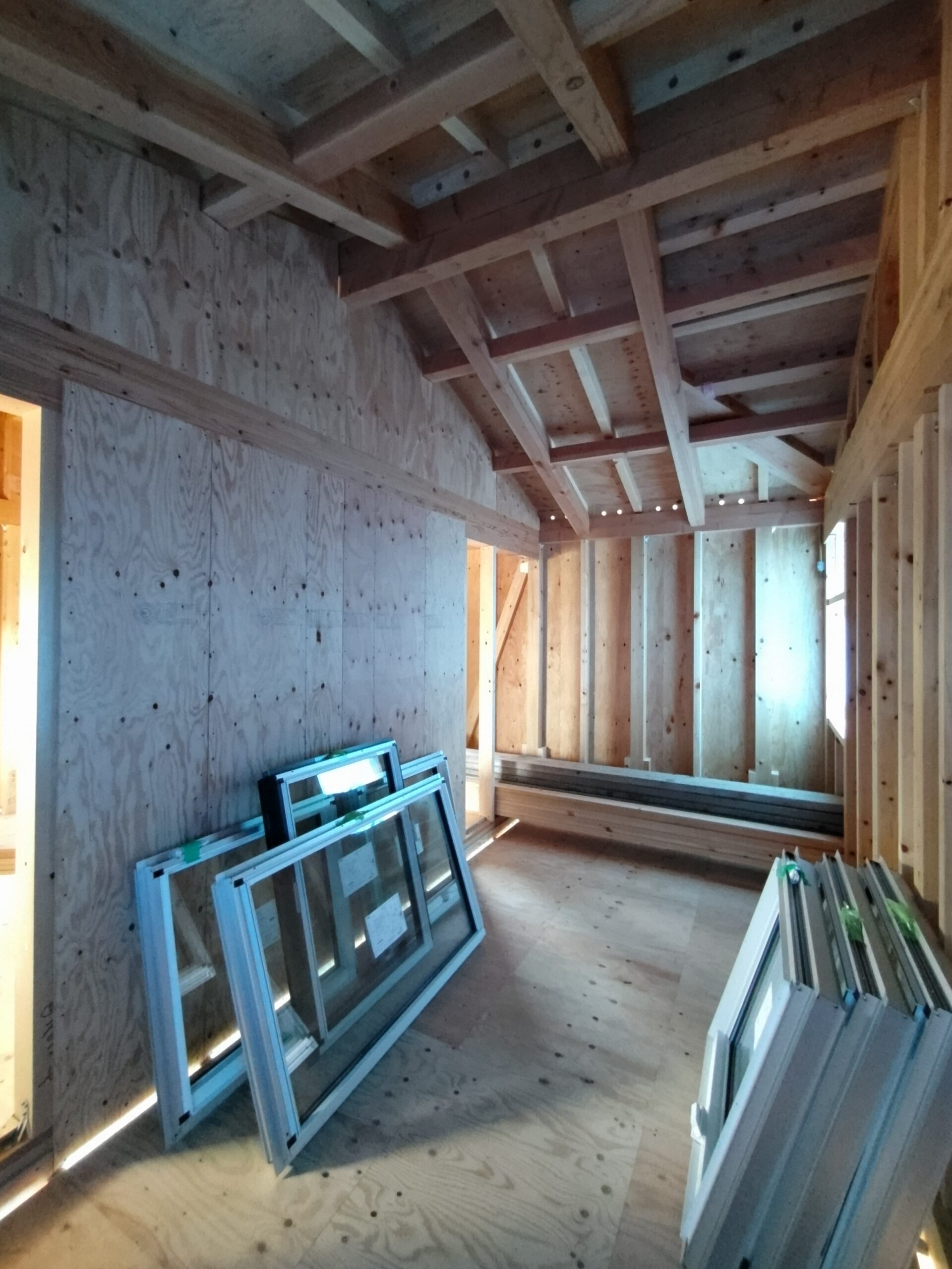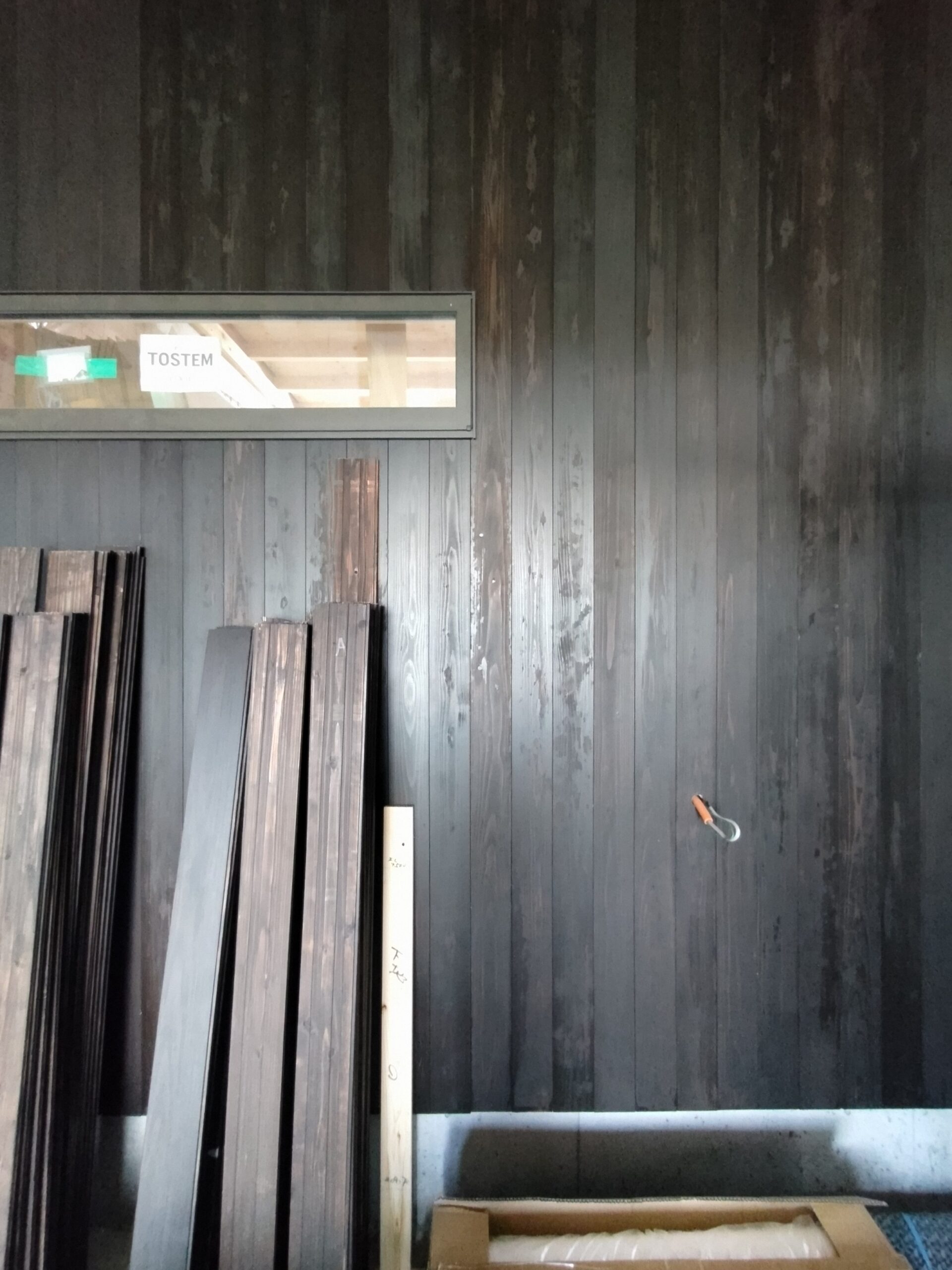 一部外壁の羽目板が敷設されています。これらは2か月ほど前、km様とm井先生がミノワ本社の倉庫まで遠路出向き、DIY塗装したものです。2か月の間倉庫で保管されていましたがやっと出番を迎えました。天井の生成りの木材の色に濃い色の羽目板のコントラストが際立ちます。
