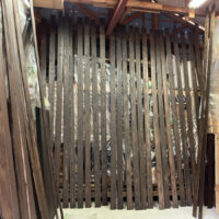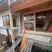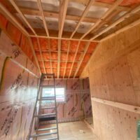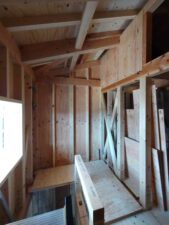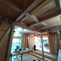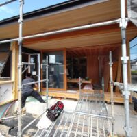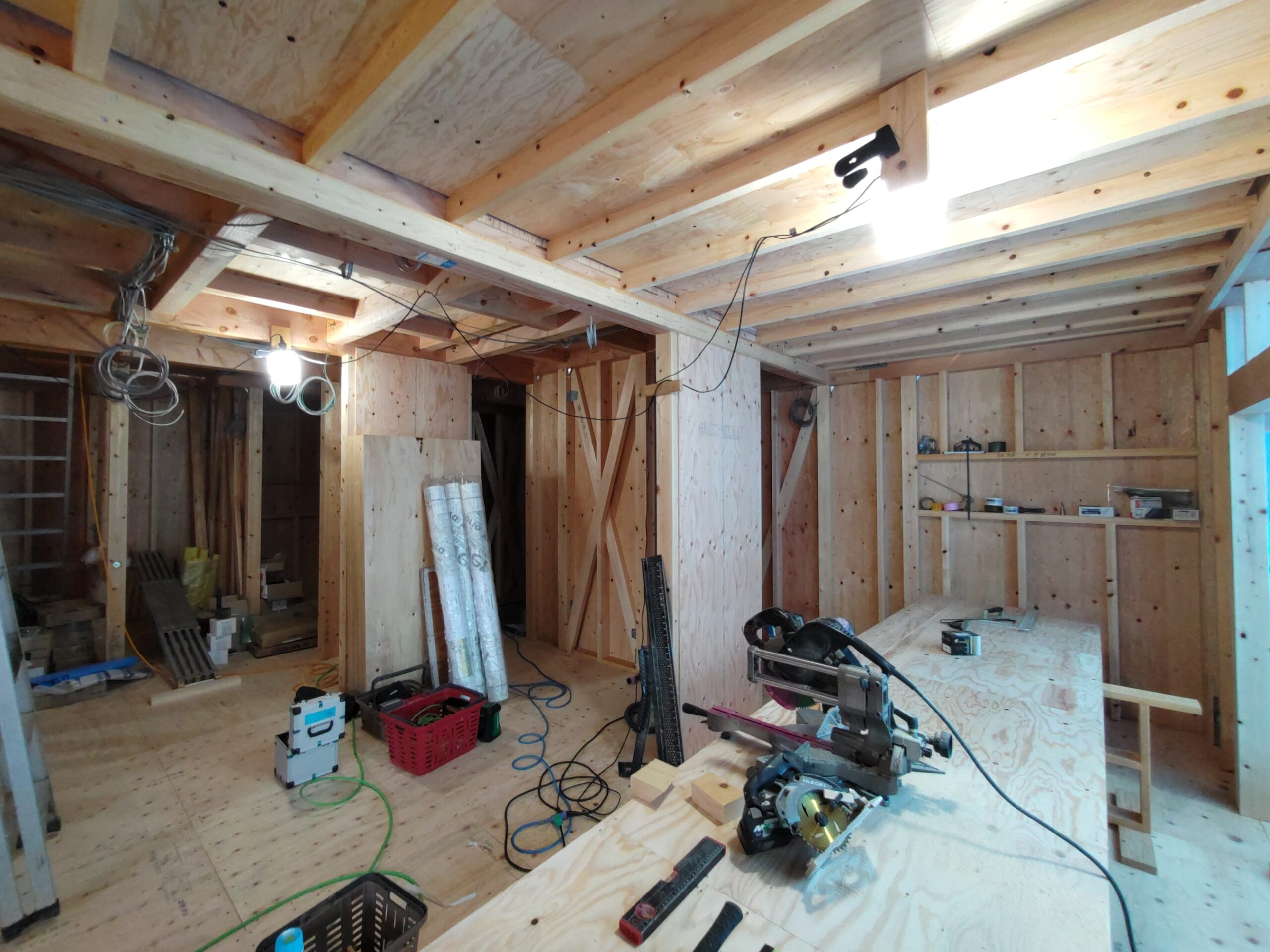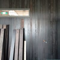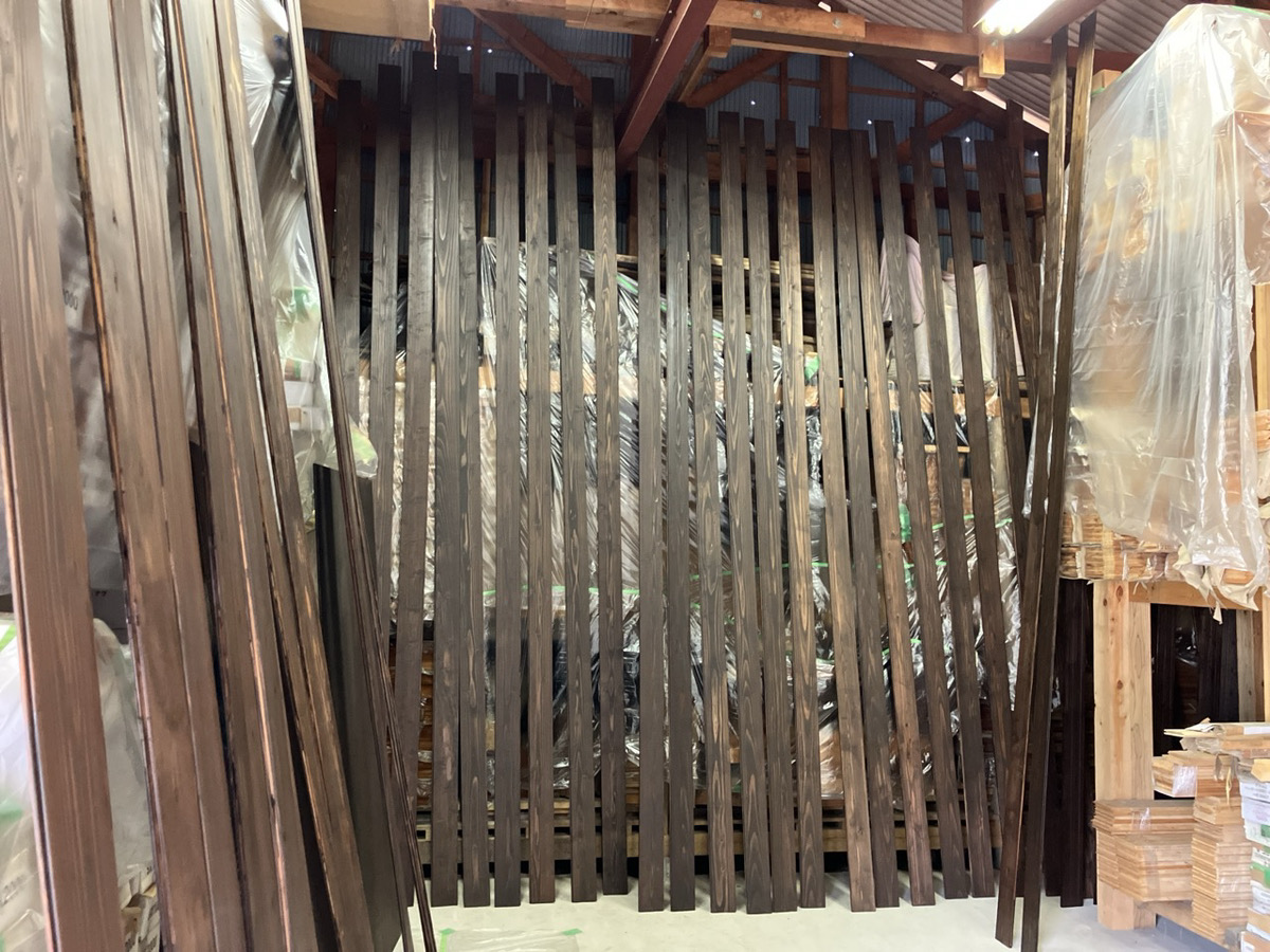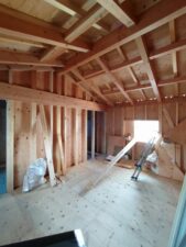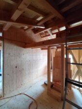 一部外壁の羽目板が敷設されています。これらは2か月ほど前、km様とm井先生がミノワ本社の倉庫まで遠路出向き、DIY塗装したものです。2か月の間倉庫で保管されていましたがやっと出番を迎えました。天井の生成りの木材の色に濃い色の羽目板のコントラストが際立ちます。