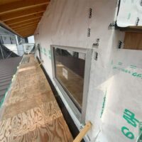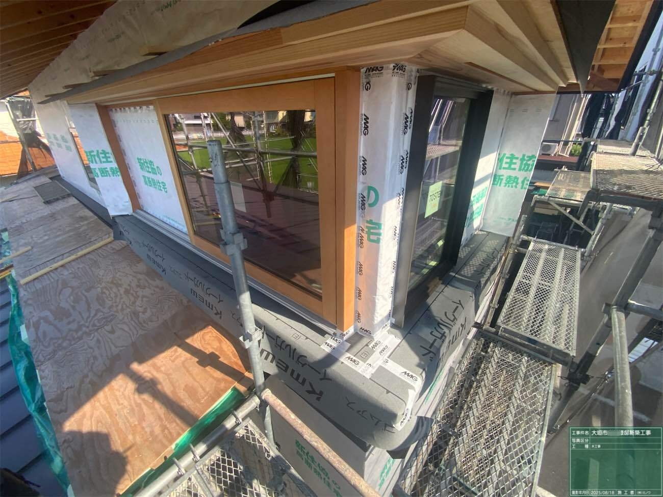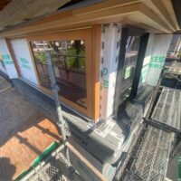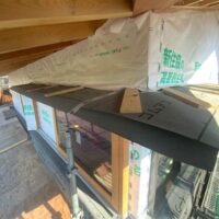 外壁の出隅コーナー窓回りのおさまりの仕事。木製サッシ、アルミサッシ、造作による庇、雨戸、板金による庇、防水紙などが複雑に絡み、なかかなにムズカシイ仕事になっています。