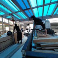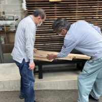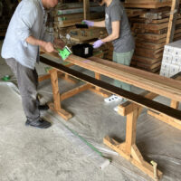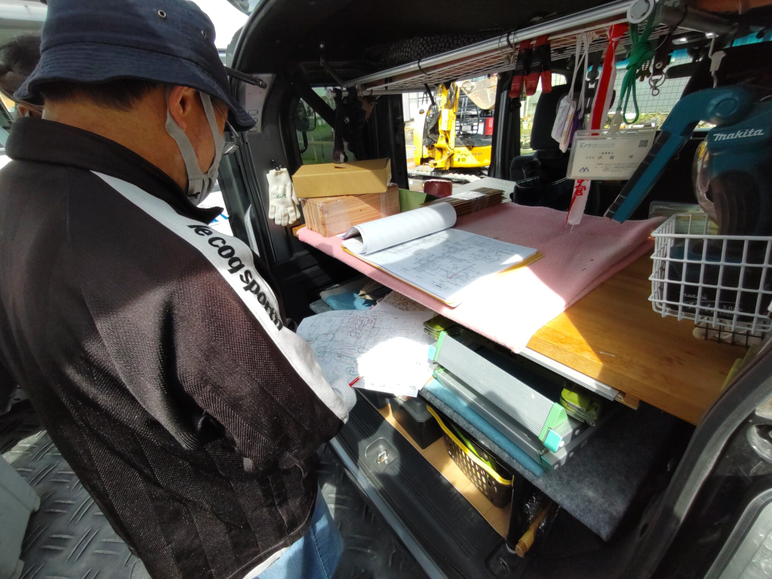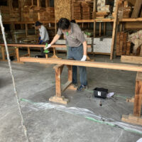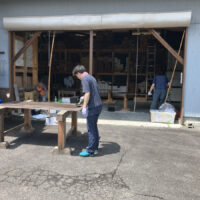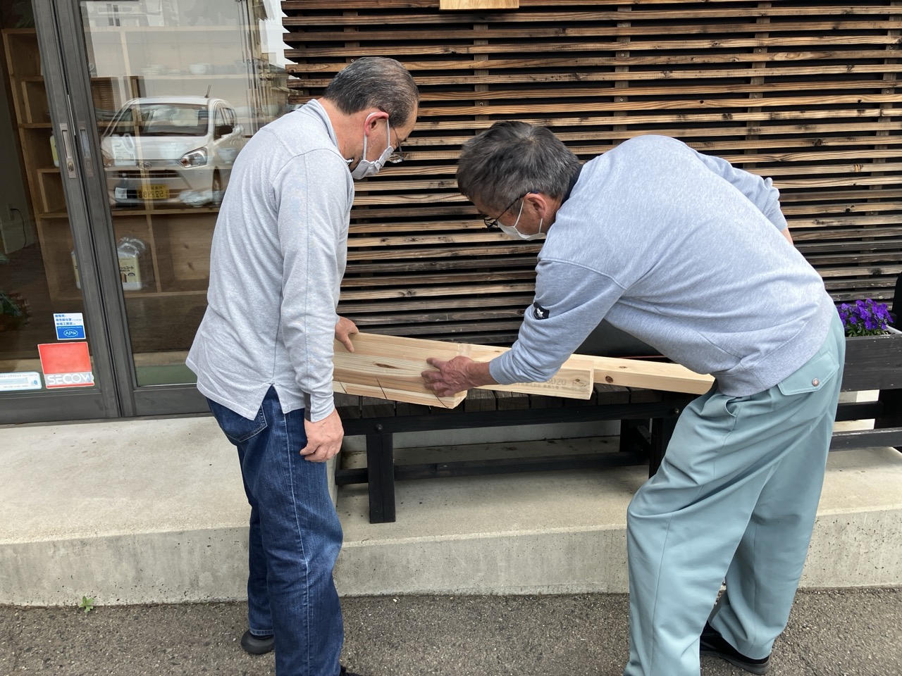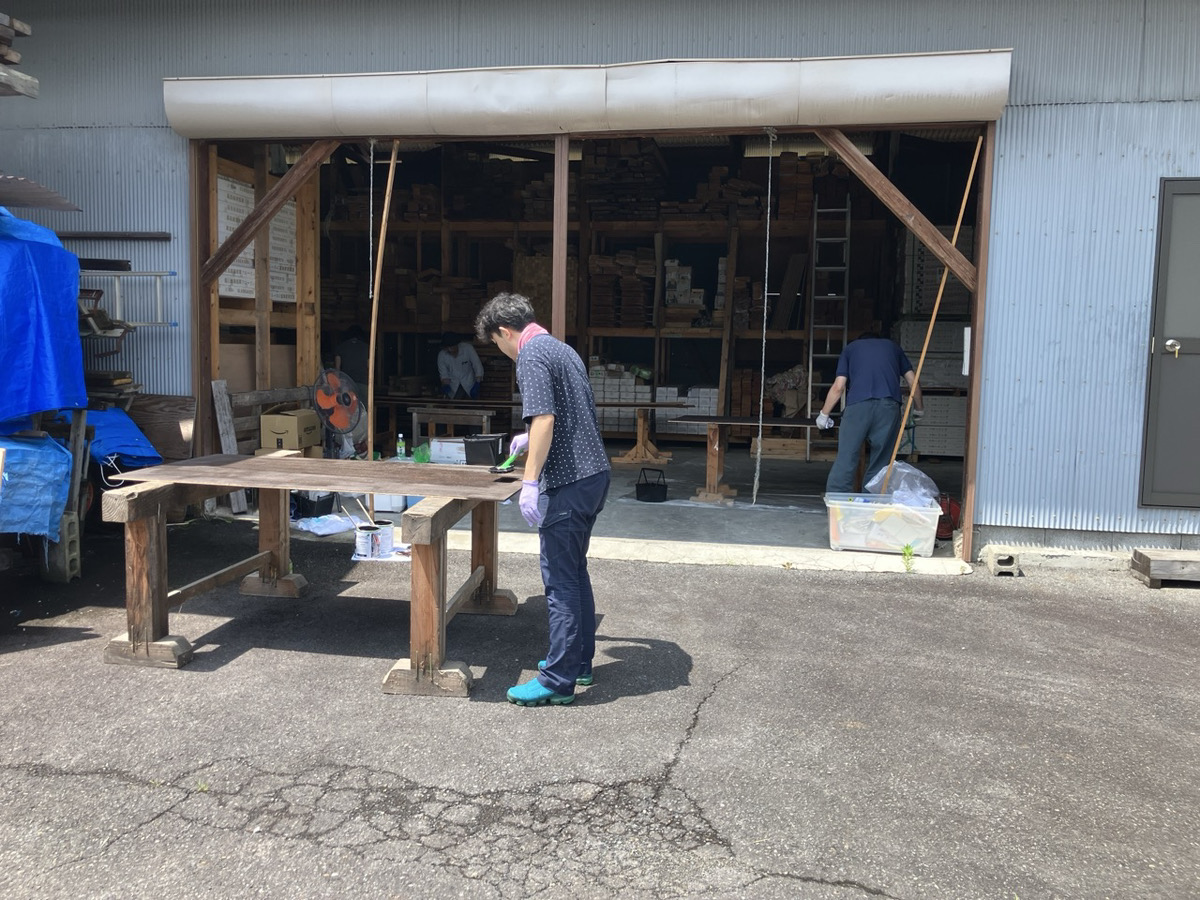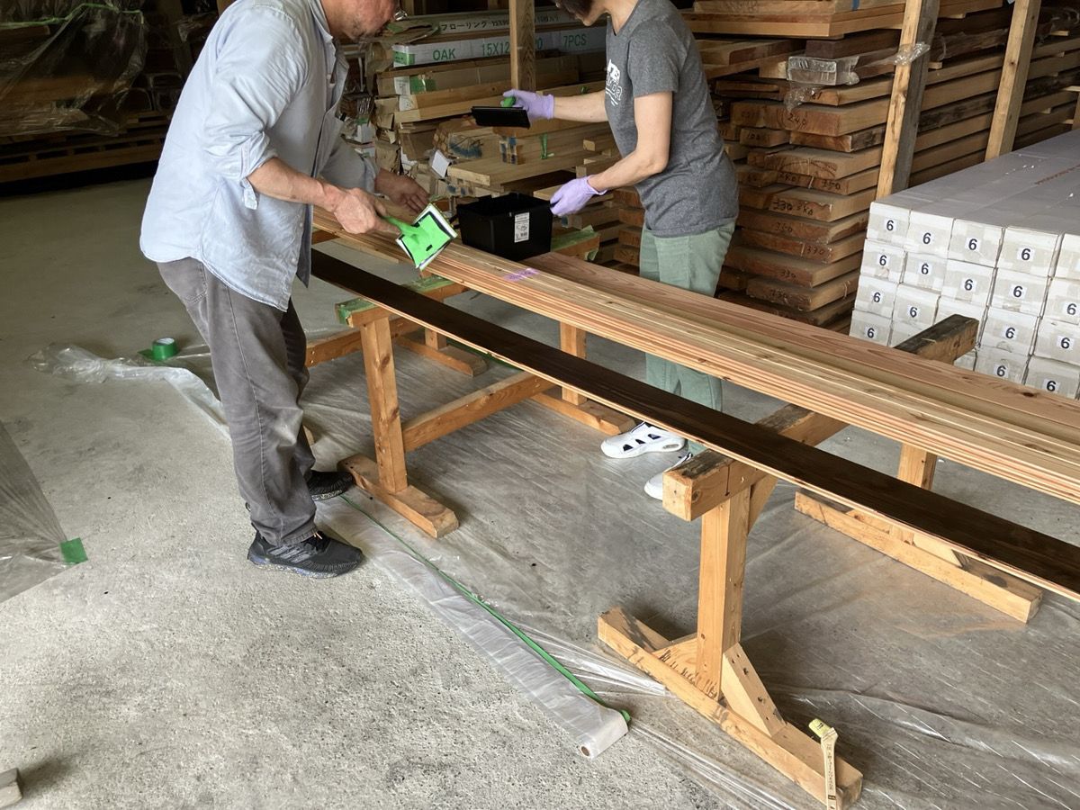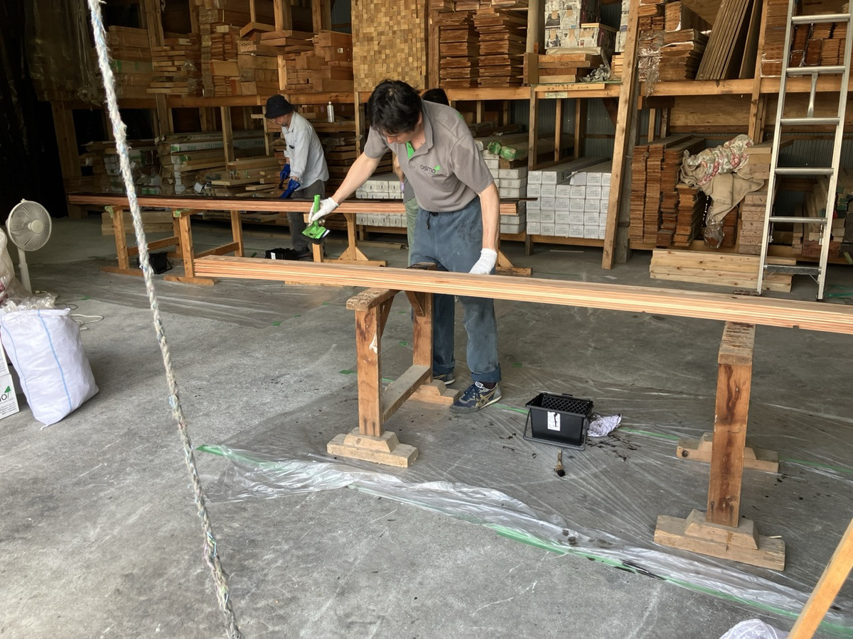 一部外壁には着色された羽目板を使用する計画ですが、塗装工事はm様とm井先生ご夫妻、オスモ&エーデルのy田さんとでDIYとされました。現場では塗装する広い場所がないので、ミノワの本社へ運材し、はるばる黒川までやってきて倉庫の一部を使って作業しています。山奥とはいえ非常に暑い本日、汗をかきかき奮闘されていますが、お住まいになってからの良い思い出となるかもしれません。