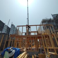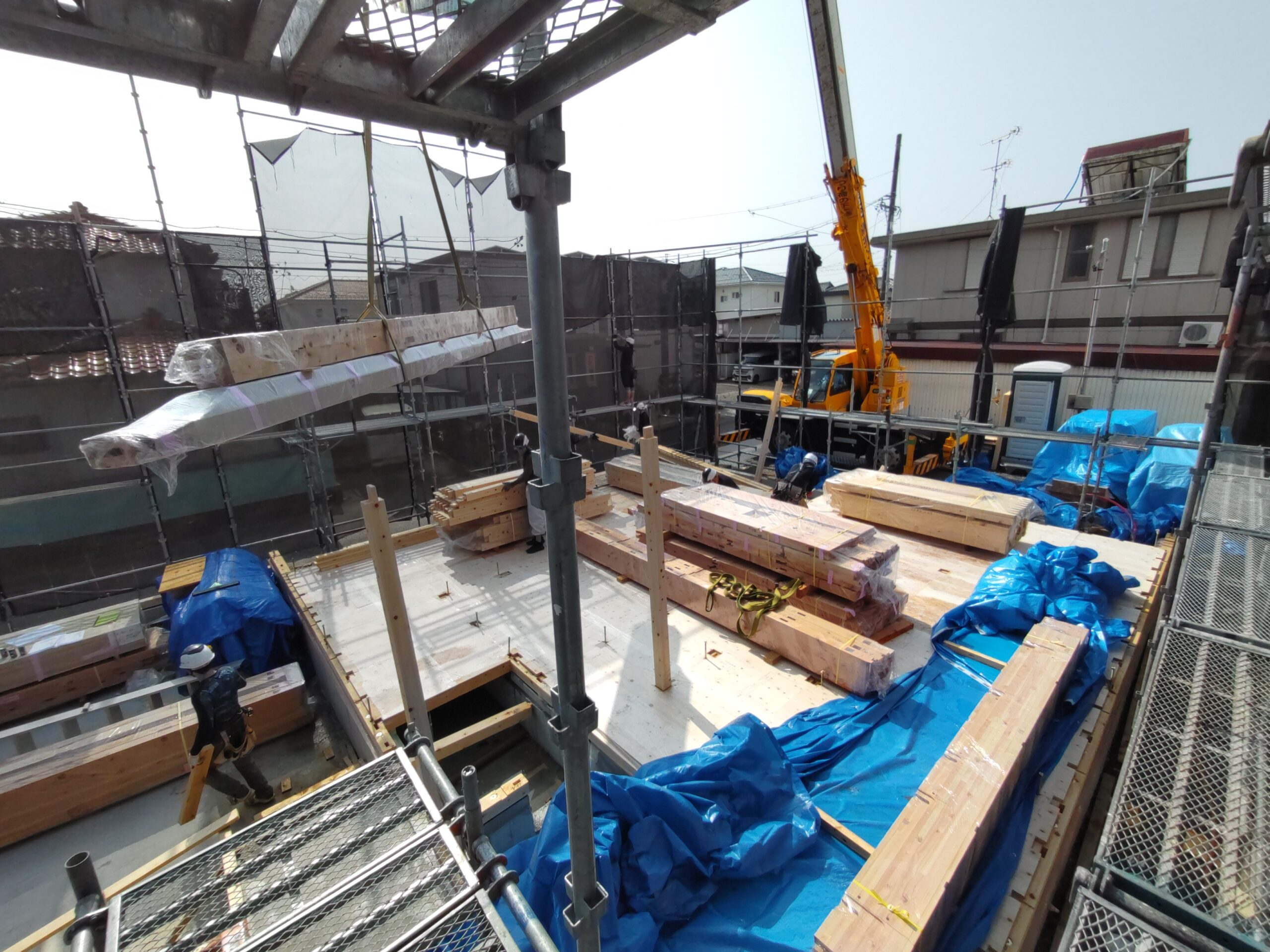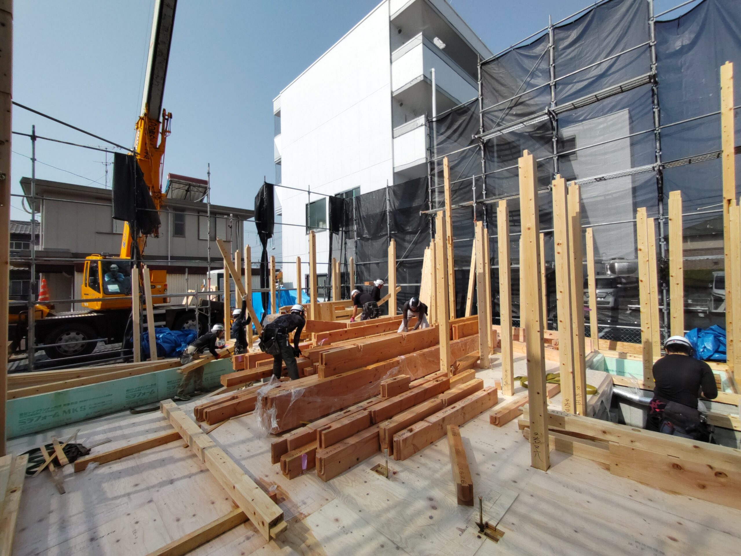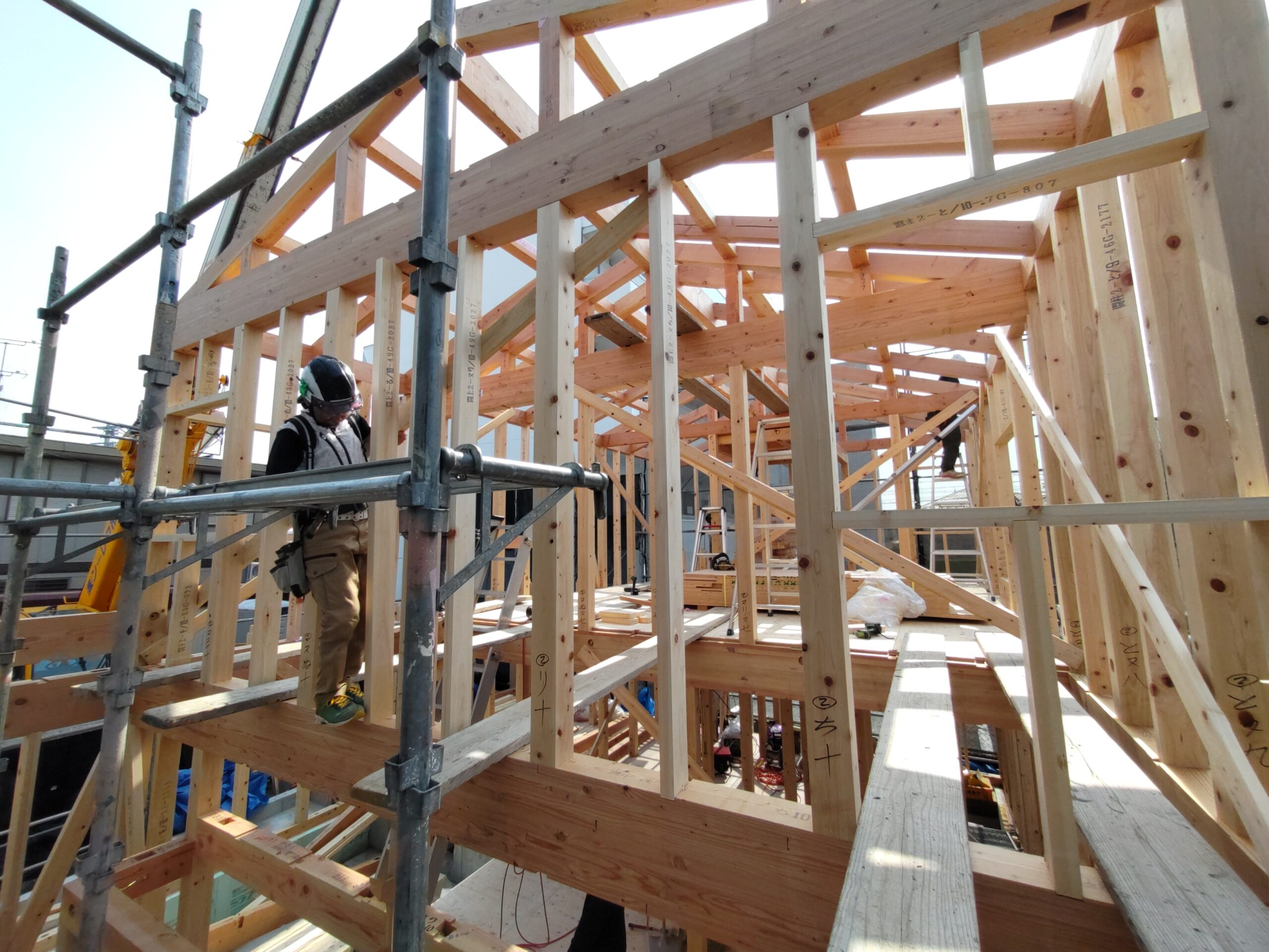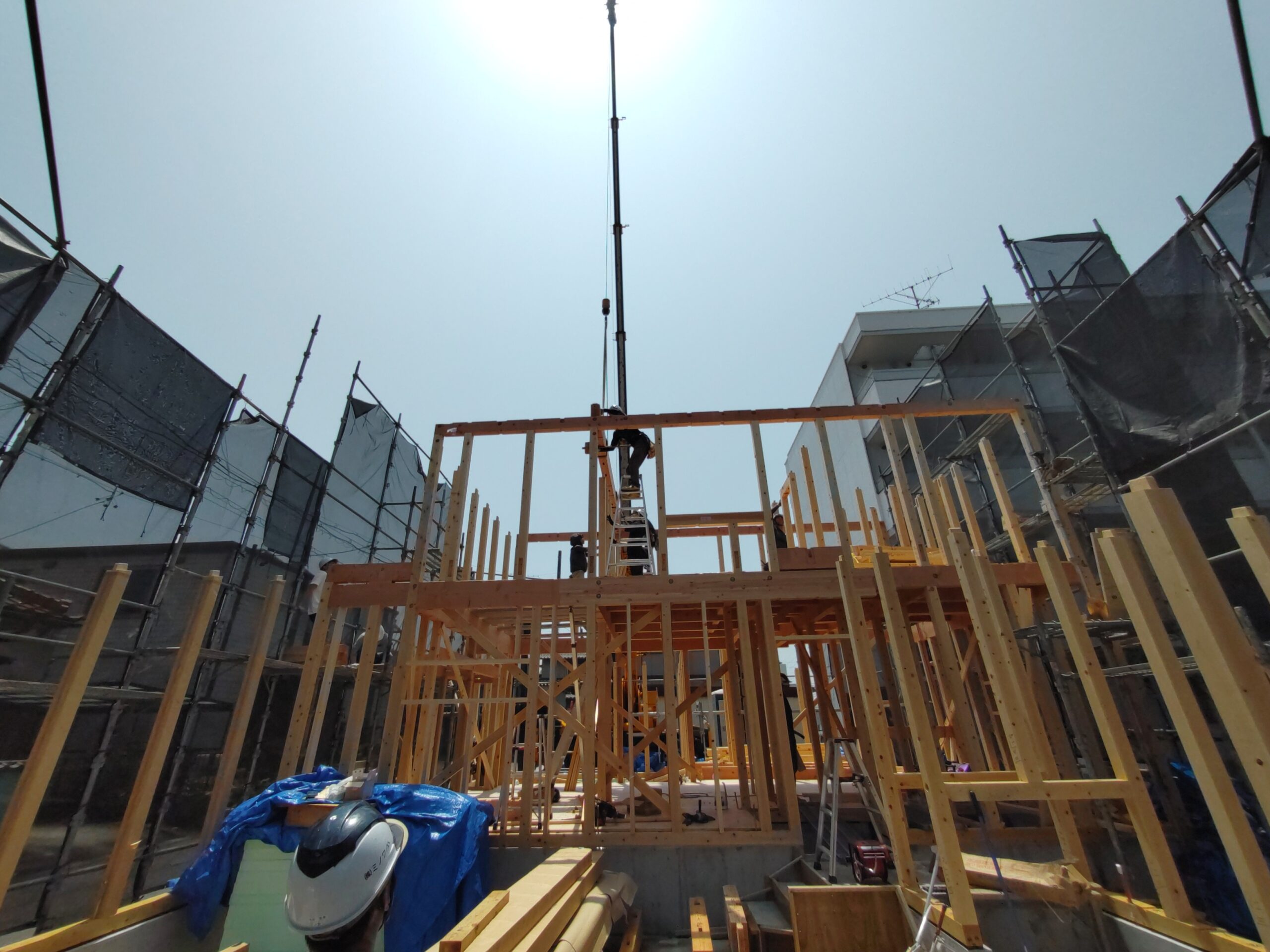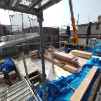 間違いなく今年一番の暑さ、5月というのに真夏日の本日、m様邸の上棟初日が行われました。比較的複雑な構造のため2日ほどかかるという日程です。