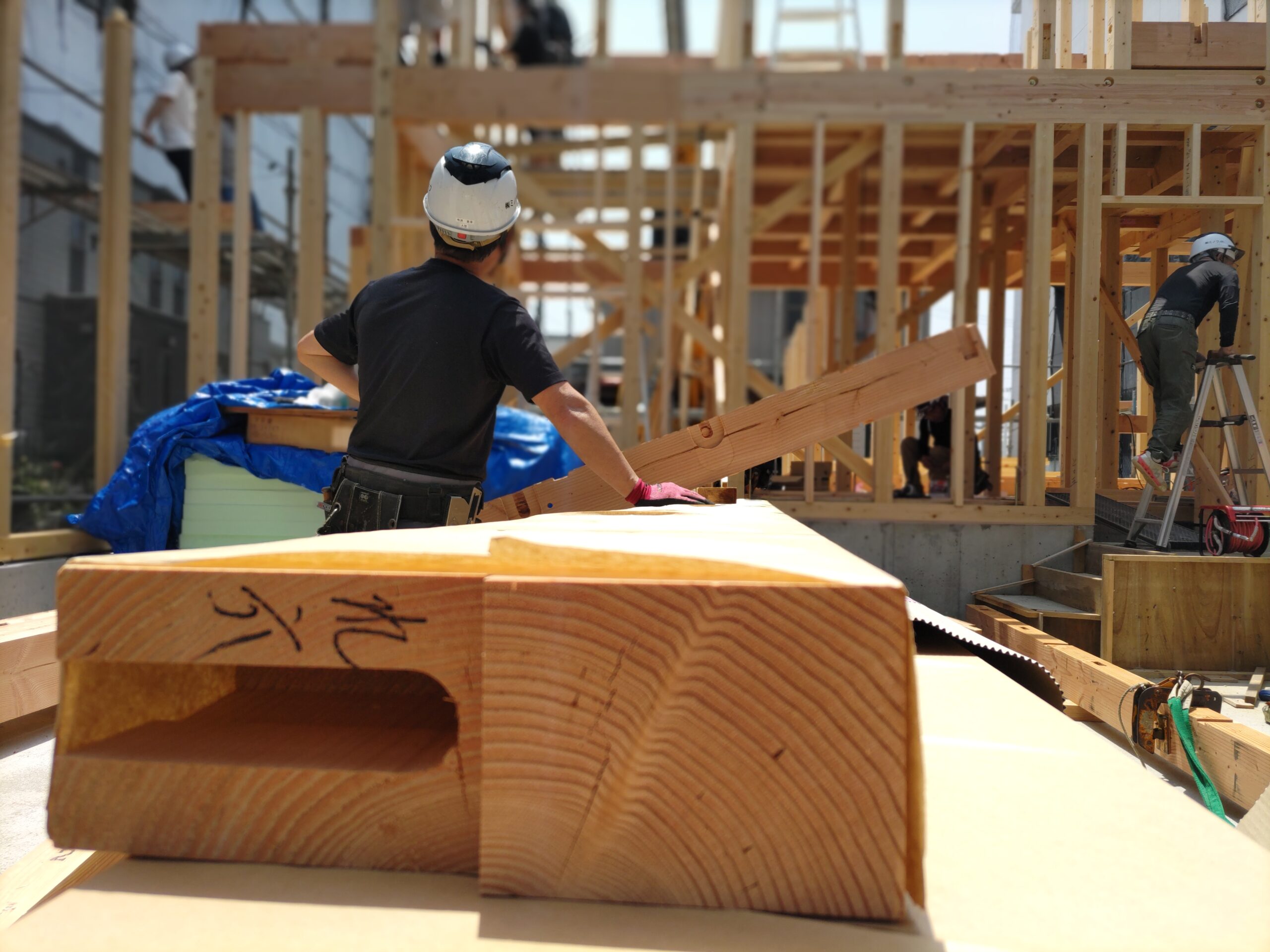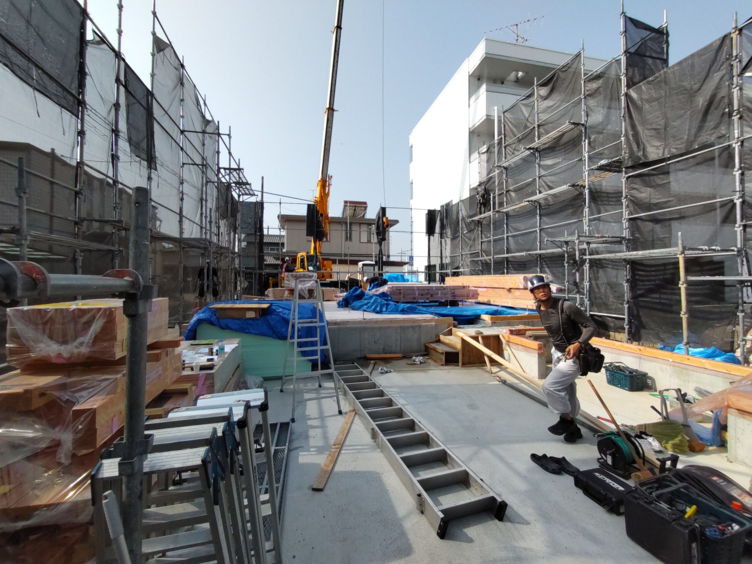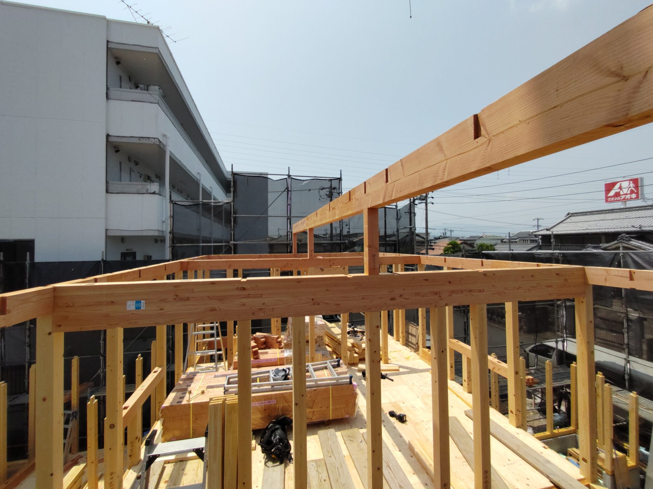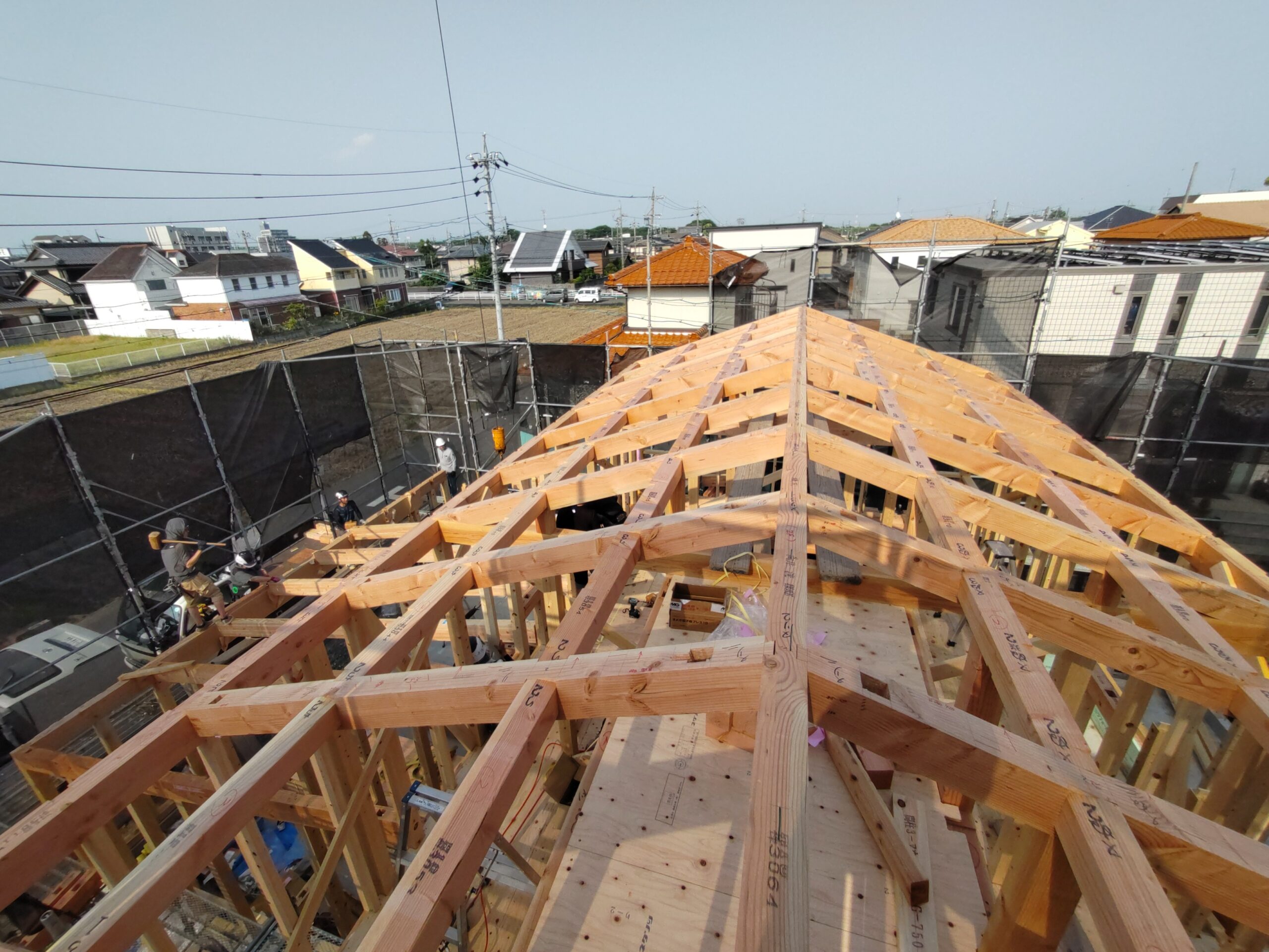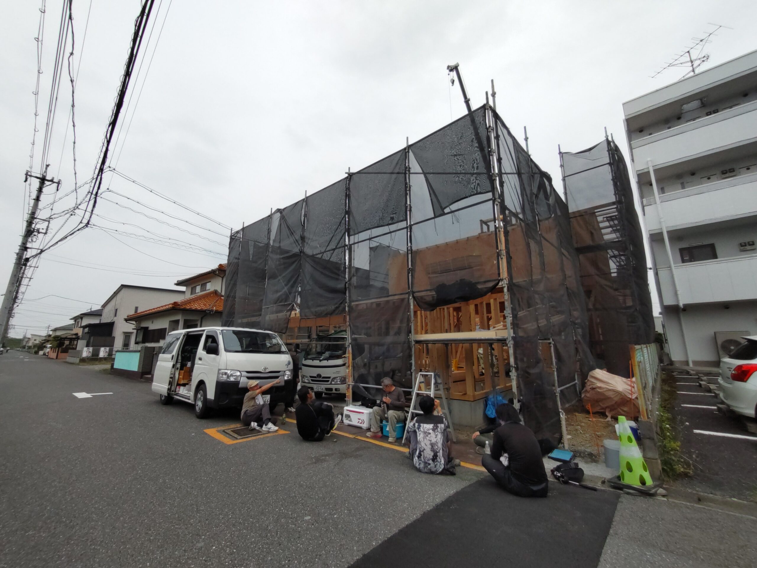 間違いなく今年一番の暑さ、5月というのに真夏日の本日、m様邸の上棟初日が行われました。比較的複雑な構造のため2日ほどかかるという日程です。