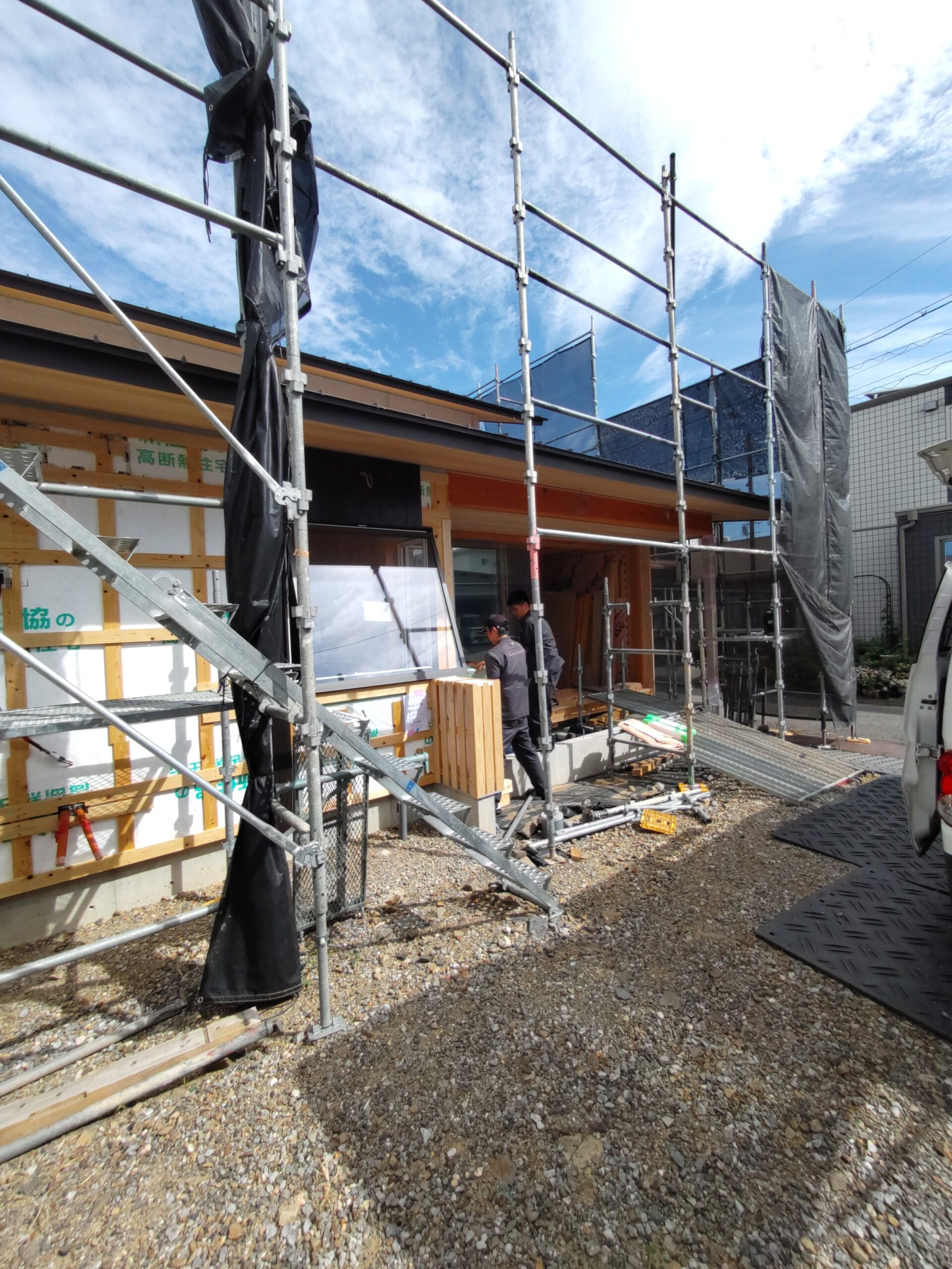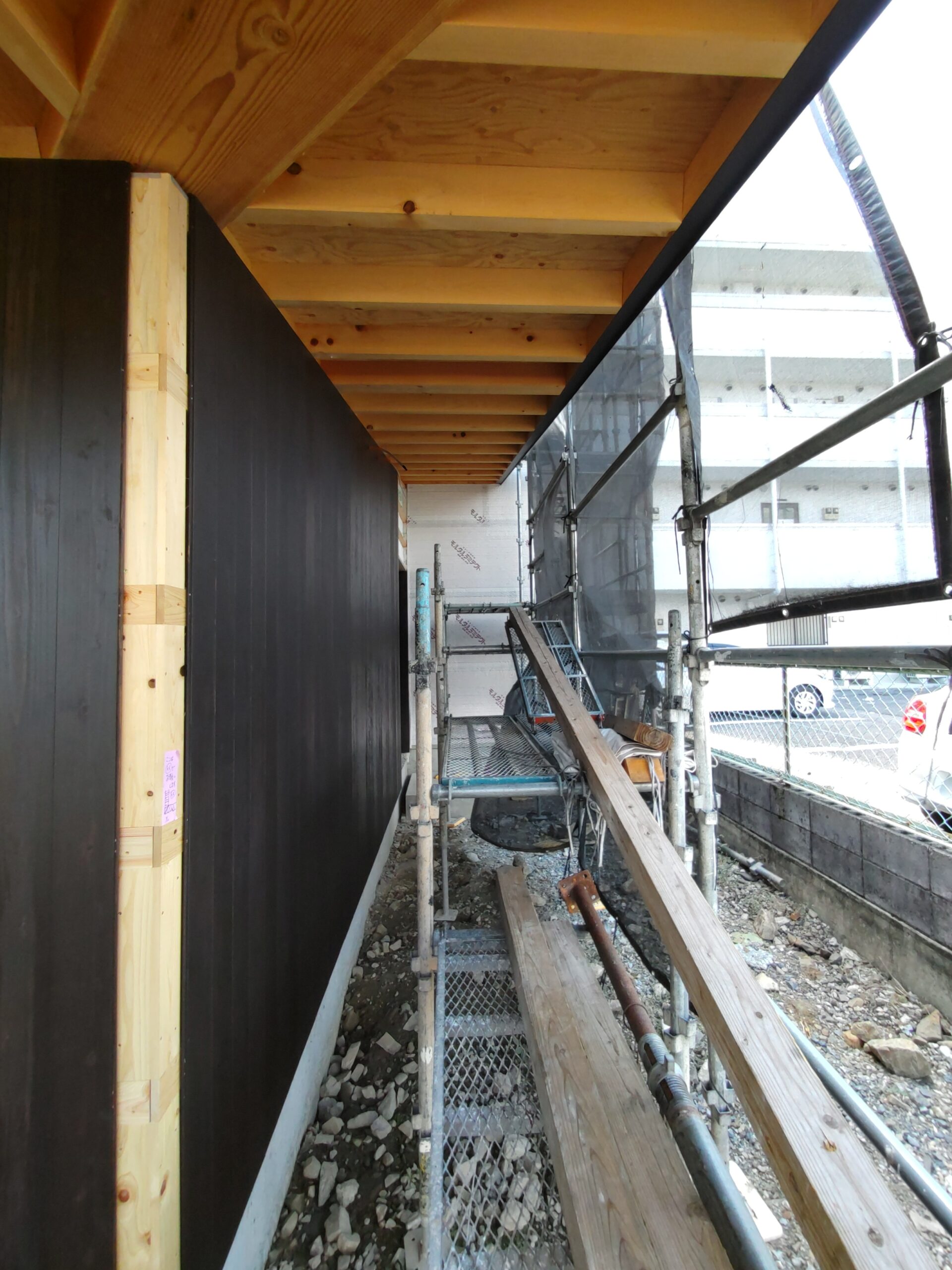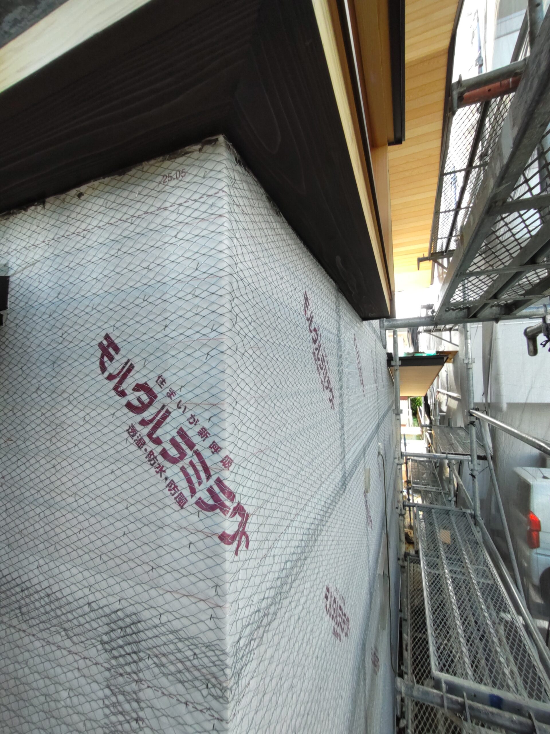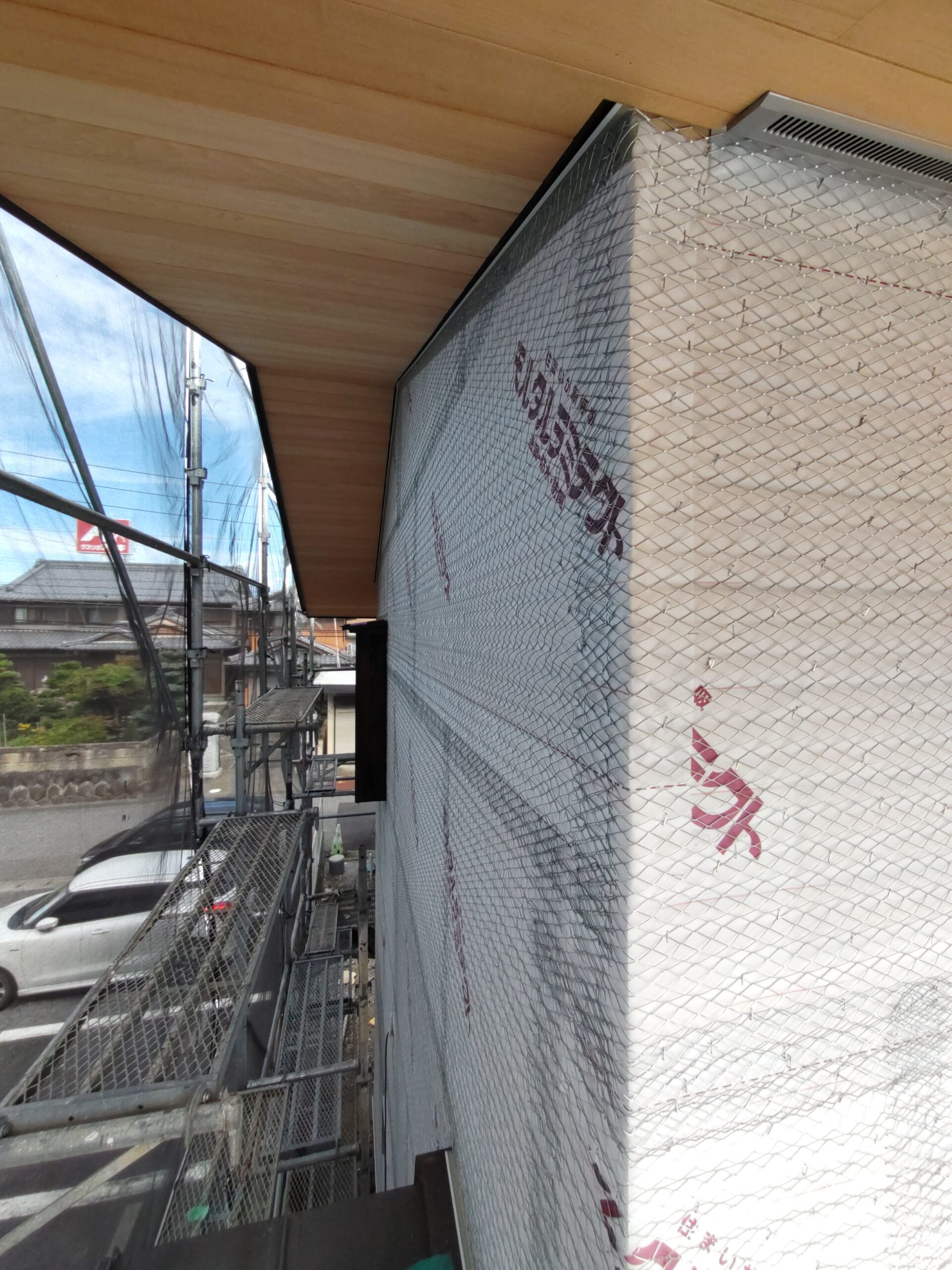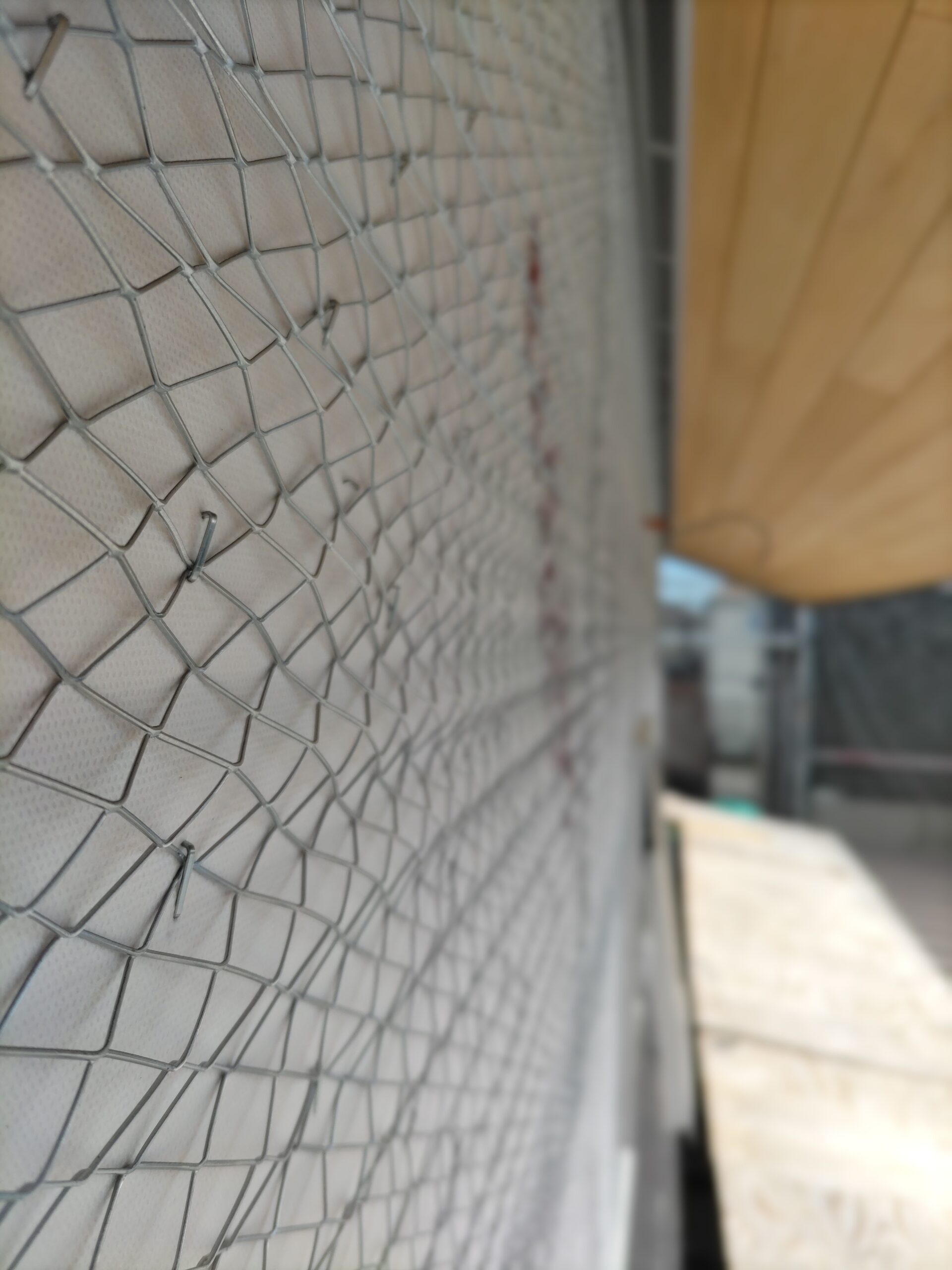 羽目板以外の外壁部分は塗り壁になります。防水シートの上にメタルラスが張り巡らされています。秋になって気候が良くなってきましたので外壁の左官工事をするには良い季節です。