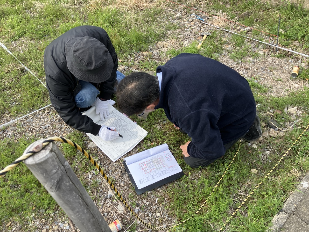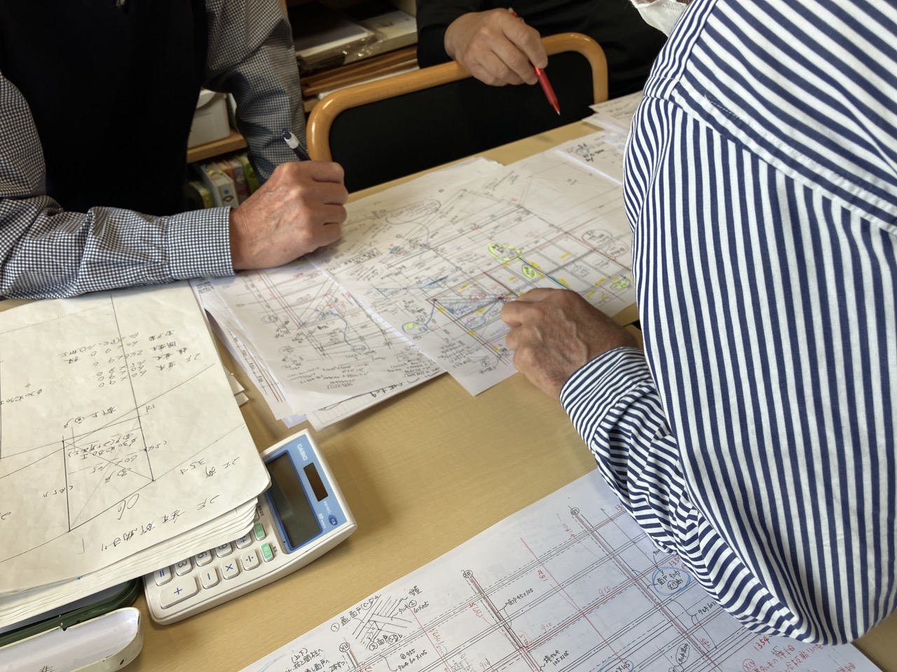 翌日に控えた地盤改良工事の位置や高さレベルの最終打ち合わせ。地鎮祭の時にある程度の配置を出していますが、杭の位置をもう一度改良業者を交えて打ち合わせていきます。