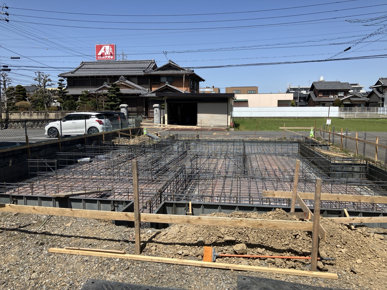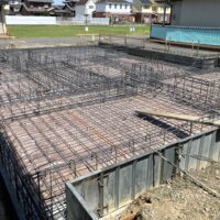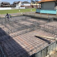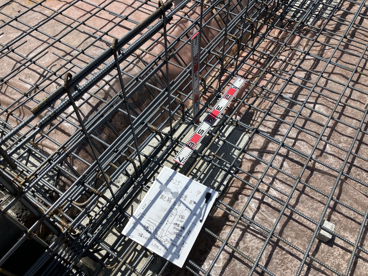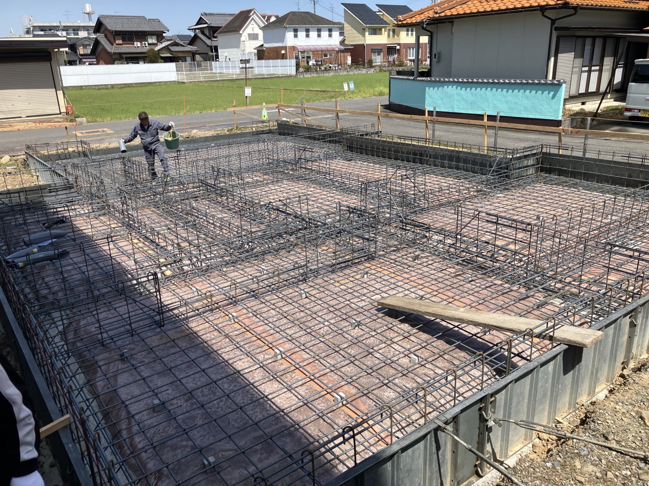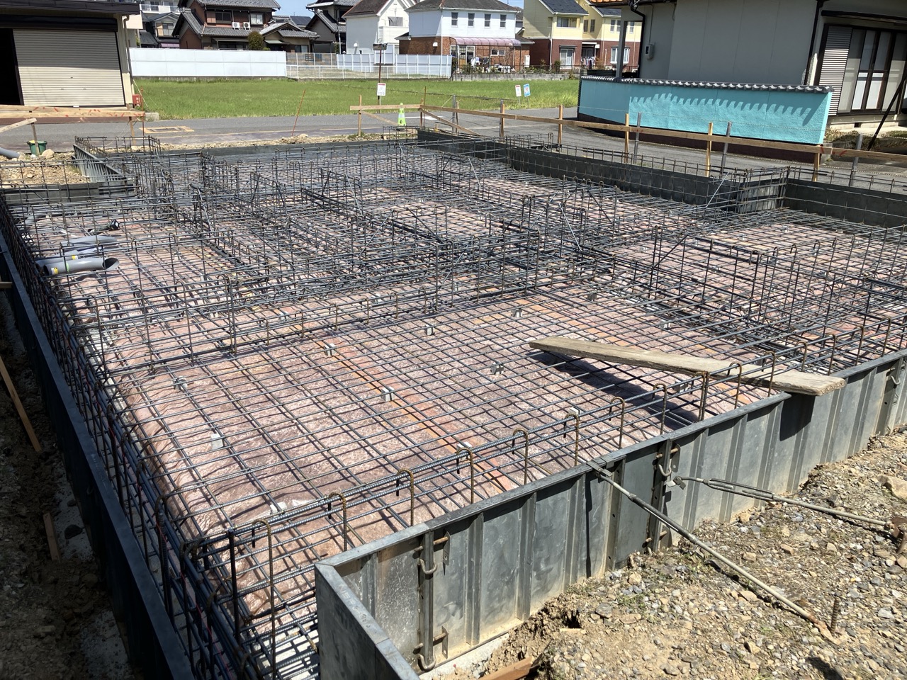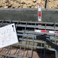 基礎配筋工事が終わり、配筋検査を行いました。そろそろ春の暖かさも感じ・・というよりは梅雨明けくらいかと思われるくらいの日差しが照り付け、冬用の作業着では汗ばむくらいの容器です。風が強く、持って行った基礎伏図が飛ばされそうでした。
