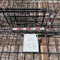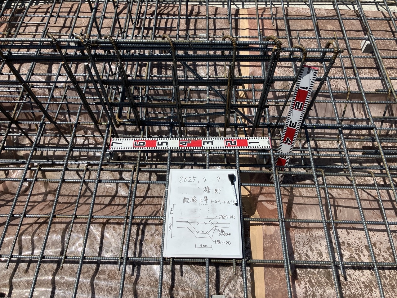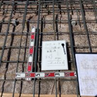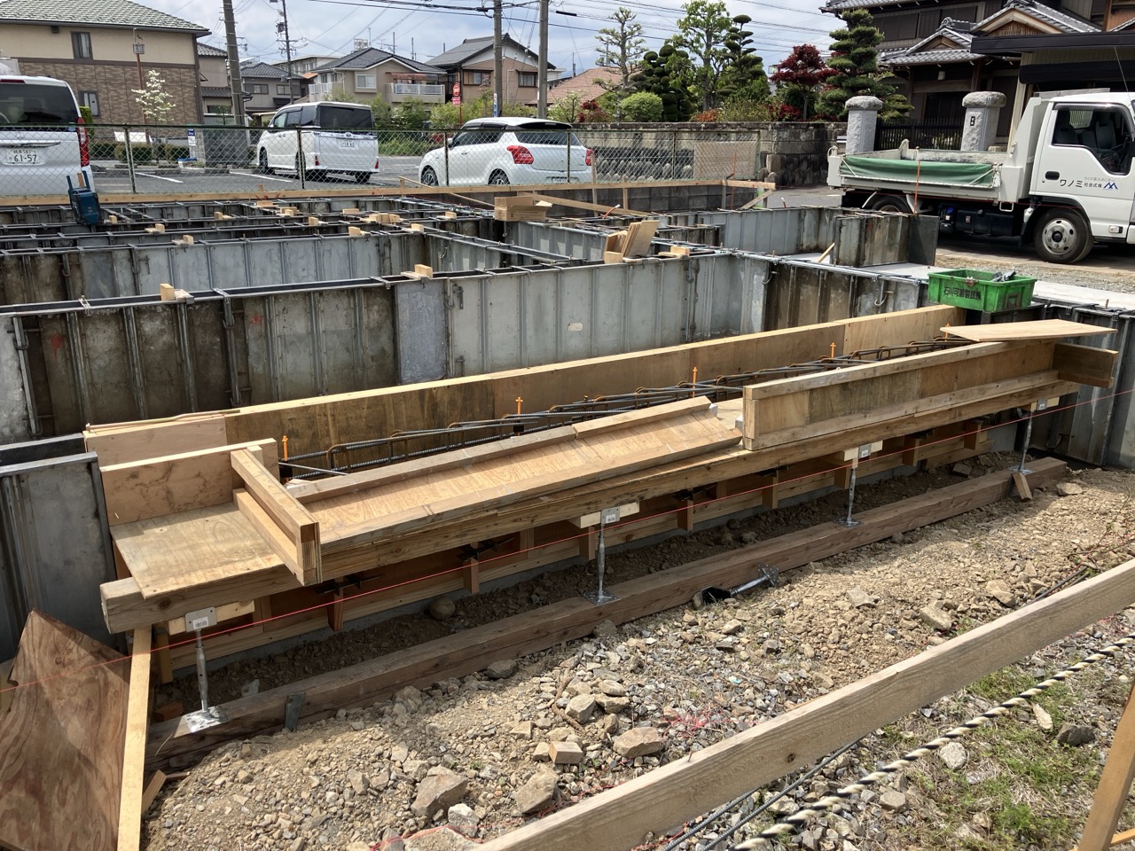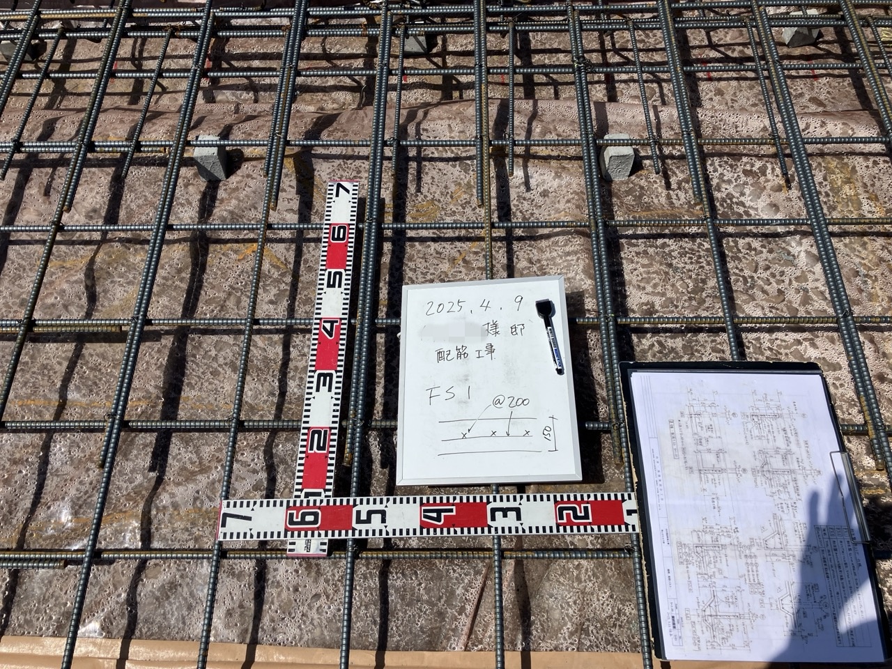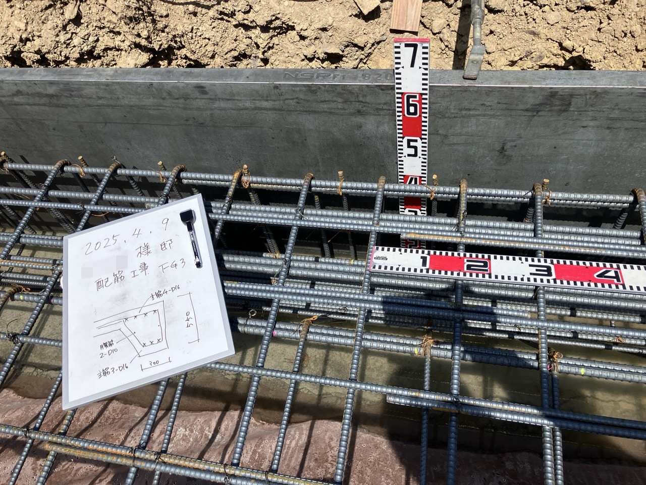 基礎配筋工事が終わり、配筋検査を行いました。そろそろ春の暖かさも感じ・・というよりは梅雨明けくらいかと思われるくらいの日差しが照り付け、冬用の作業着では汗ばむくらいの容器です。風が強く、持って行った基礎伏図が飛ばされそうでした。