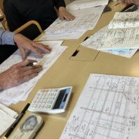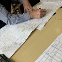 基礎梁に沿った地業~砕石式地業~防湿シート敷設及び捨てコンクリート打設、と基礎の工事が着々と進んでいます。現場でt広さんが汗して仕事をしている傍ら、事務所では木材プレカットの打ち合わせが行われました。通常とは違う方法、寸法、何より通常とは違う概念で設計されていますのでプレカット打ち合わせも喧々諤々と進められました。