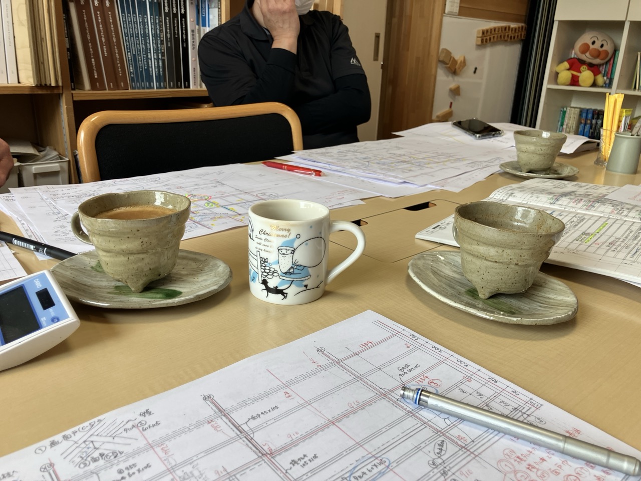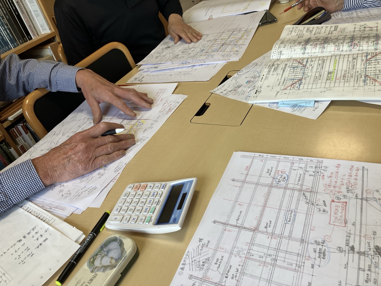 先日行ったプレカット打ち合わせに続いて、第2回プレカット打ち合わせを開催。構造も結構複雑なため、一度プレカット図を訂正して再度臨む打合せです。化粧構造材のモルダーの仕上具合が気になるのでK北プレカットのm野さんが実物の端材を持ってきてくれました。