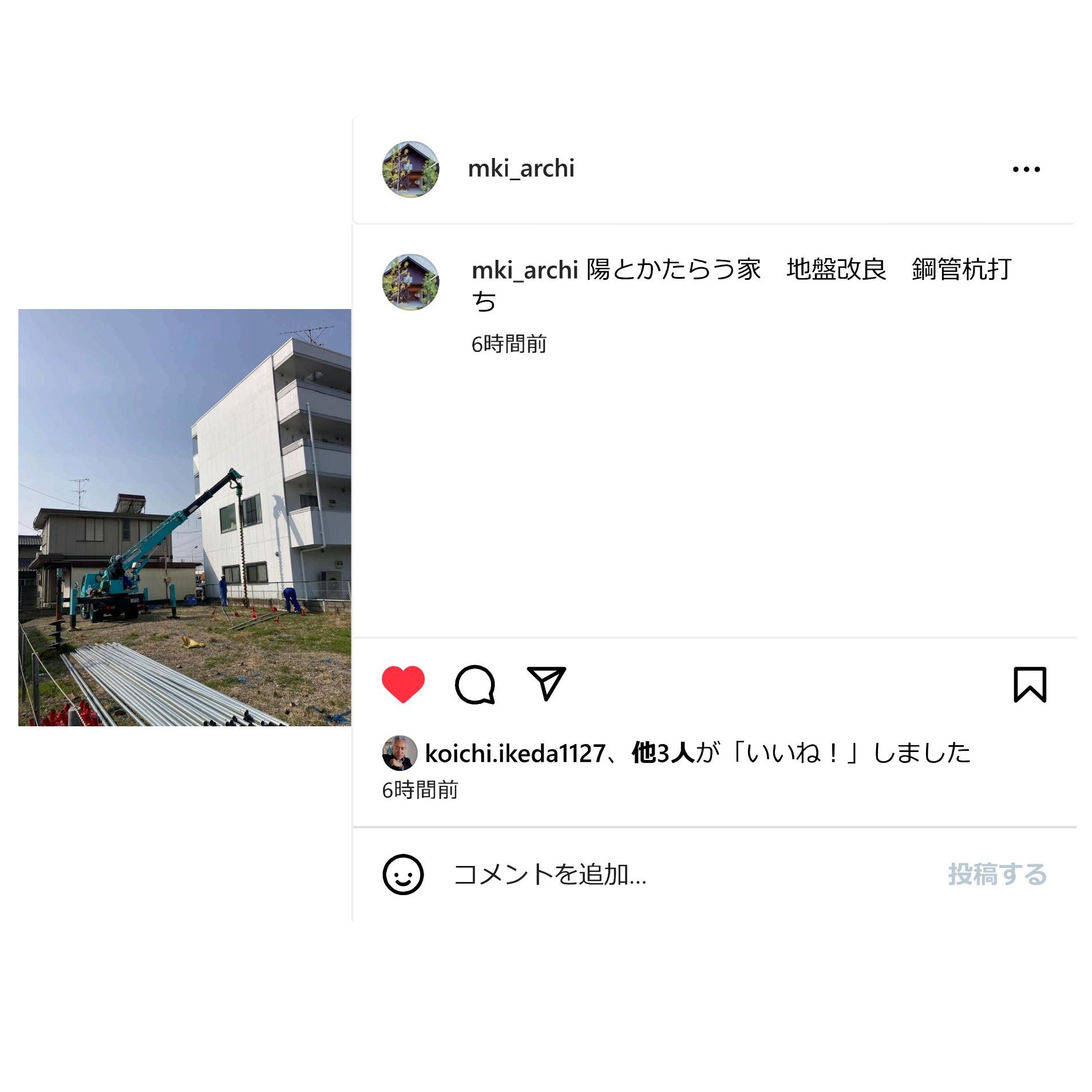 地盤改良工事が始まりました。ミノワでは滅多に(まったく)見かけない鋼管杭工法です。大垣市はミノワ江南営業所から比較的遠方でそこまで頻繁に現場に行けないため、m井設計士さんが事務所が近いので現場へ見に行っていただいているようです。Instagramの投稿をスクショしましたのでぜひフォローをお願いします。