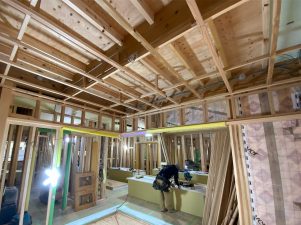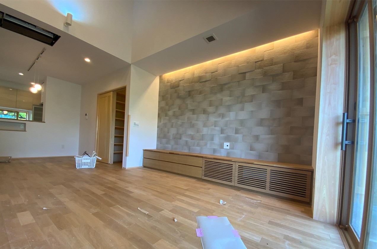 今回の現場は勾配天井のあるLDKと和がとつながっており、広々とした空間のある平屋建てです。