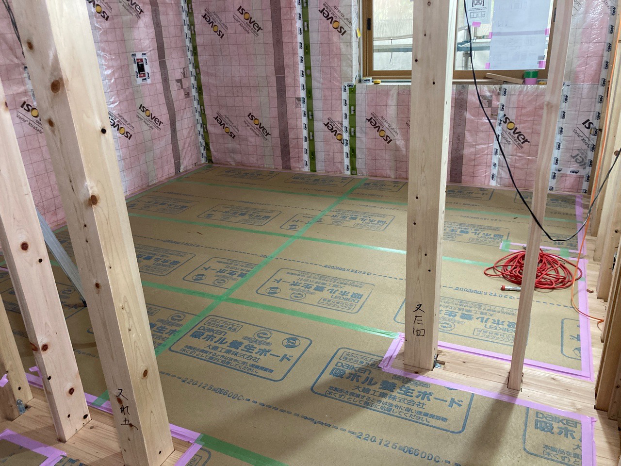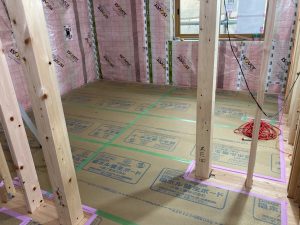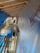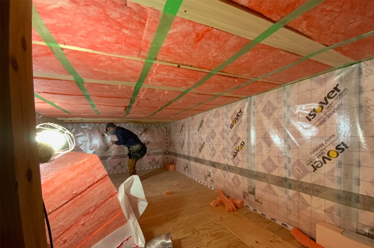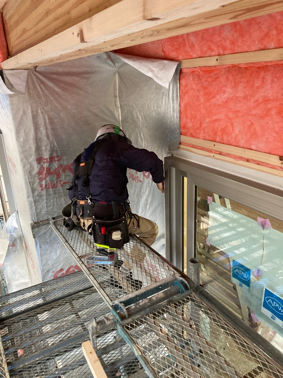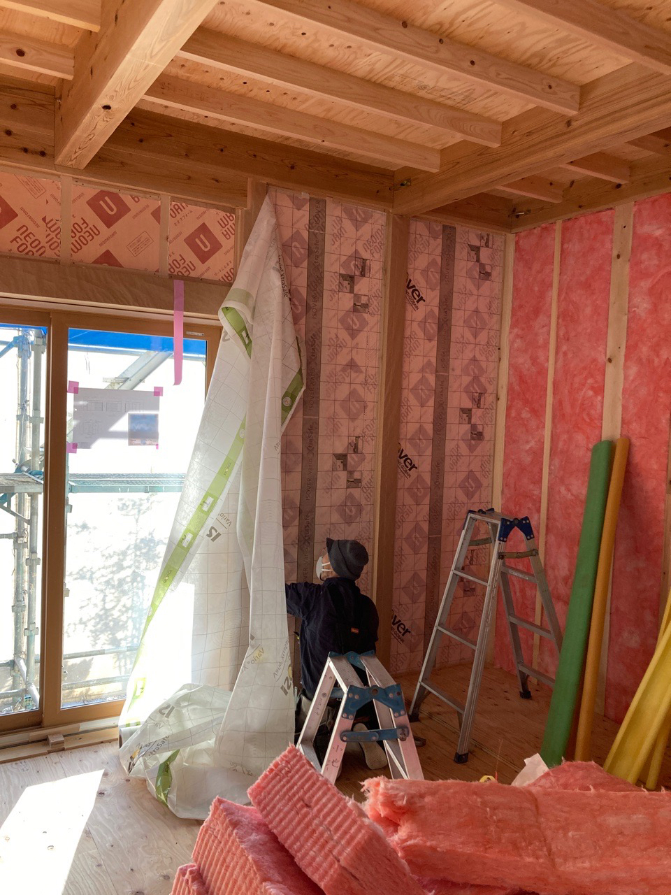 外部の断熱材を充填後、透湿防水シートが貼られました。内部も隙間なく断熱材が充填され、この後調湿気密シート(気密性を高め、結露しないように余分な湿気を外に出す)を貼っていきます。
