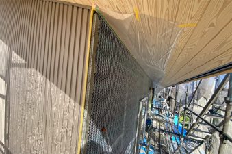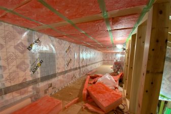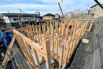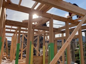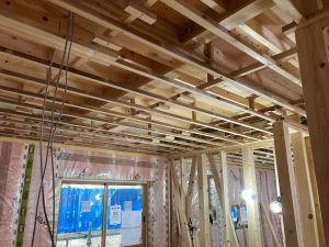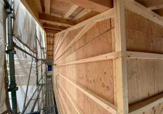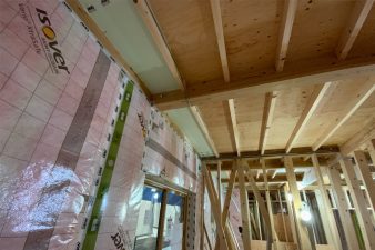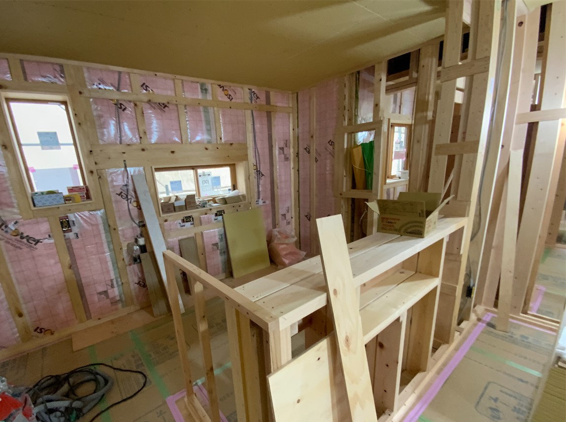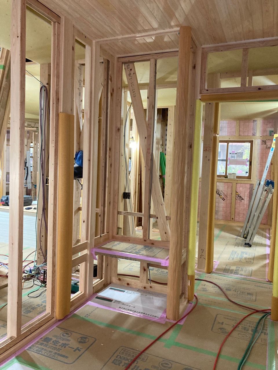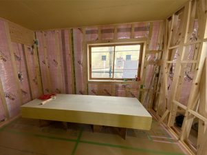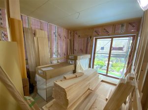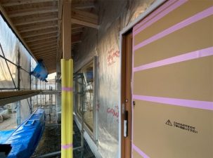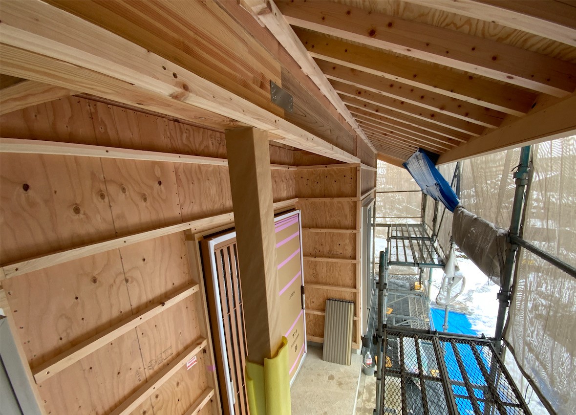 外部の断熱材を充填後、透湿防水シートが貼られました。内部も隙間なく断熱材が充填され、この後調湿気密シート(気密性を高め、結露しないように余分な湿気を外に出す)を貼っていきます。