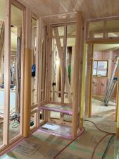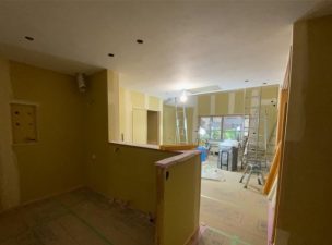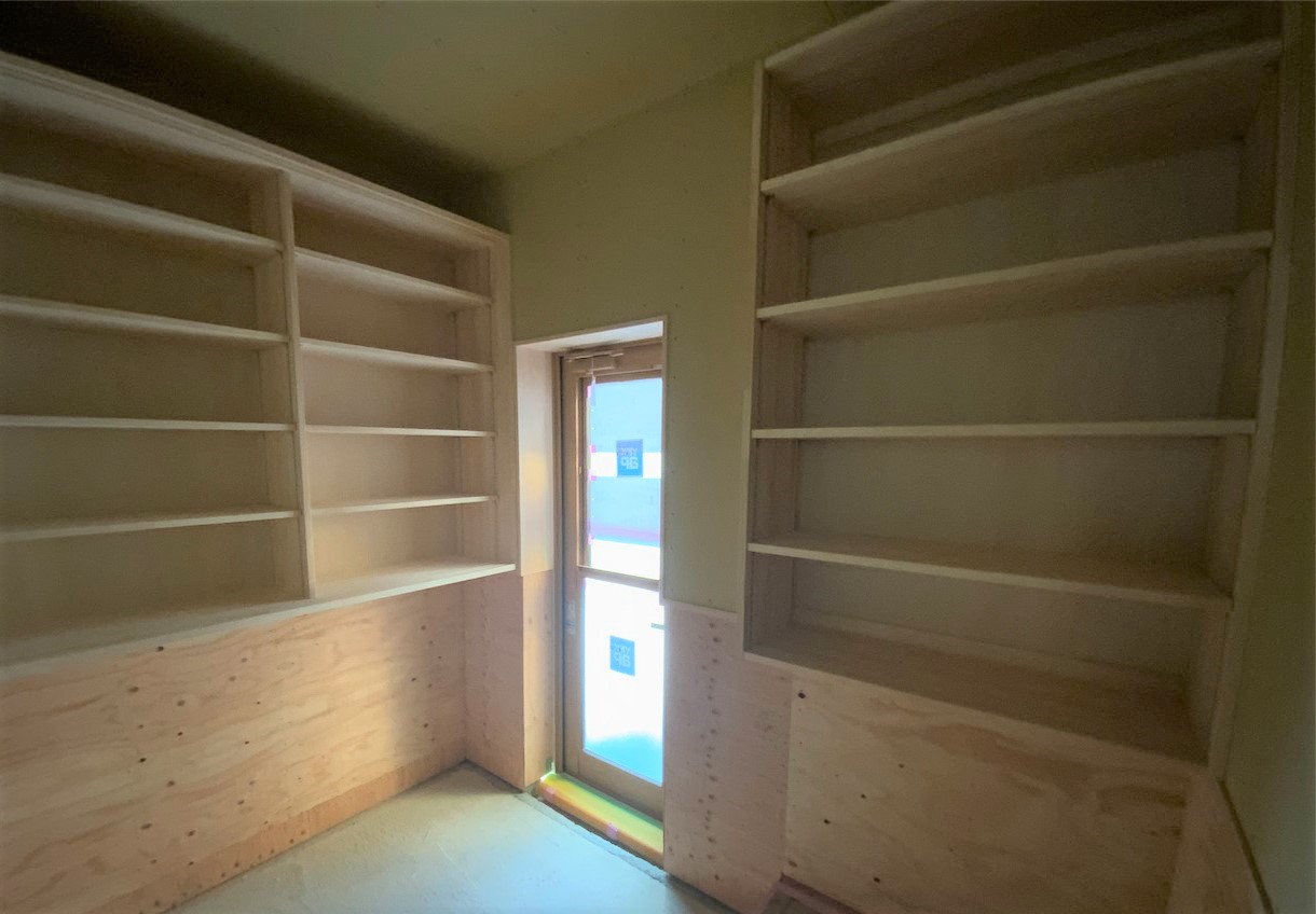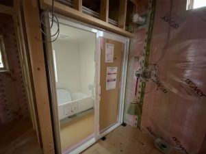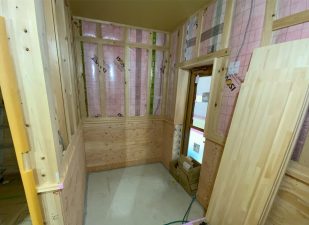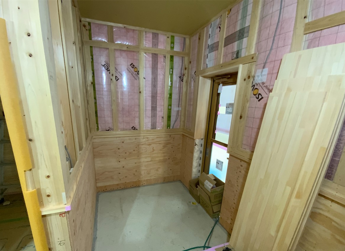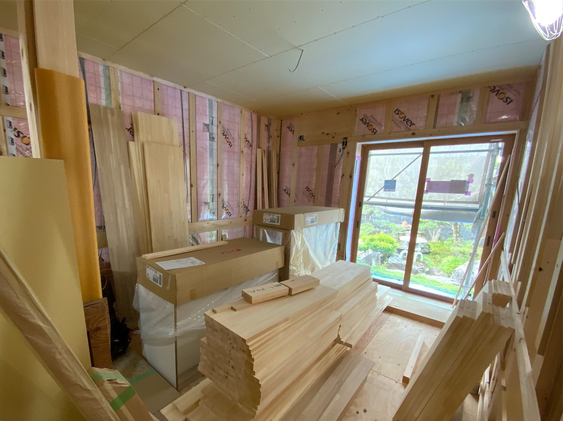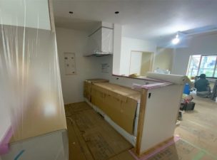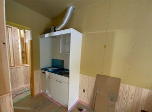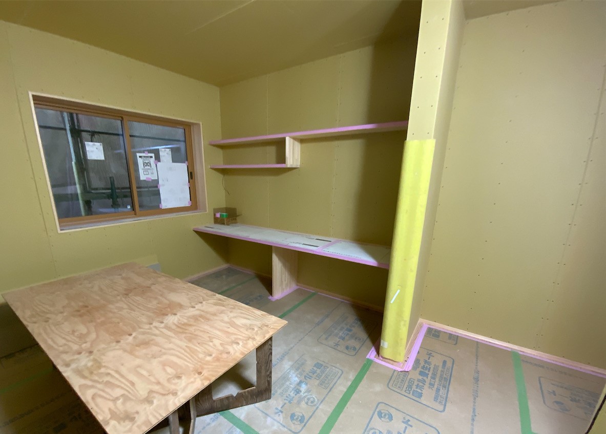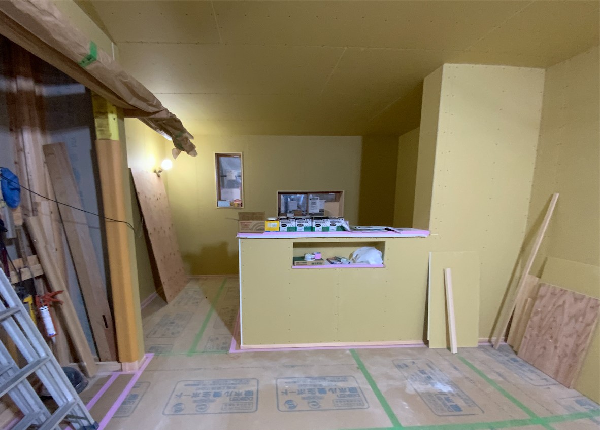 壁のプラスターボードが張り進められ、住まわれてからの広さや高さなど雰囲気が分かるようになってきました。プラスターの色が白系の仕上げに変わるとお部屋全体がさらに明るくなります。ミニキッチンも取り付けられ、これから可動棚など収納内の造作に入ります。