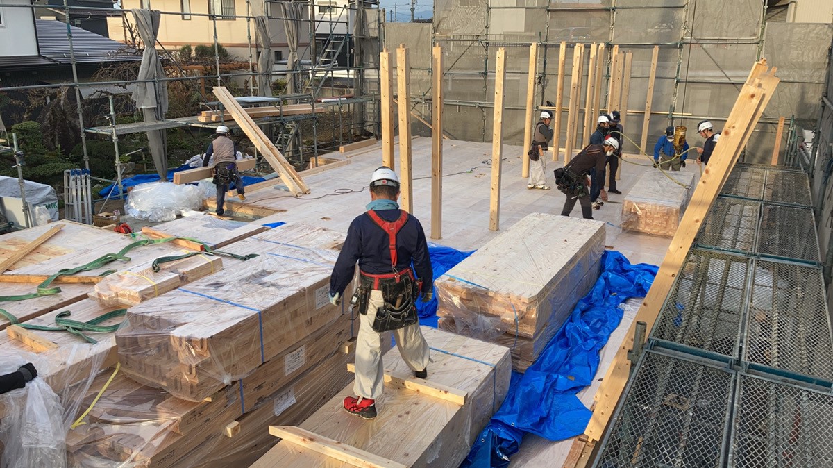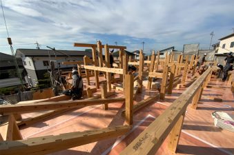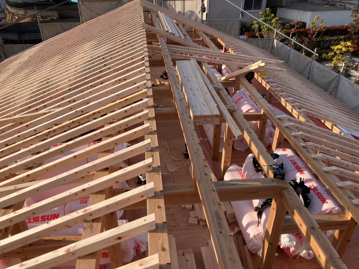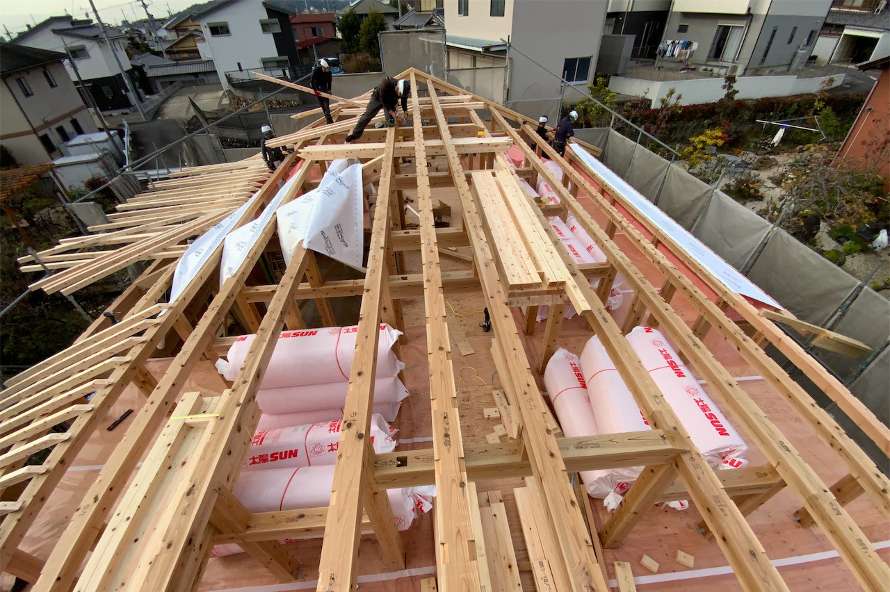 一日目、柱をたて梁かけ、広い面積の小屋裏部分ににツシゴ合板を敷いていきます。小屋束・母屋の取付後、2日目はクレーンによって搬入された屋根の断熱材を充填しながら、平行して垂木付け施工を手際よく進めていきます。