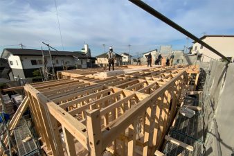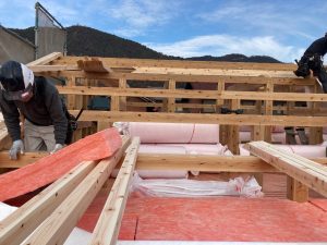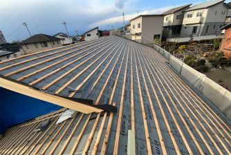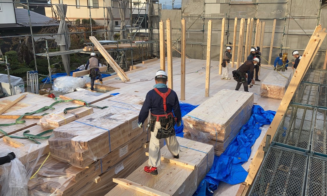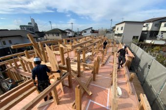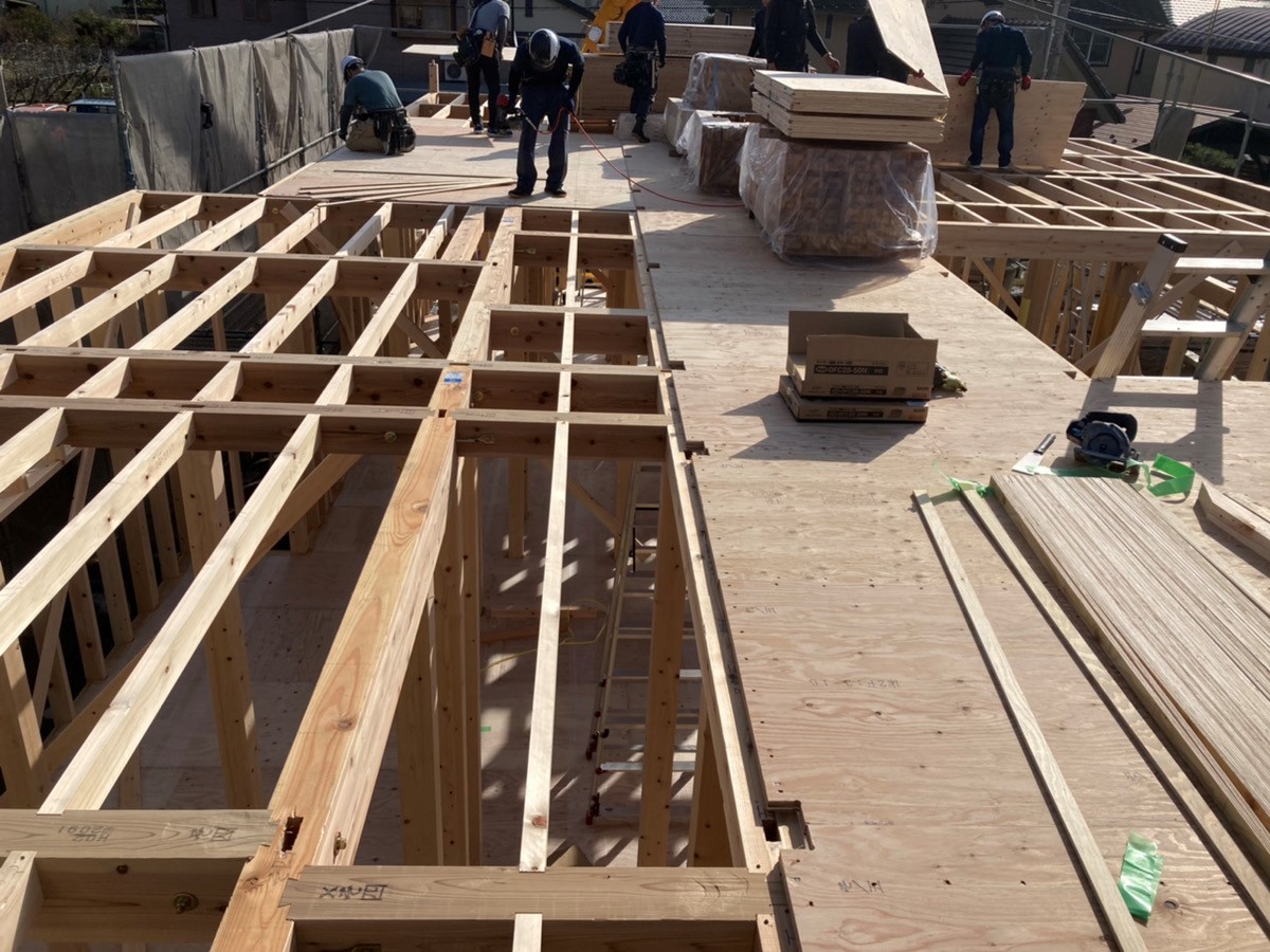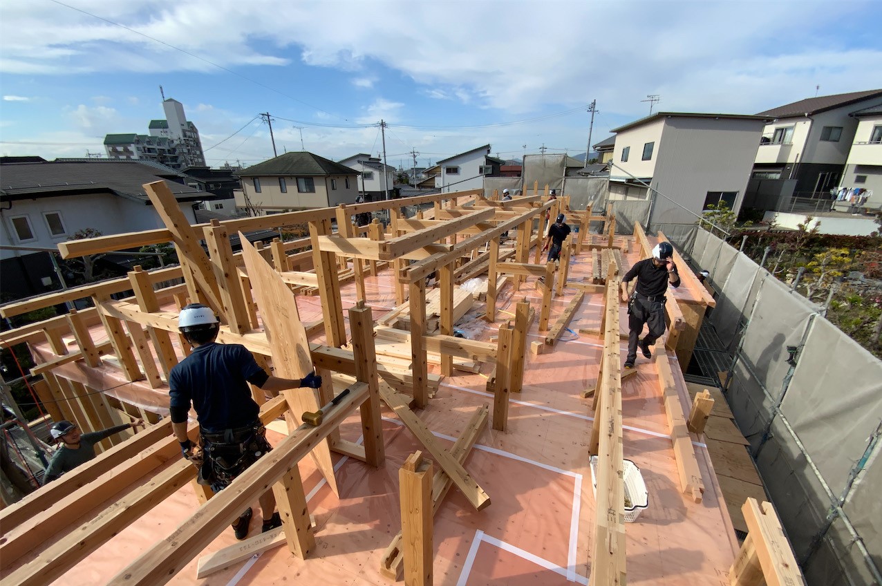 一日目、柱をたて梁かけ、広い面積の小屋裏部分ににツシゴ合板を敷いていきます。小屋束・母屋の取付後、2日目はクレーンによって搬入された屋根の断熱材を充填しながら、平行して垂木付け施工を手際よく進めていきます。