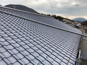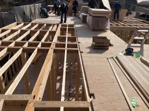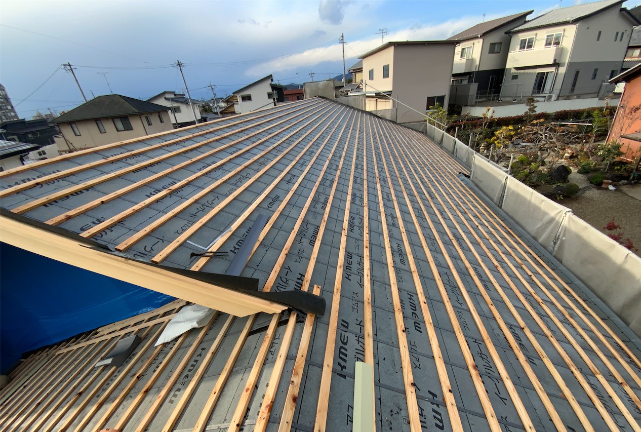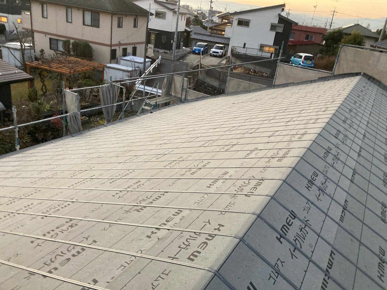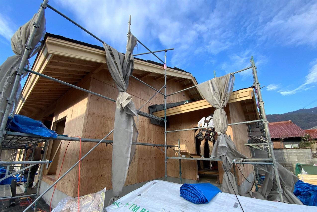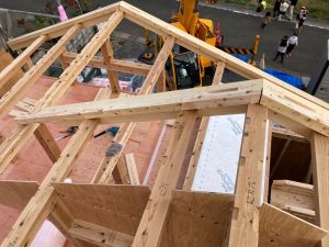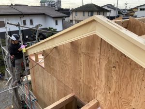 大きな破風は先に工場で加工してあるものを現場で屋根の形につなげて取り付けます。目標の屋根ルーフィングを敷き、作業が完了しました。
