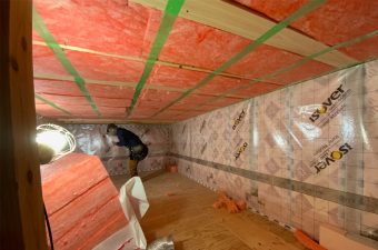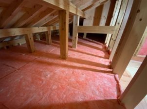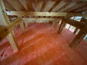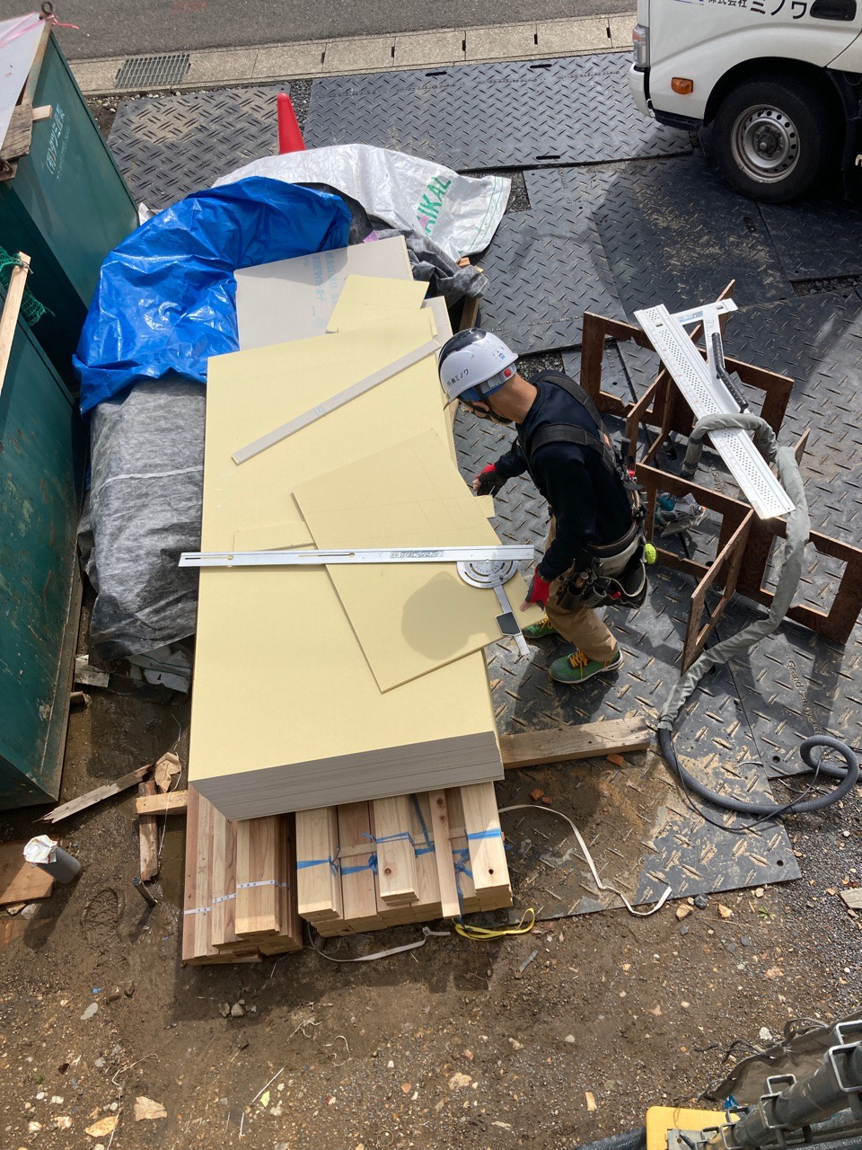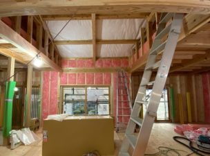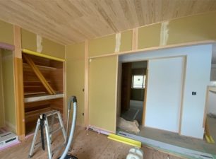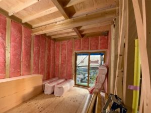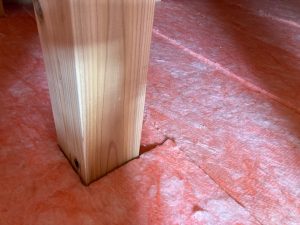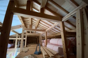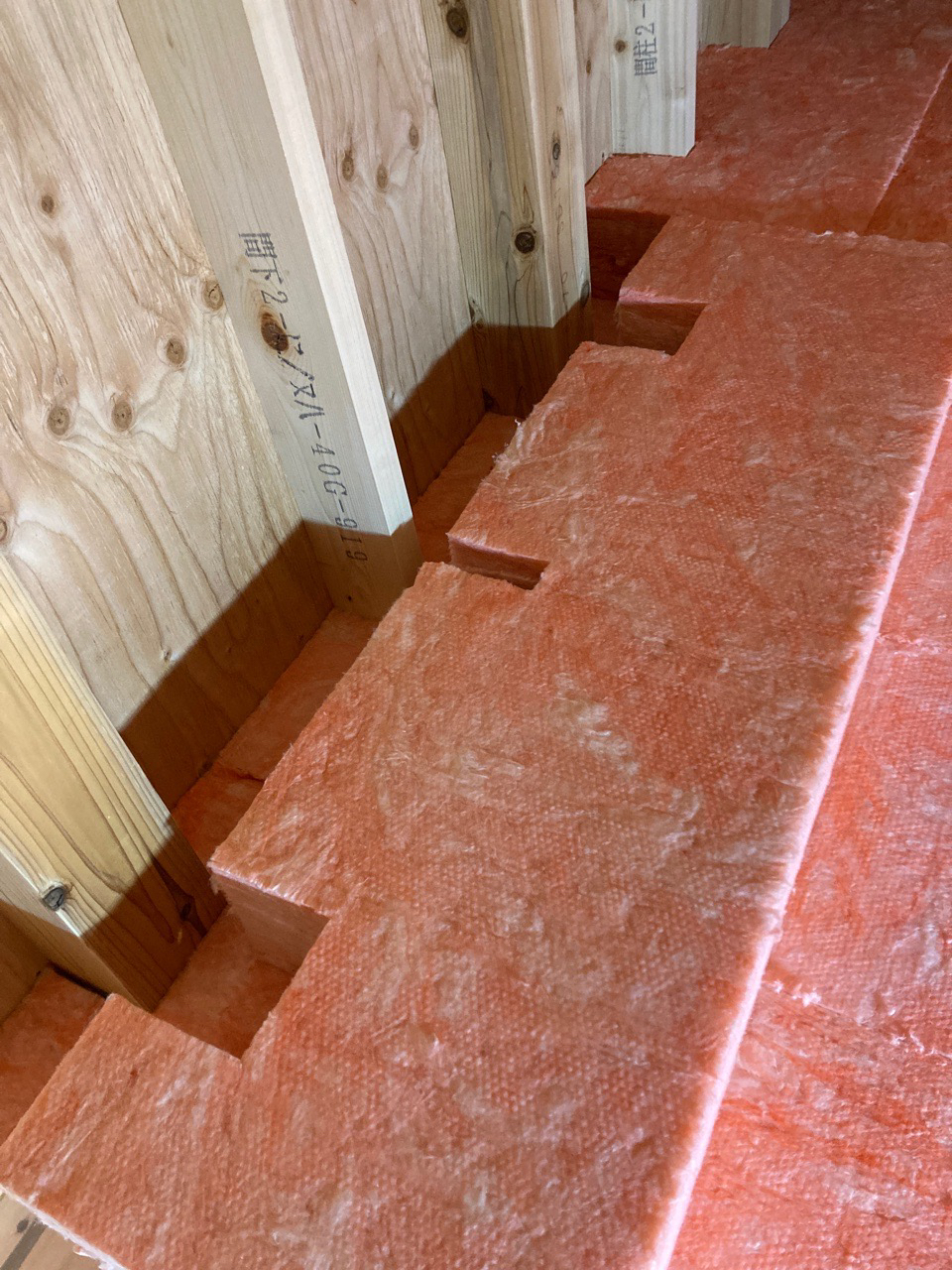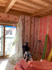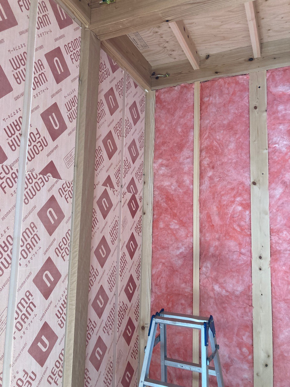 内壁には厚み120㎜の高性能グラスウール、真壁部分には厚みが80㎜のもので、薄くても断熱性の良いネオマフォームを使用します。小屋裏(厚み155x2段積)の断熱施工も進んでいます。押さえつけると断熱性能が落ちてしまうので、柱などの部分はきれいに切り欠かきながら充填していきます。外壁には断熱下地が施されました。