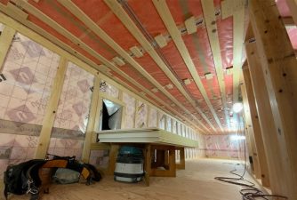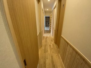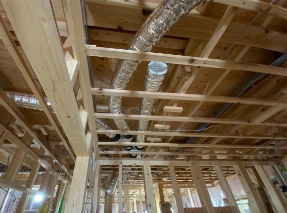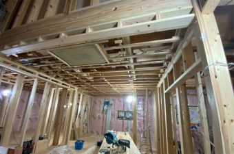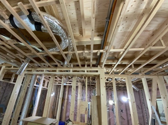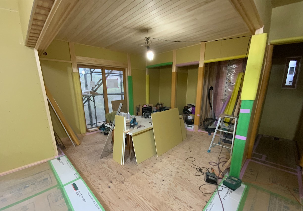 天井にプラスターボード、腰板張りも進んでいます。エアコンやキッチン周辺などに必要な下地が取り付けられました。