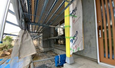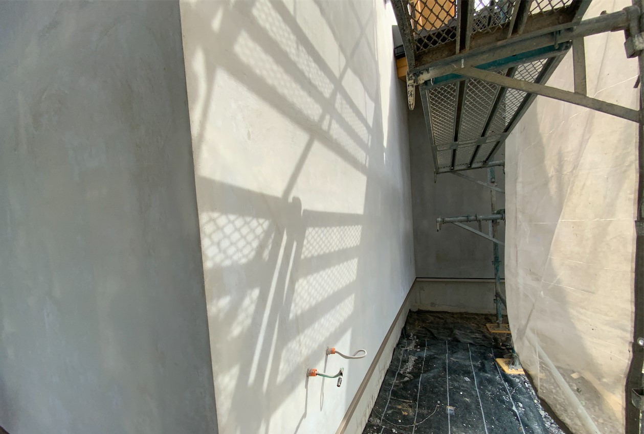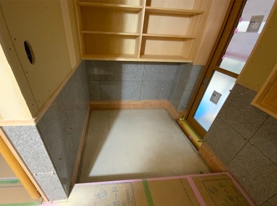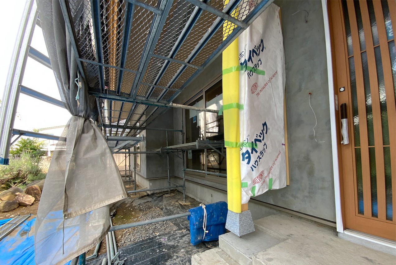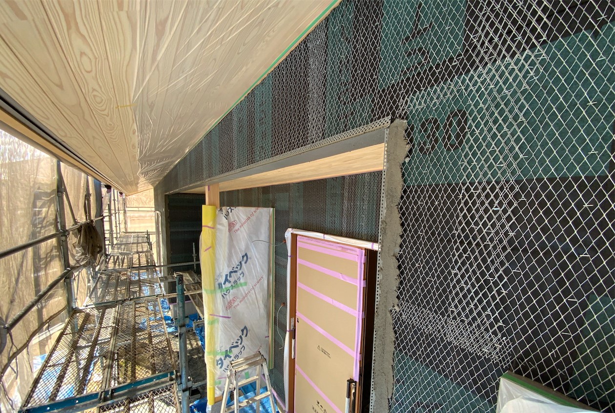 外壁はラス網の上からモルタル下地が施されました。この後弾性リシンを吹き付けていきます。玄関壁の珪藻土塗りや、勝手口の壁の御影石貼り(ワンちゃんスペースになります)など、内部の左官工事も進んでいきます。