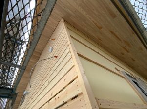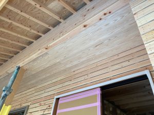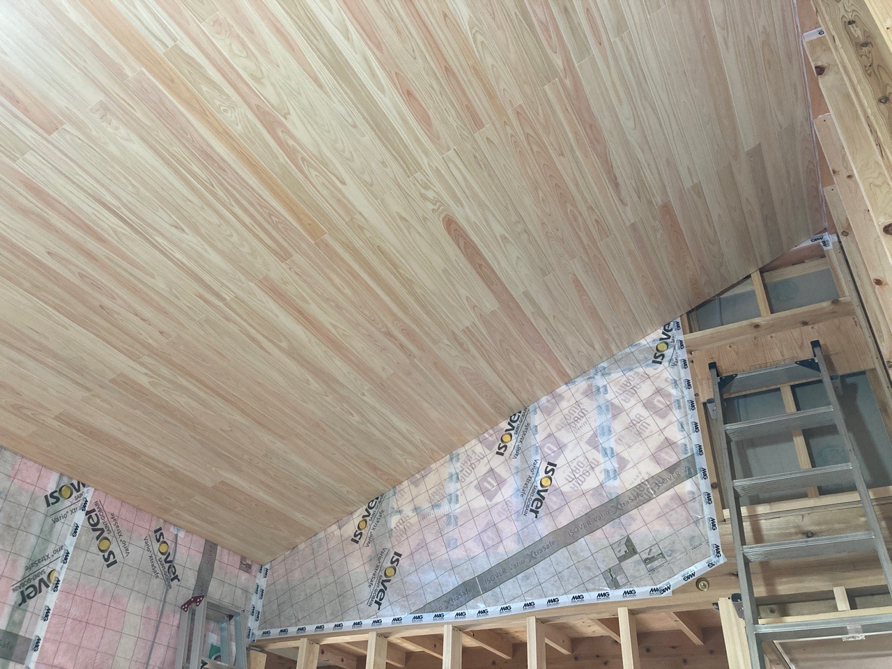 室内の下地が進み、勾配天井には杉板が張られています。色あいのパターンが重ならないように赤みの強いもの、白いものがランダムに張られています。