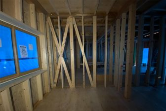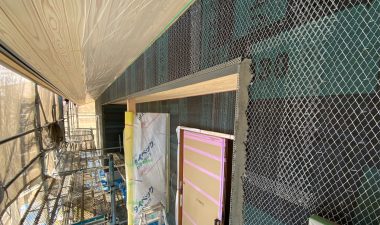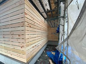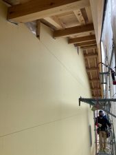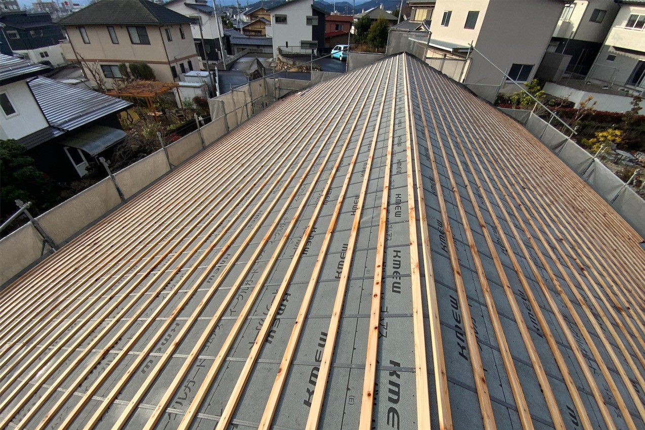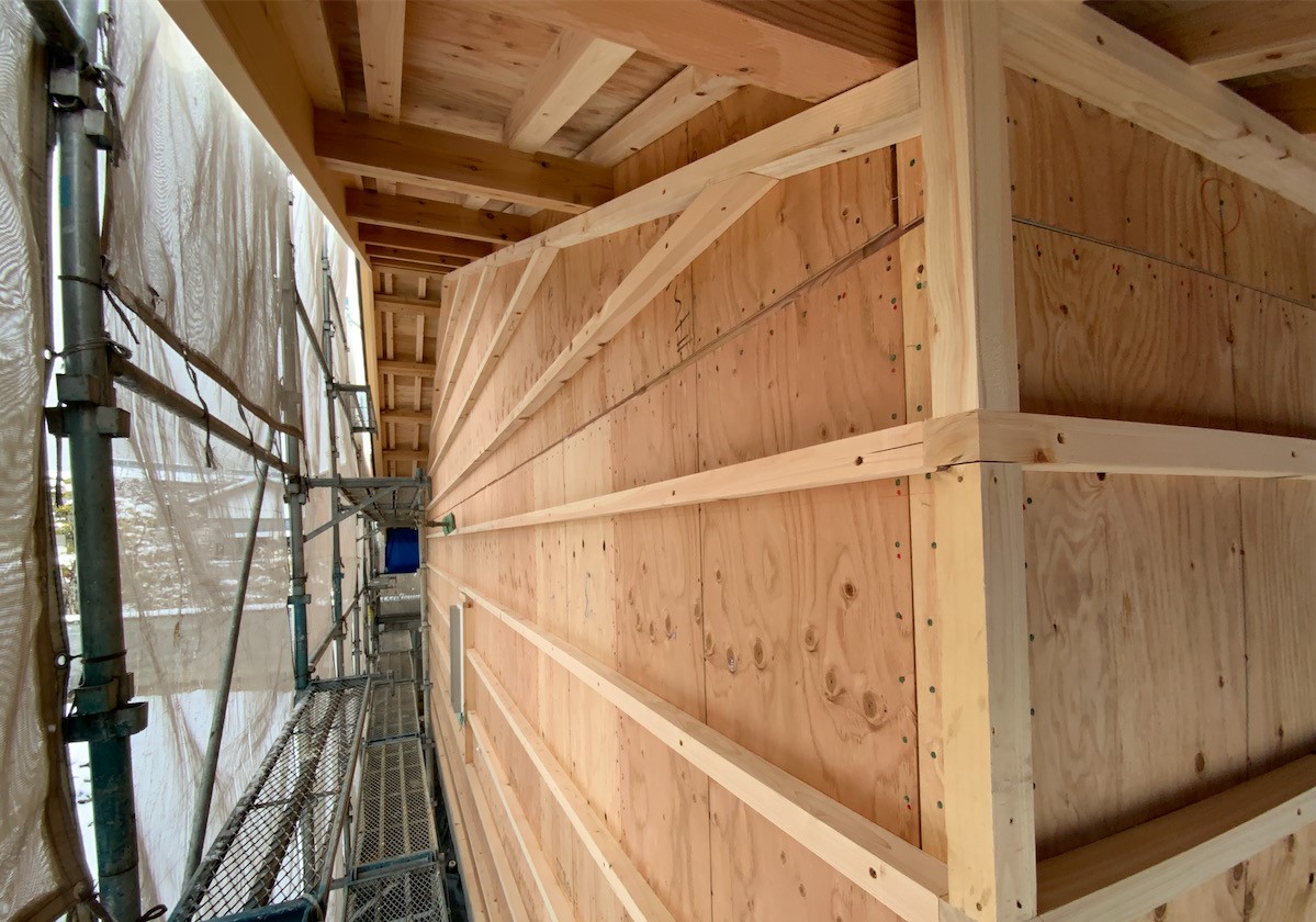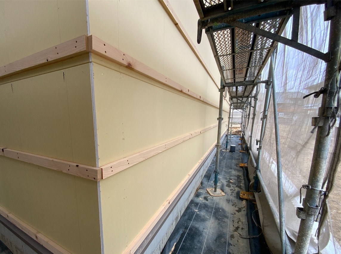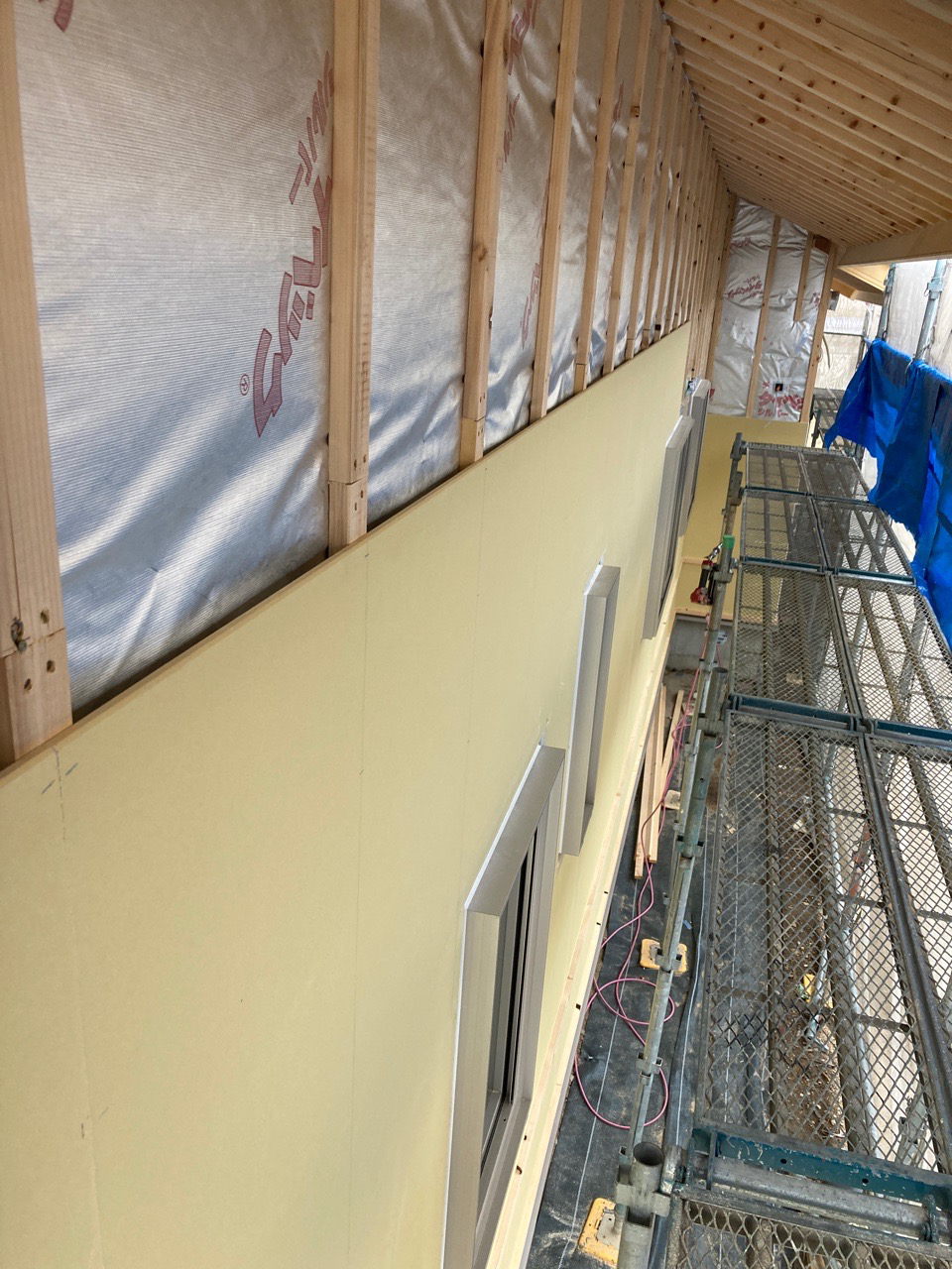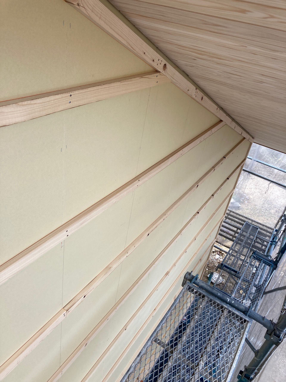 外部プラスターボードには下地胴縁が取り付けられ、この後ガルバリウム鋼板が張られていきます。