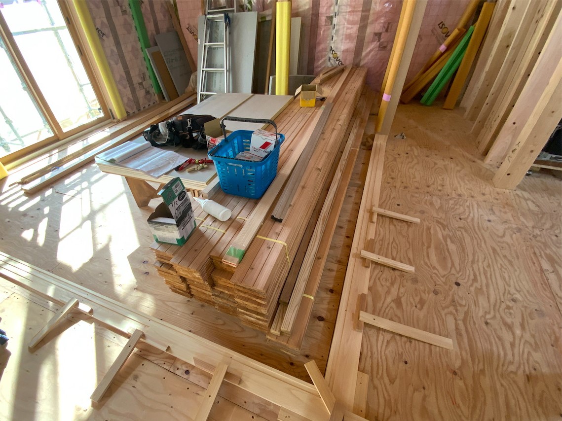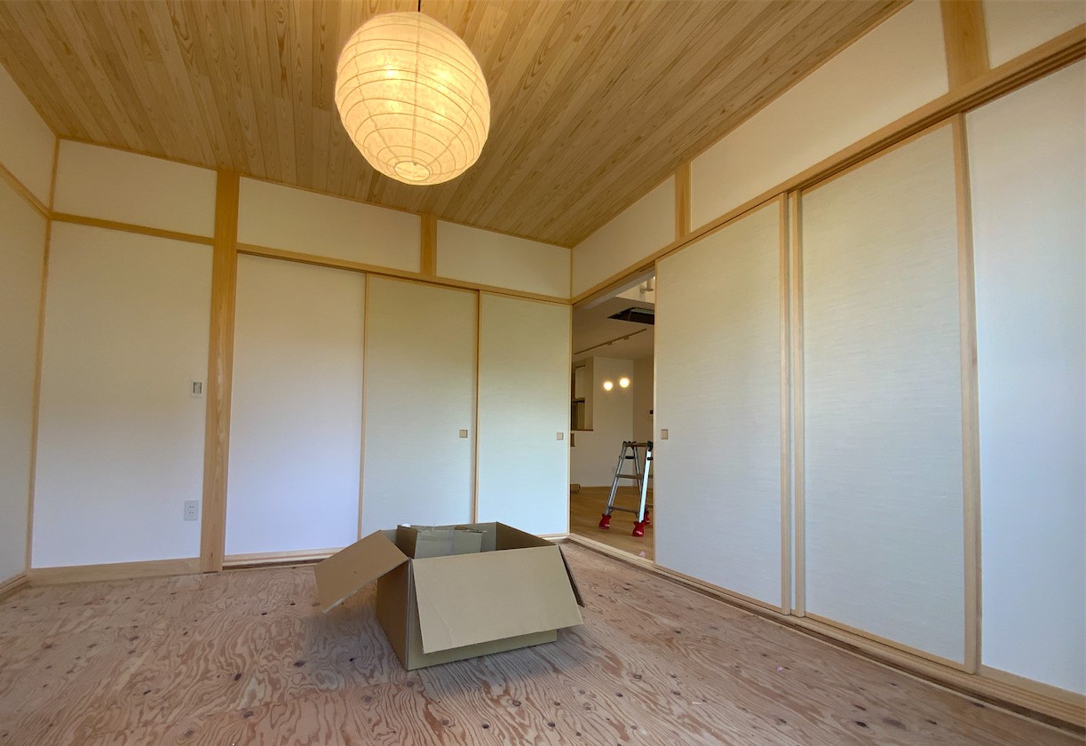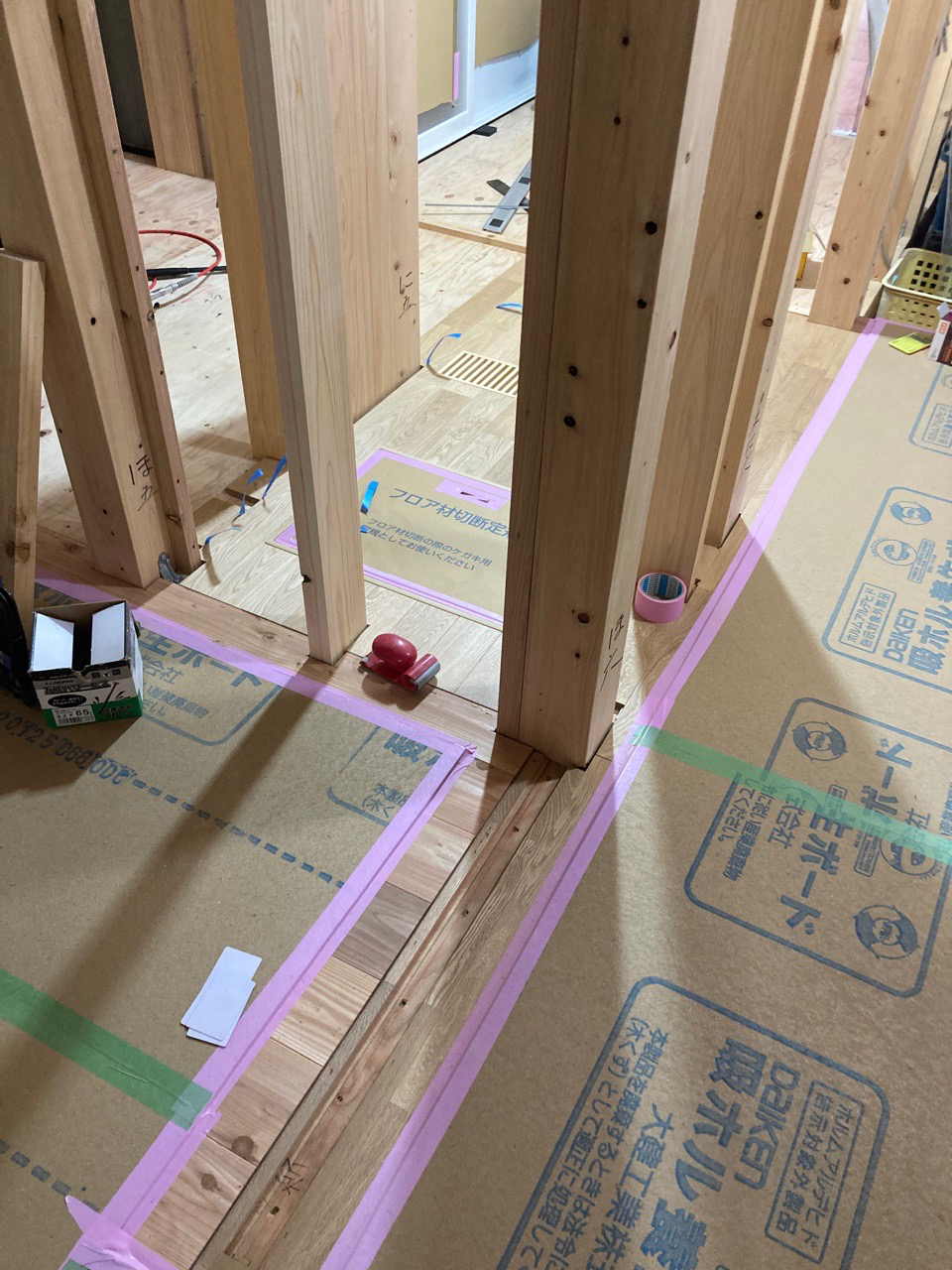 室内は和室の敷居が取り付けられました。建具が止まるように突き止めの溝が入っています。角に柱がないため、両側の建具を開けるとリビングと一体化し、とても広々しています。床はナラ材・杉材が張り進められ丁寧に養生をします。