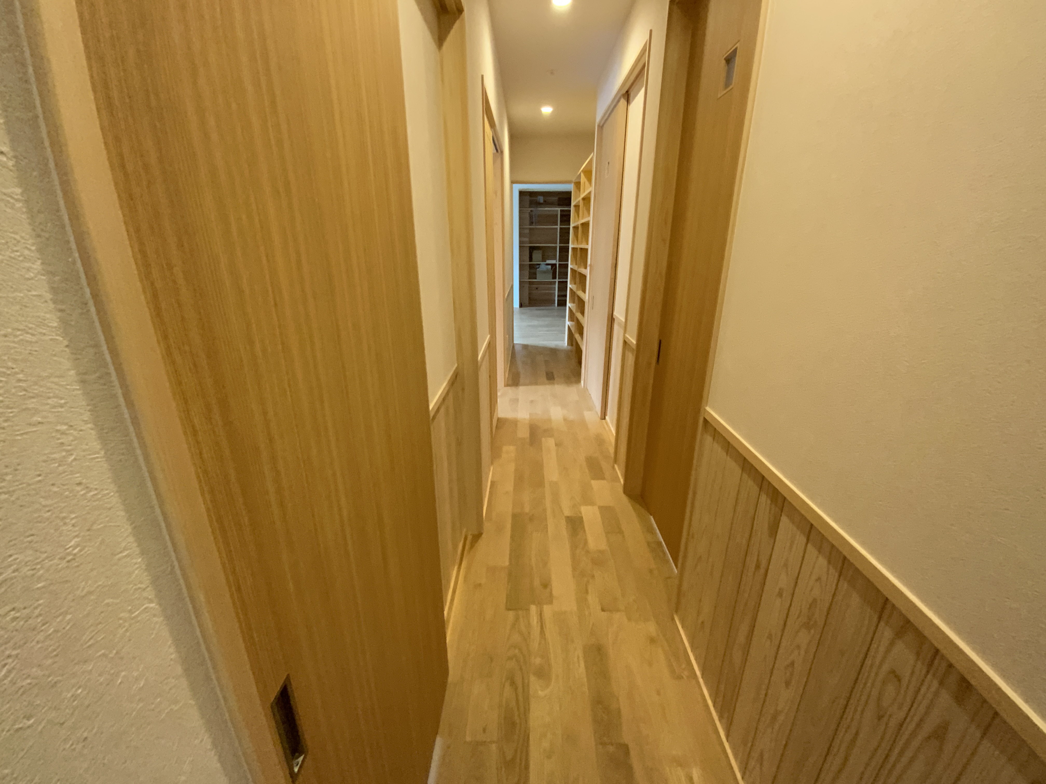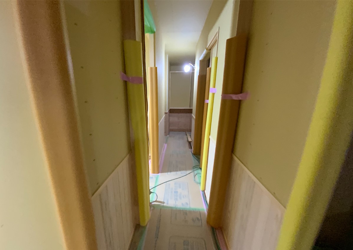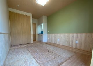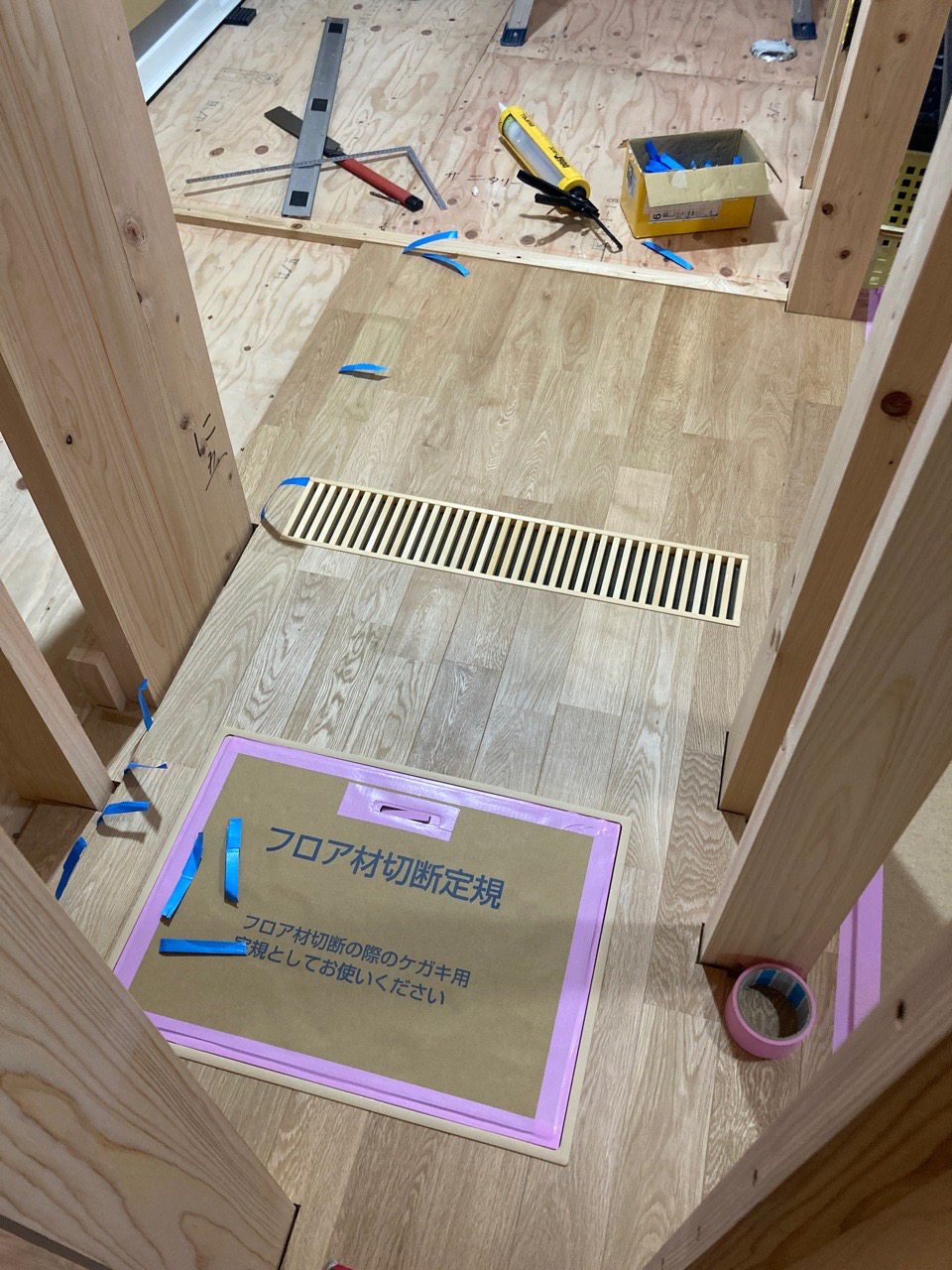 室内は和室の敷居が取り付けられました。建具が止まるように突き止めの溝が入っています。角に柱がないため、両側の建具を開けるとリビングと一体化し、とても広々しています。床はナラ材・杉材が張り進められ丁寧に養生をします。