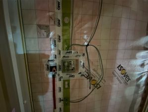 コンセントボックス埋込部にも気密カバー取付の上、気密テープを施工します。施工が進んで見えなくなってしまいますが、金物からの熱橋を防ぐための断熱施工やサッシ枠の隙間など、細部の断熱施工をしっかりすることで高気密・高気密の家が出来上がります。