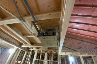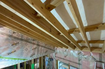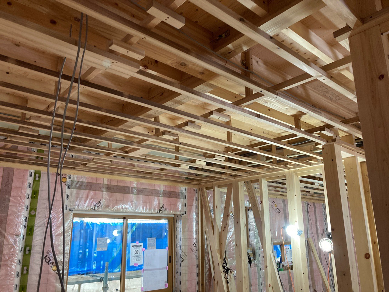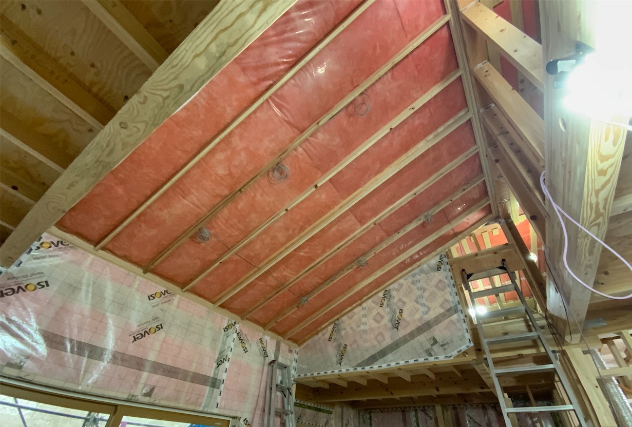 リビング勾配天井も断熱材(厚み105㎜x3段)が充填され、断熱材の下に施されたシートを胴縁で固定します。