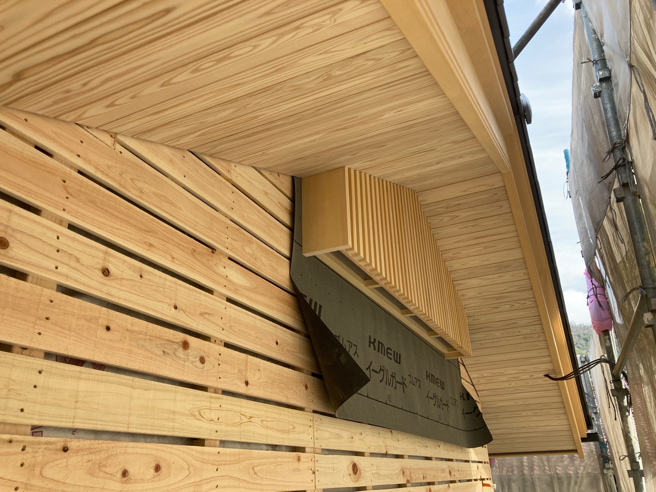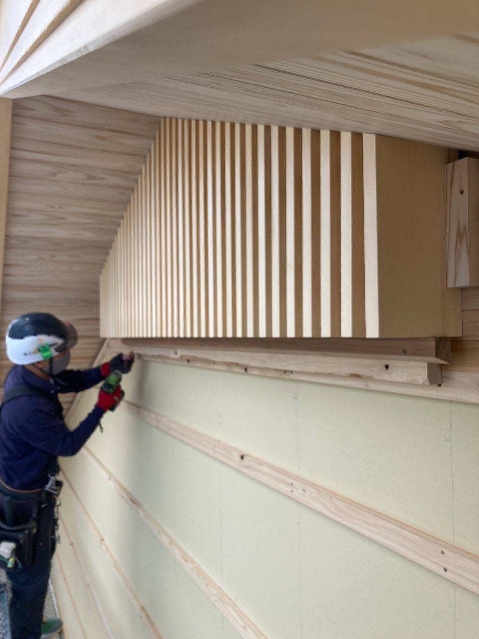妻側の小屋裏換気口に矢切を取り付けています。なかなか近くで見ることがないのですが、意外に大きく幅1間ほどあります。