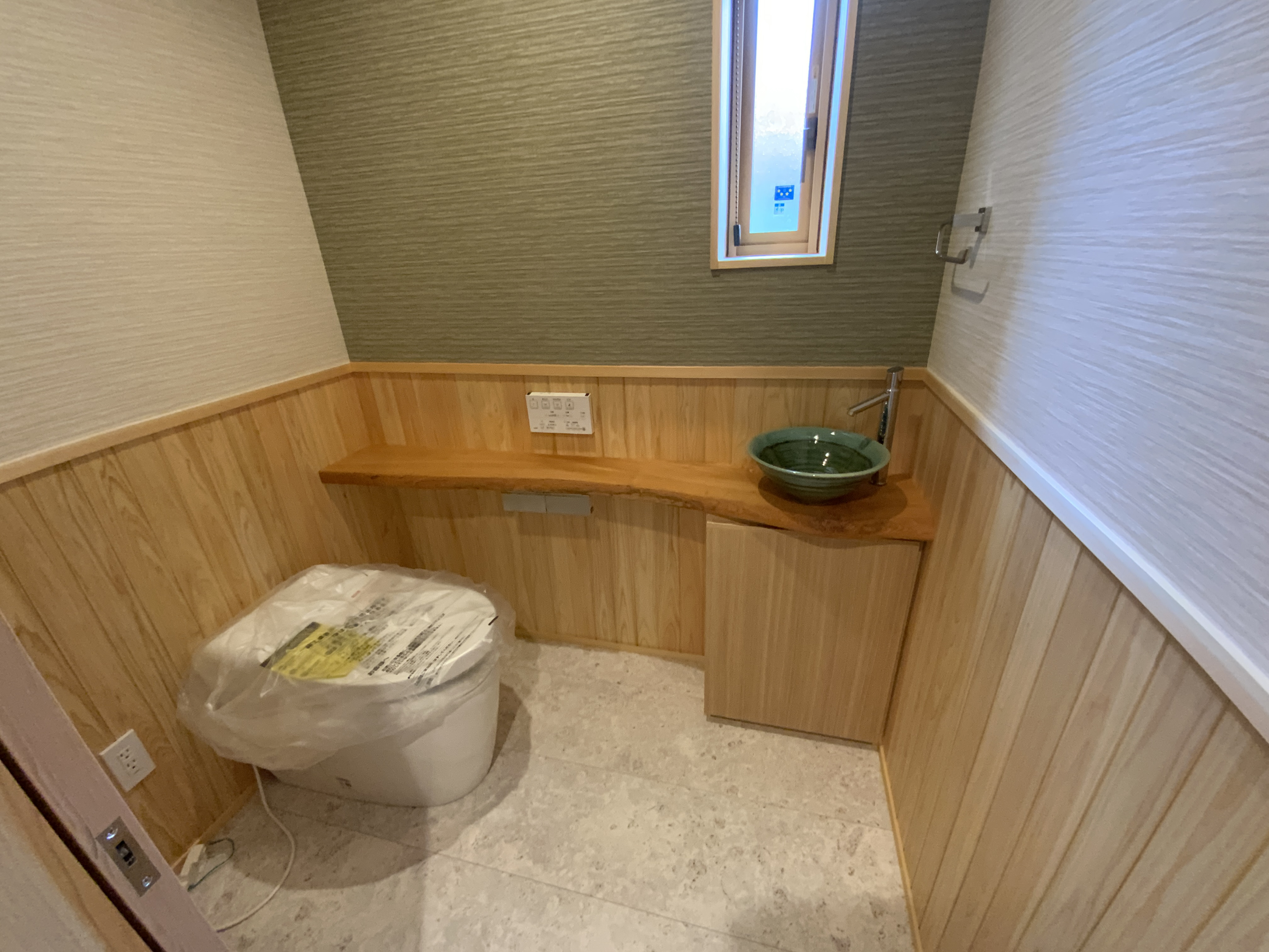 トイレの手洗いカウンターはケヤキ材です。上品な杢目で堅く耐久性があることから、床框や家具にも使われる木材です。画像では節が目立っていますが、ここに排水口の穴が空けられ、手洗いボウルが取り付けられます。