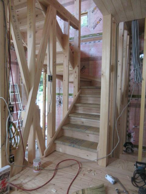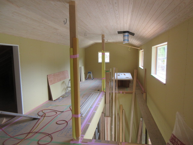 室内の天井には優しい色合いの杉羽目板が張られました。階段一段目は約2畳分の小上がりになっており、腰かけて本を読むなどちょっとしたくつろぎスペースになりそうです。外部は防水シートの上から木下地が取り付けられています。