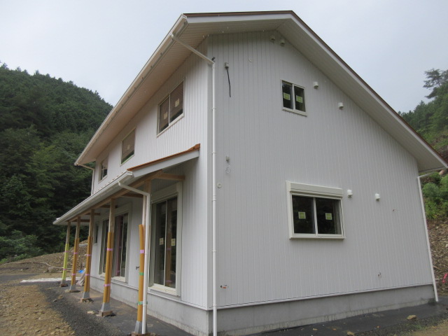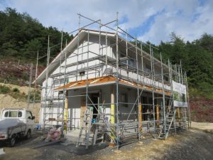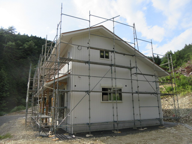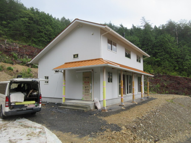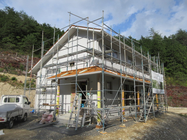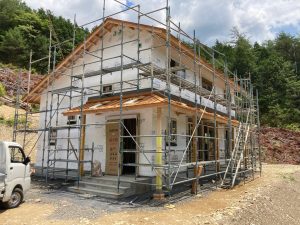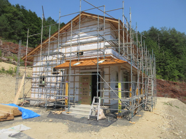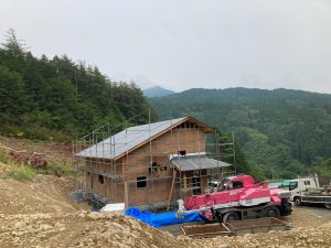 外部は透湿防水シート貼りが完了しました。山々に囲まれ、こんな青空の日はオレンジ色の屋根がとても映えますね。