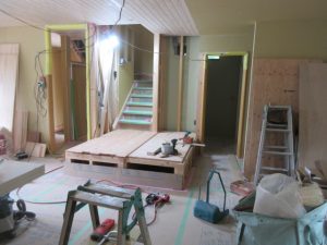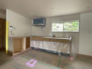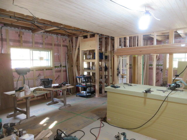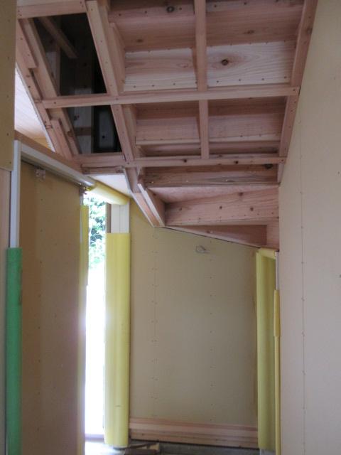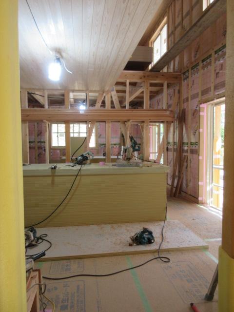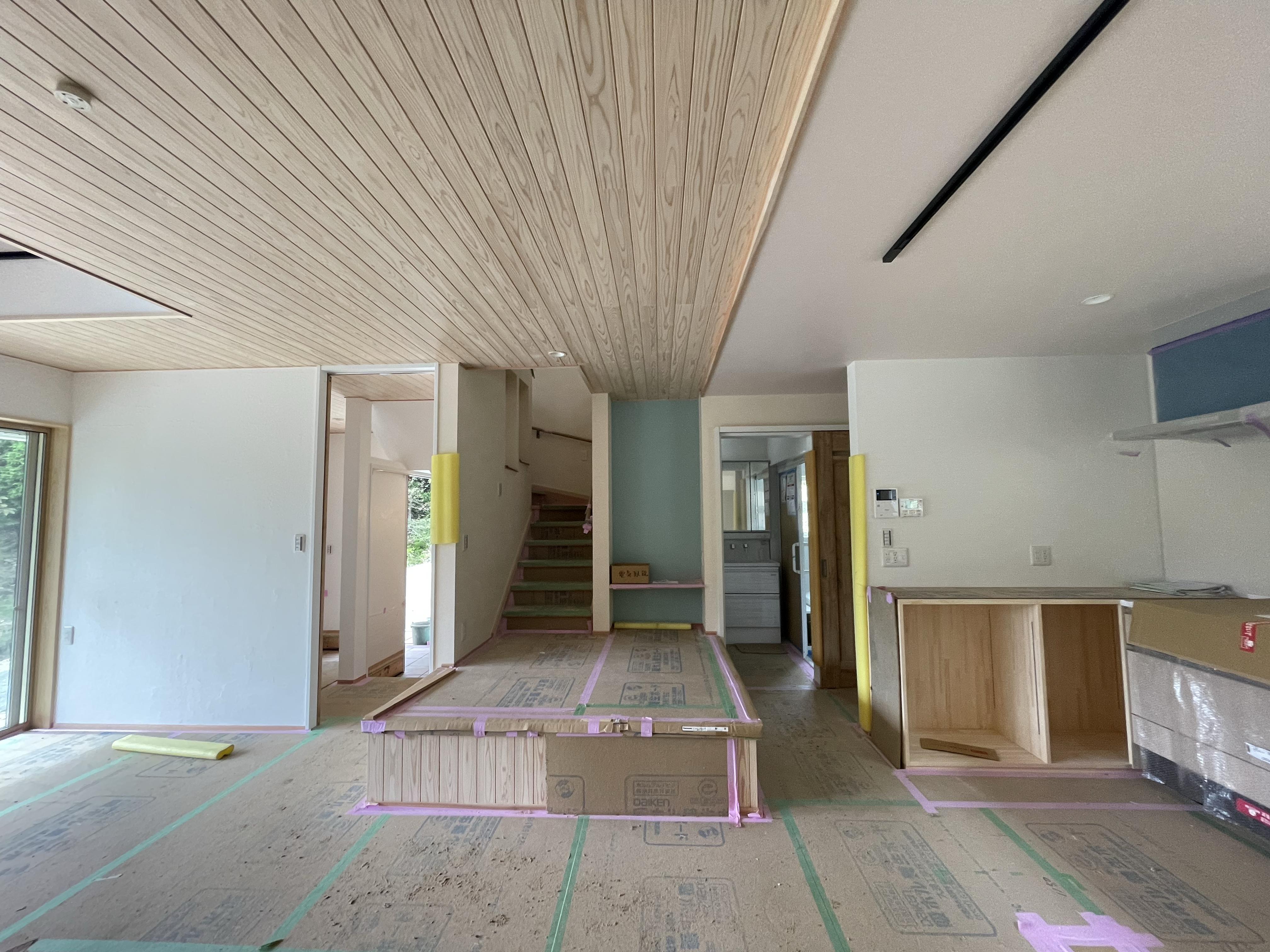 室内は壁のプラスターボードを張り終えお部屋の広さがイメージしやすくなりました。天井はクロス貼り部分に下地を取り付けています。
