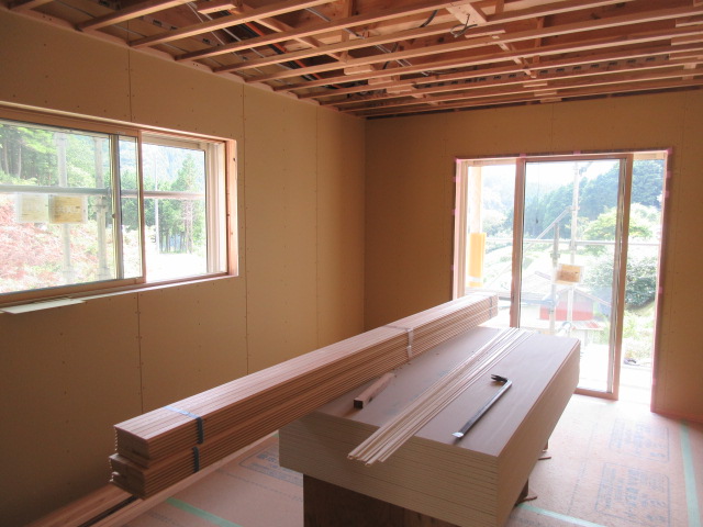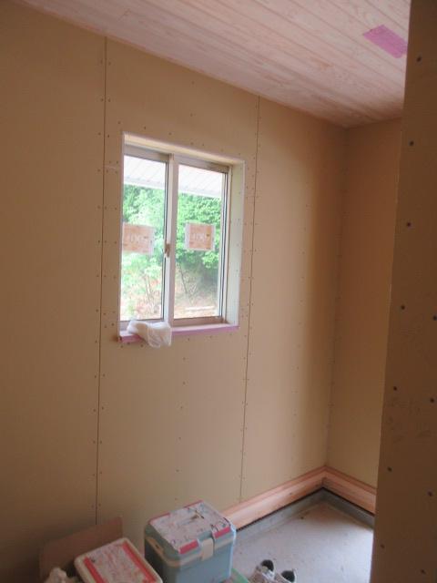 内部にはプラスターボードが積み上げられ、壁のボード張りが進んでいます。