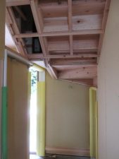 中窓は窓台(下部のみ)なのですっきりしたイメージ、掃き出し窓はサッシを囲むように3方枠でメリハリがあります。まだプラスターボードの色ですが、壁が仕上がると枠の形状や色で大分印象が変わります。天井は下地取り付け後、プラスターボード張りが進んでいます。
