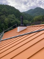 足場が撤去され、すっきりとしています。屋根には煙突が取り付けられ、これが室内の天井から1階の薪ストーブへとつながります。