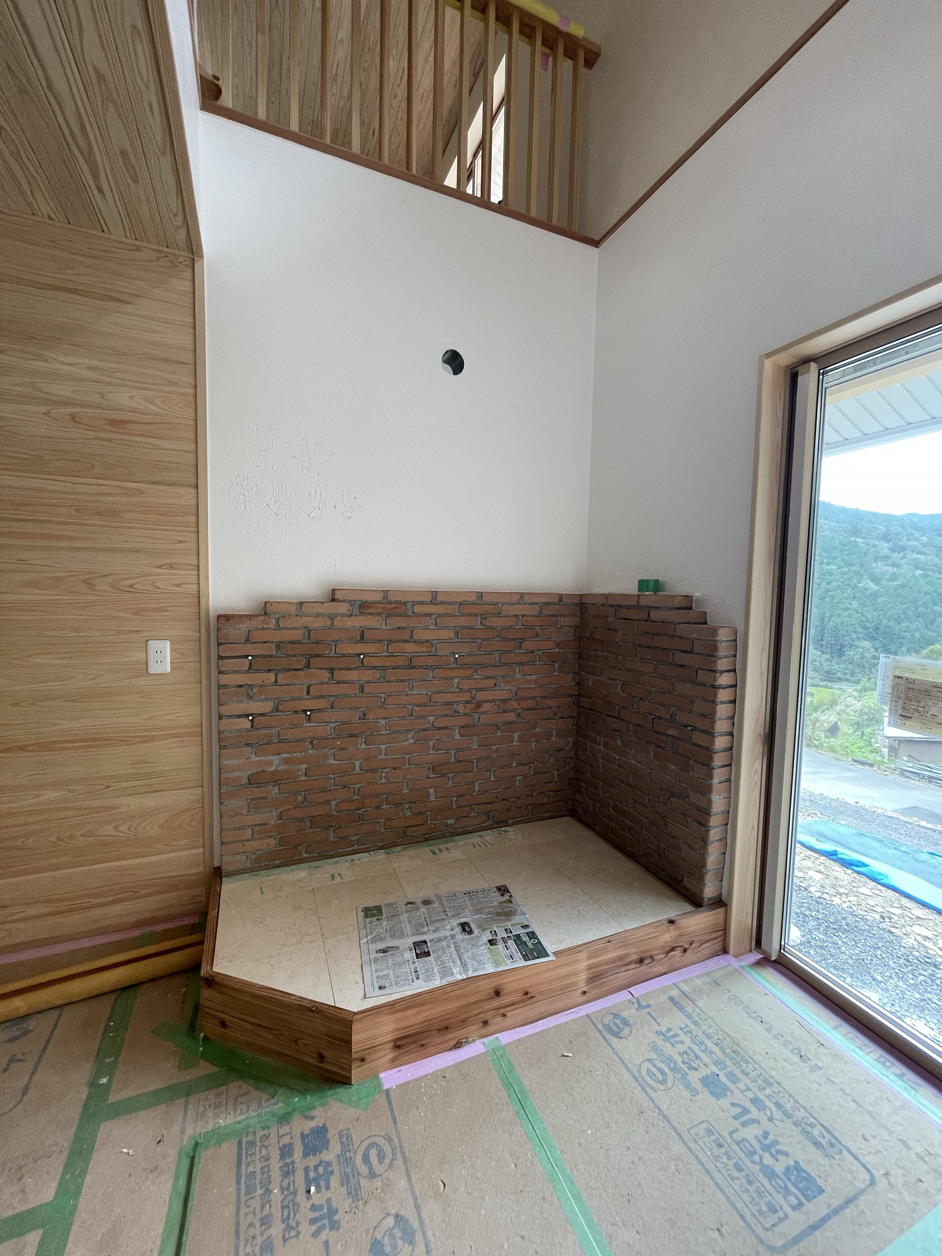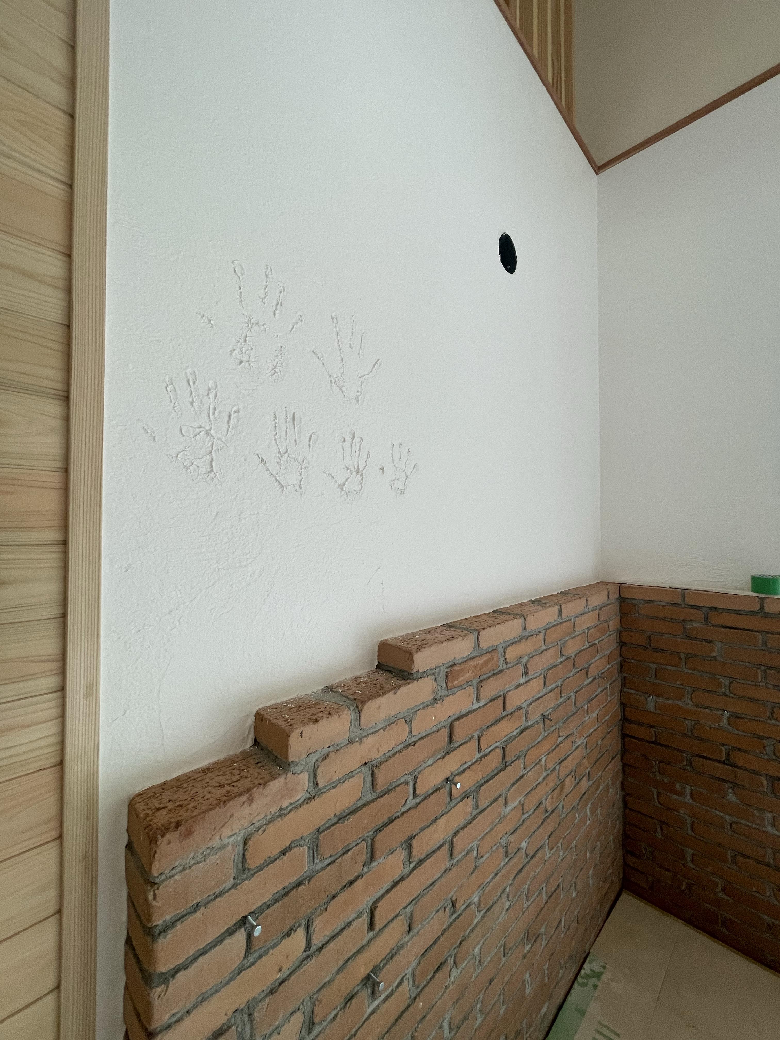 薪ストーブまわりの壁にレンガの上には…5つの手形が並んでいました。このかわいらしい小さな手形を見るたびに家づくりの思い出と、お子様の成長を感じることができますね。