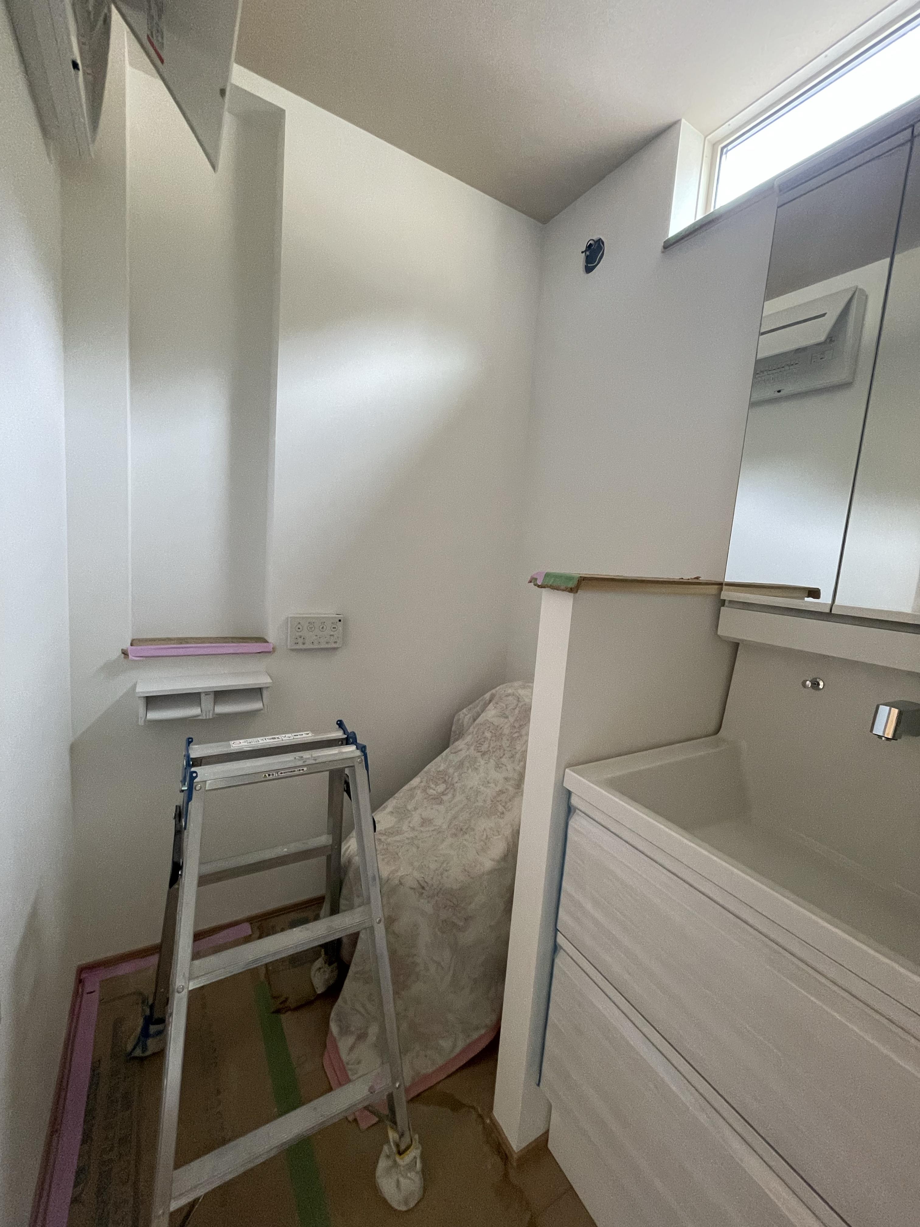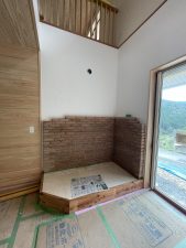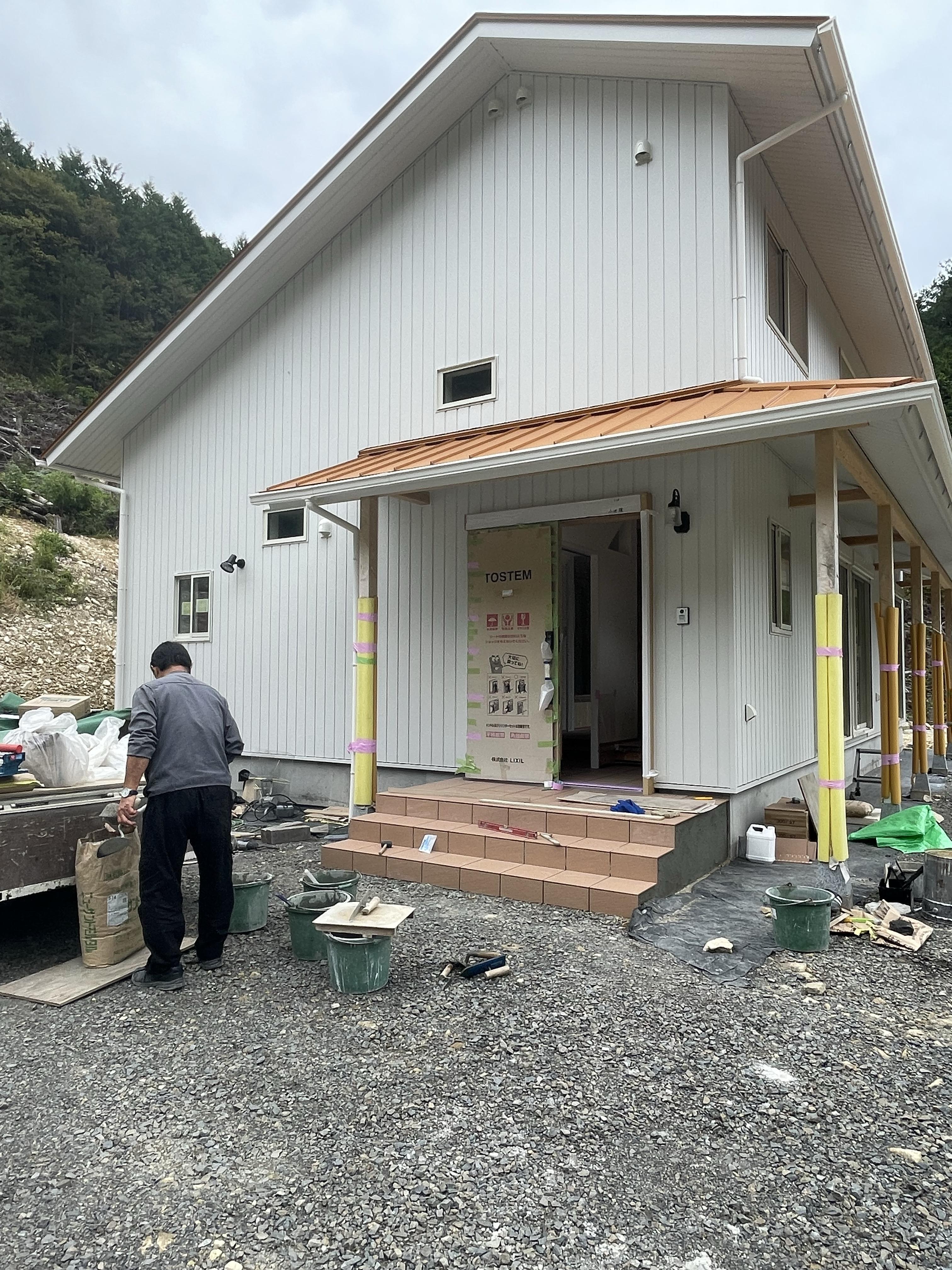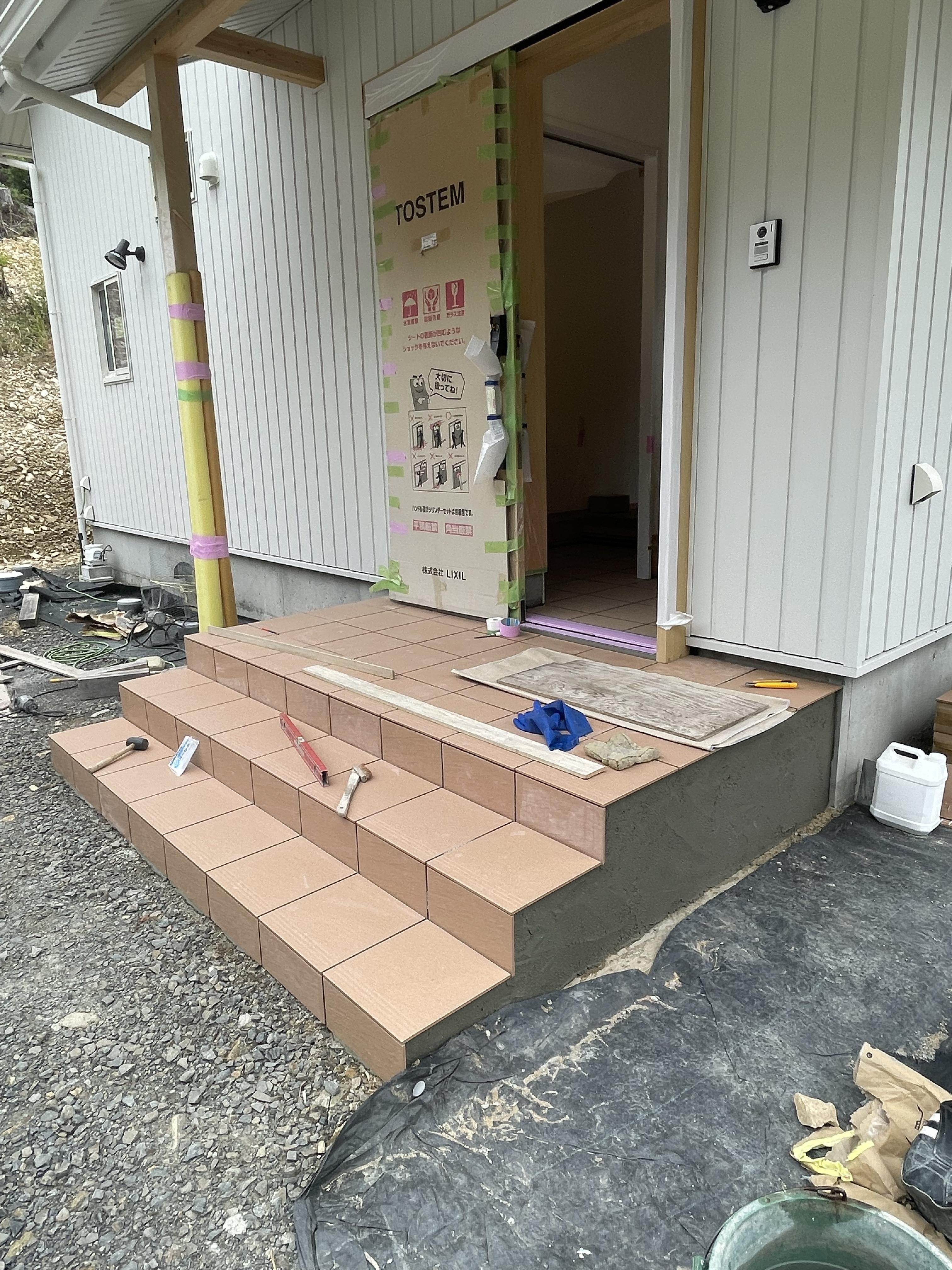 水回り設備も着々と設置され、外部はポーチのタイル施工中です。