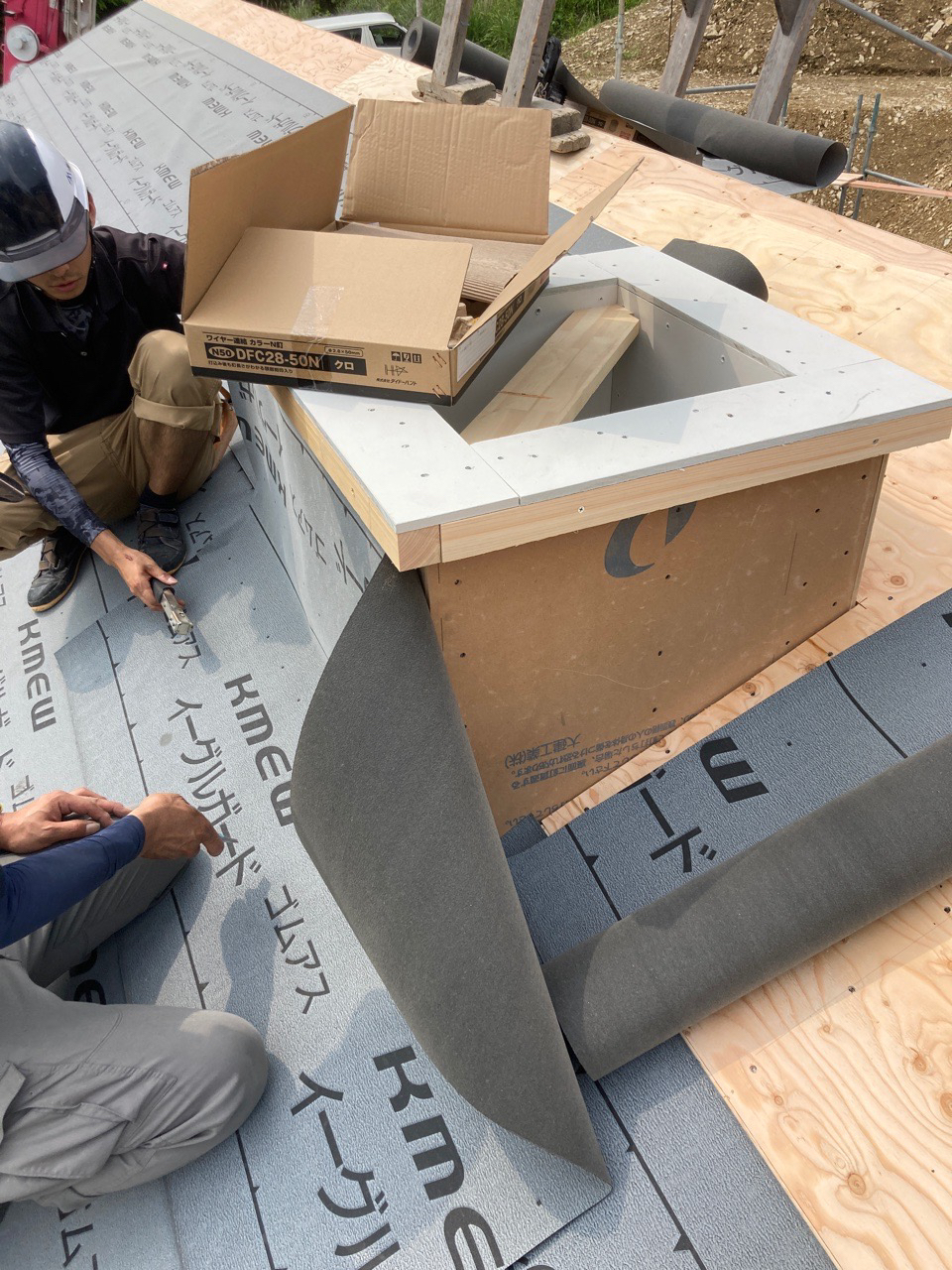 屋根には薪ストーブ用の煙突があり、そちらにもしっかりルーフィングが施されました。薪ストーブはリビング内に設置されます。厳しい冬も、吹抜から広々とした2階ホールへ柔らかな熱を運んでくれそうです。