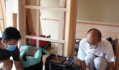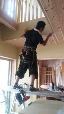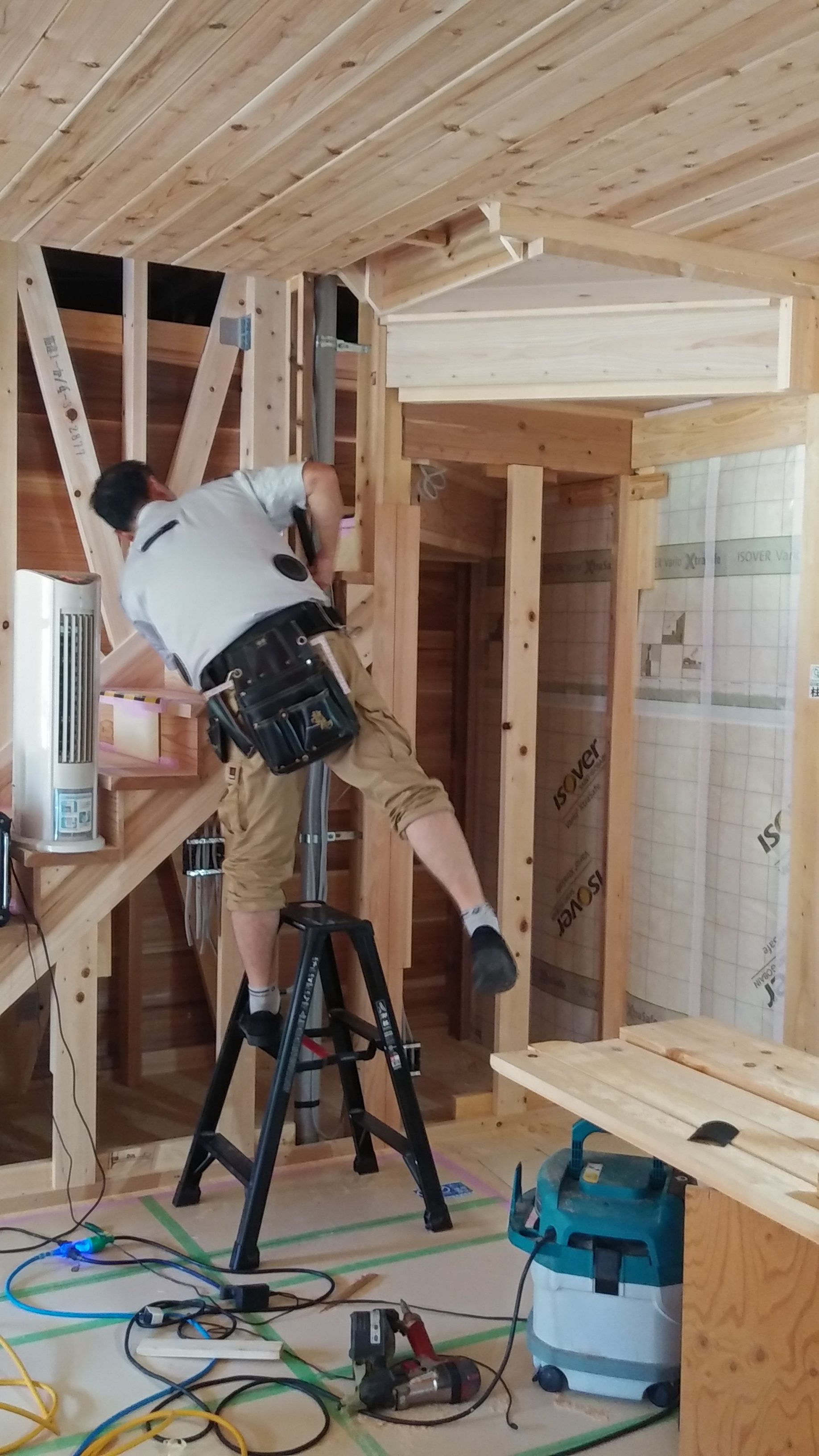 2020.09.08左の写真は棟梁のI井さん、階段下の天井を作ろうとしている写真と、真ん中の写真は天井の枠が出来た写真です。棟梁の丁寧な性格が家のモノ作り的な所にも反映してるような気がします。右の写真はいつもにこにこの大工のK田君ですが、一旦作業に入ると真剣な眼差しでやっております。