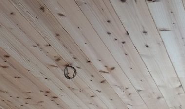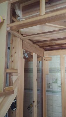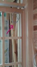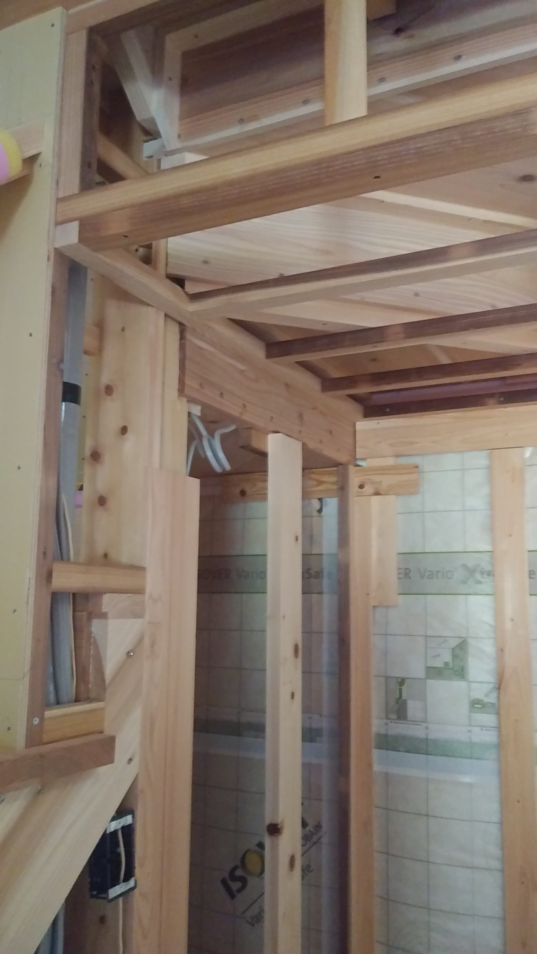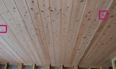 こちらは写真ではわかりづらいかと思いますが、天井の杉羽目板です。左側の写真はシーリングライトの照明がつく予定で配線がでております。中央の写真はダウンライトが天井に付く予定(赤の四角で囲ってある)で後からダウンライト取り付けの為の穴加工がされます。右側の写真はブラケットといって壁につける照明になります。こうやって照明にも種類があり、壁や天井が貼られてしまうと後から変更が難しいので、配線する位置(配線取り出し位置)を決めていただいております。照明もたくさんのデザインもあり光の色や光量など、生活パターンやご年齢等に合わせて配当するのでこちらも、お施主様との大事な打ち合わせでもあり、私的にはわくわくする打ち合わせの一つです。なぜなら照明1つでお部屋の雰囲気も、生活に潤いも出てくる事があると思ってるからです☺