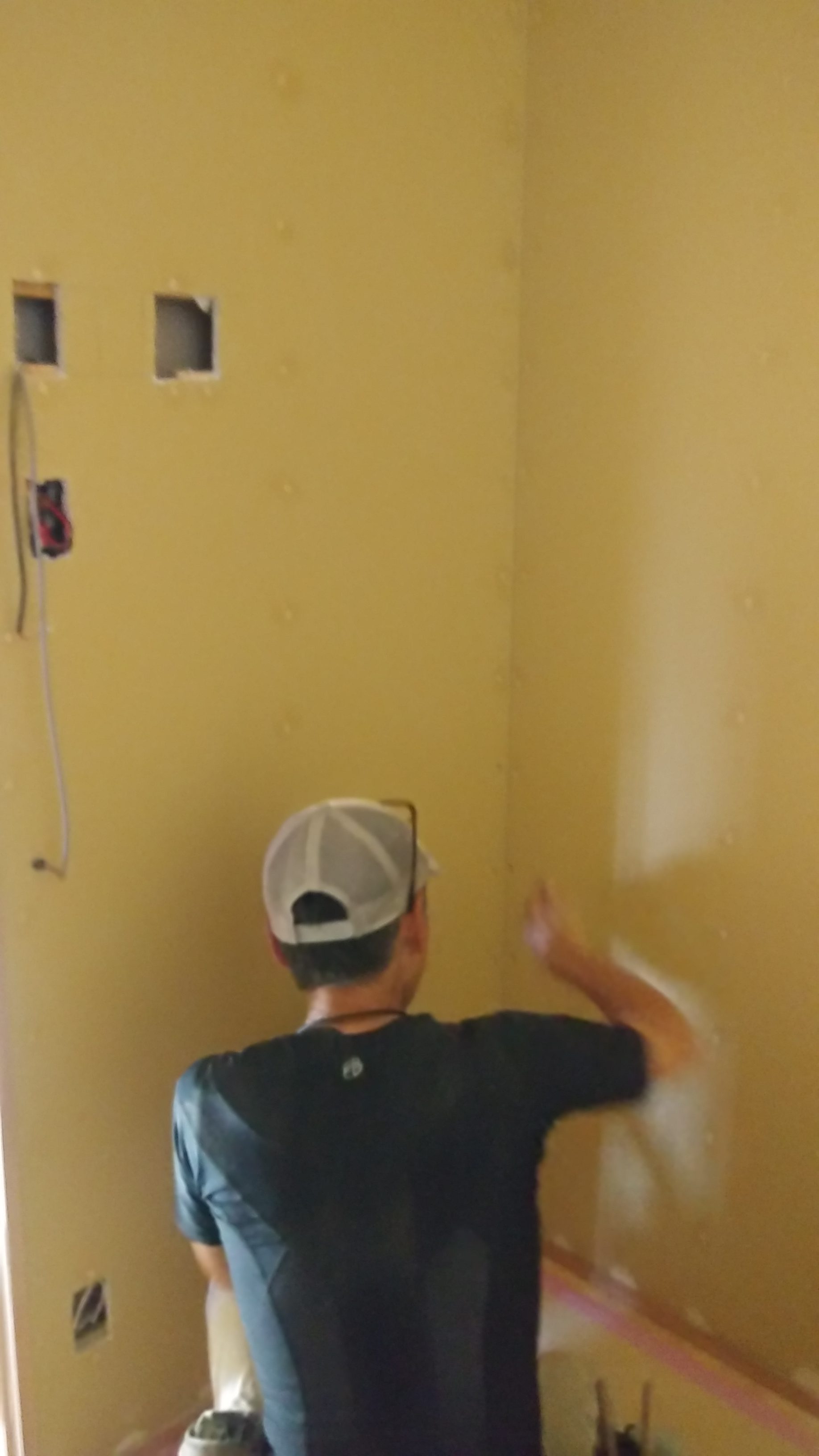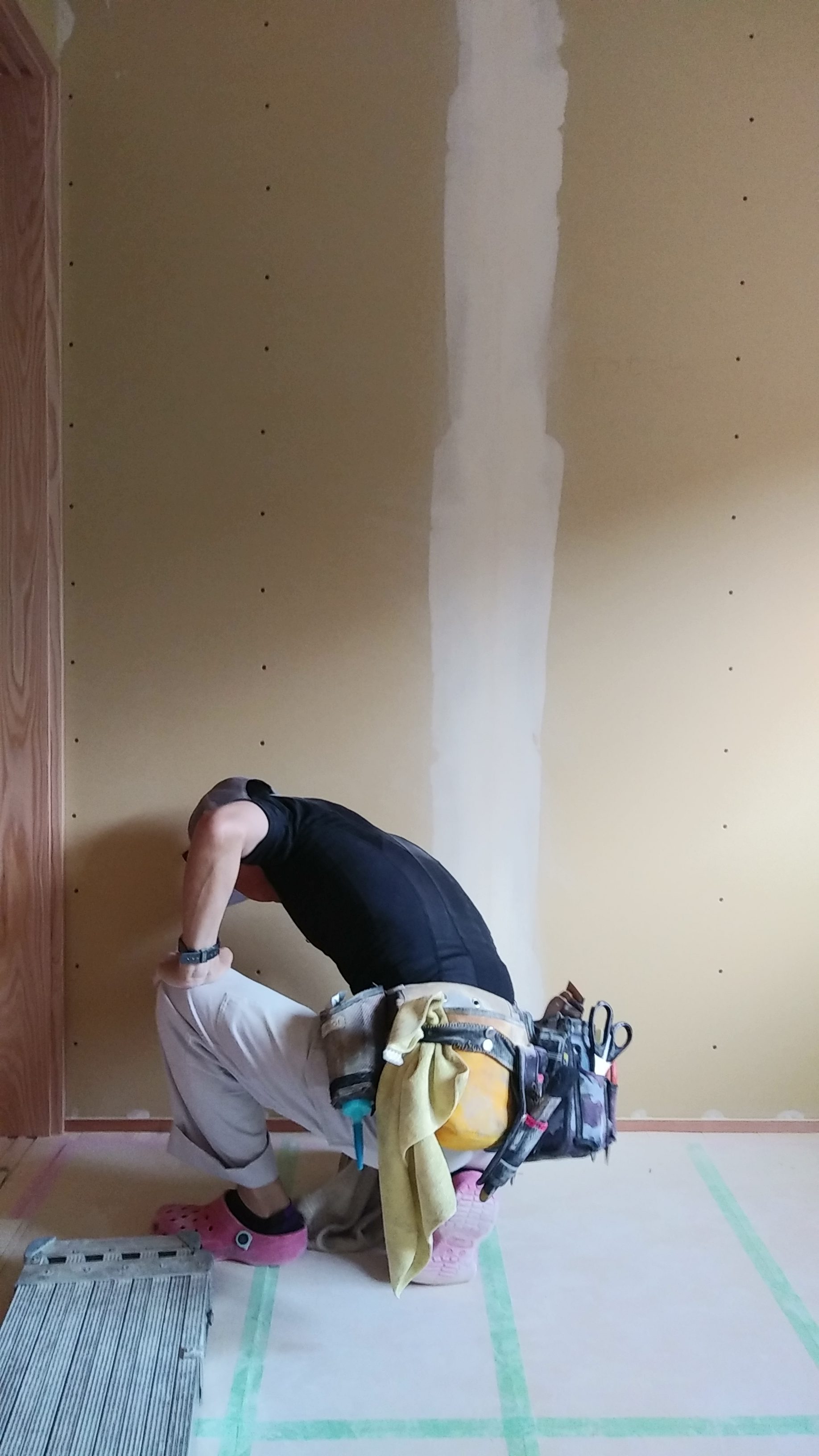 2020.10.02 今回はクロス工事の現場です。左の写真はクロスを貼った時に凹凸ができないように、釘にパテを埋めて平滑にする作業になります。右の写真はプラスターボードのつなぎ目の段差をなくすためにパテを塗って平滑にする作業になります。こうやって丁寧に下地処理をする事によってキレイなクロスの仕上がりになるのですね。