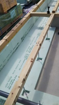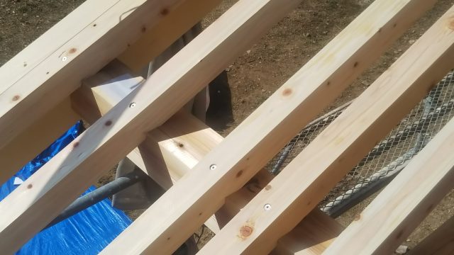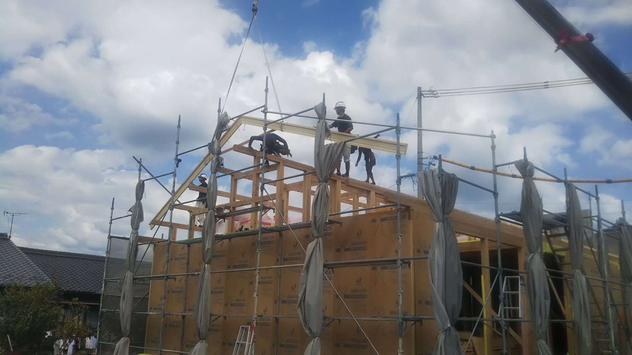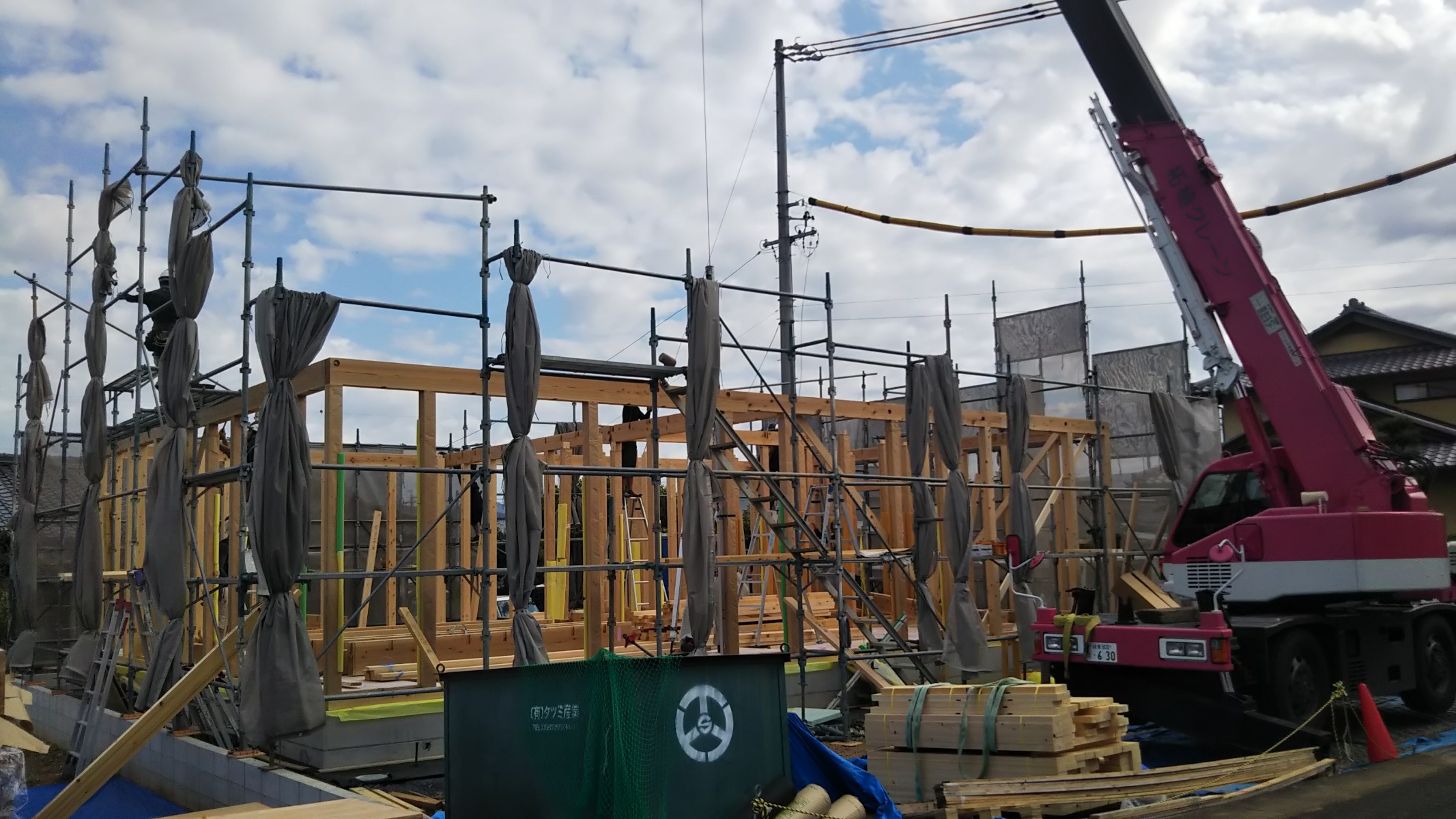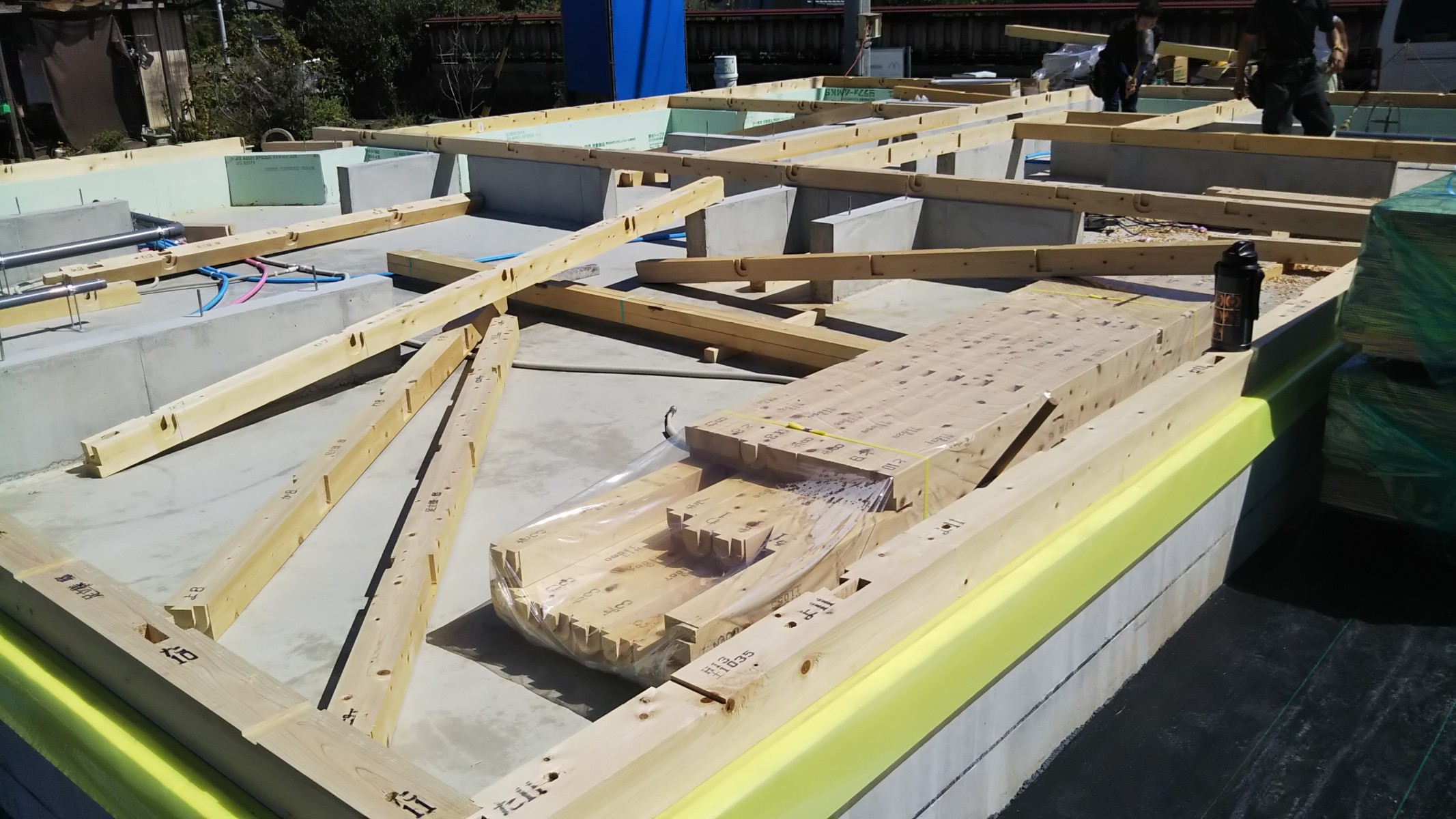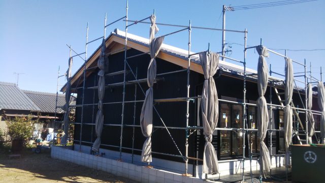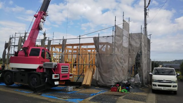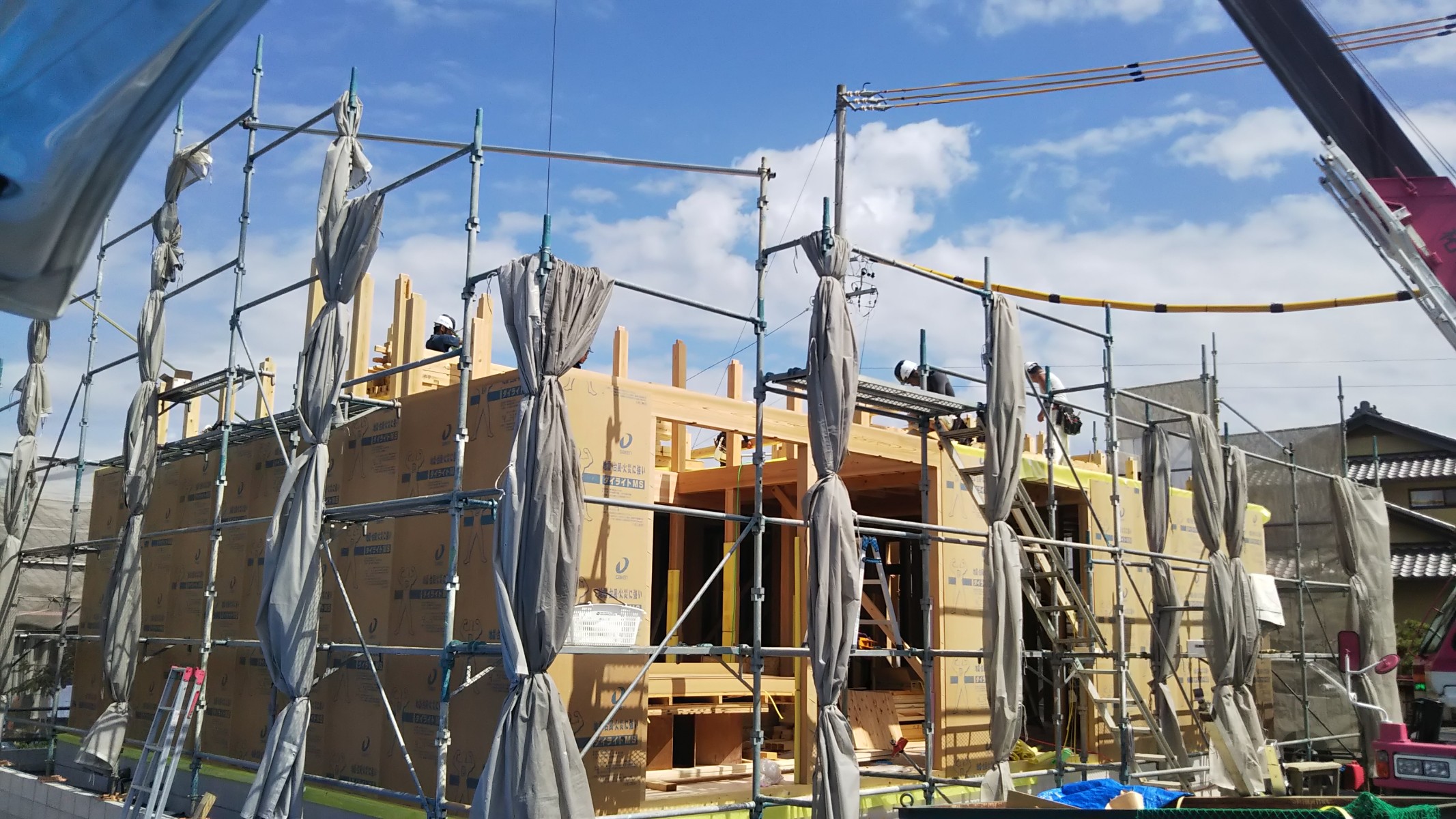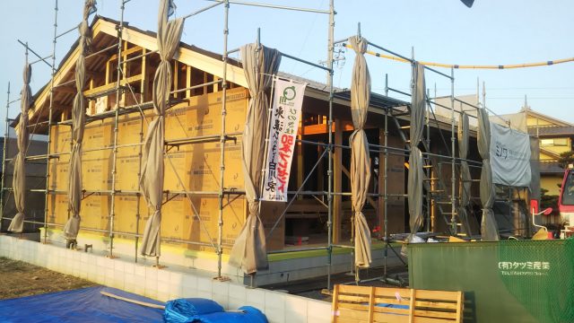 土台伏せ完了。雨にぬれないようにシートを被せます。